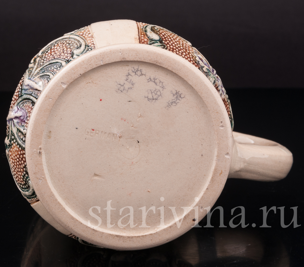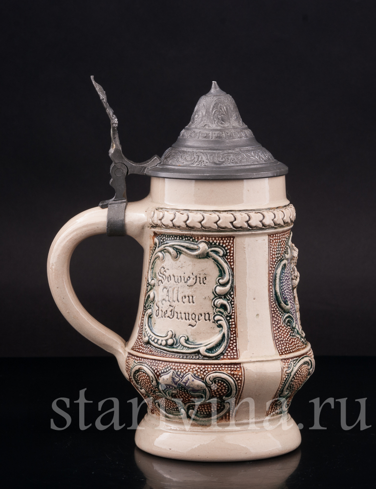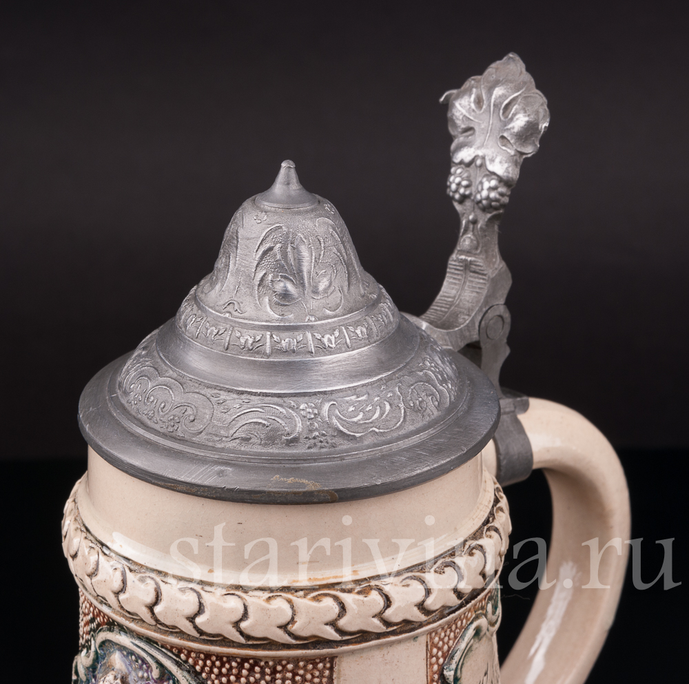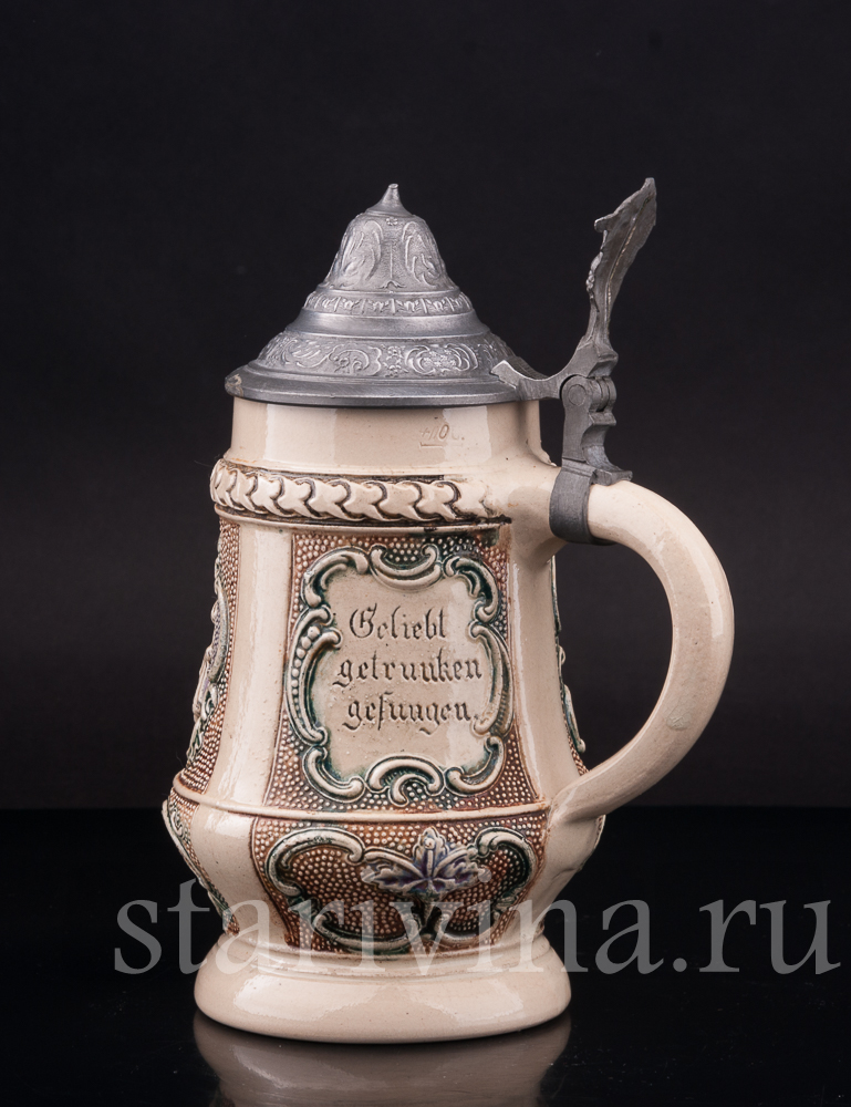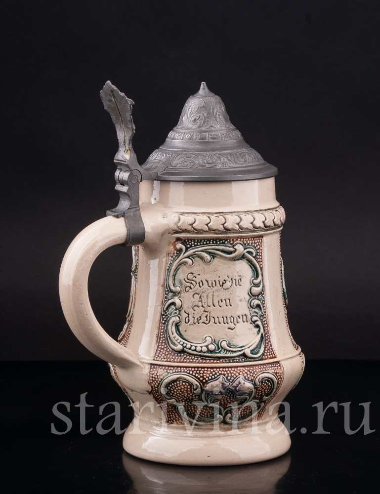 Старинная пивная кружка выполненная в традиционной рельефной технике, расписанная в трехцветной палитре и покрытая соляной глазурью. На кружке в центральном резерве изображена влюблённая пара. Надпись на кружке гласит