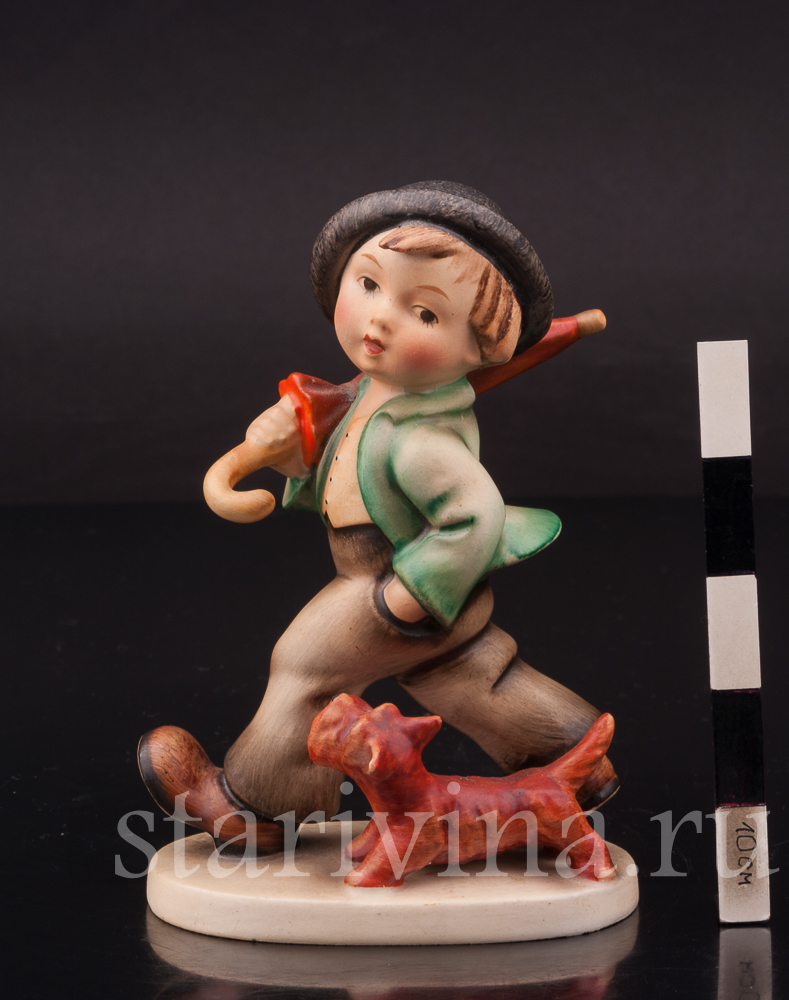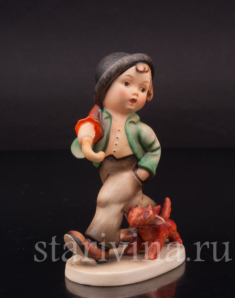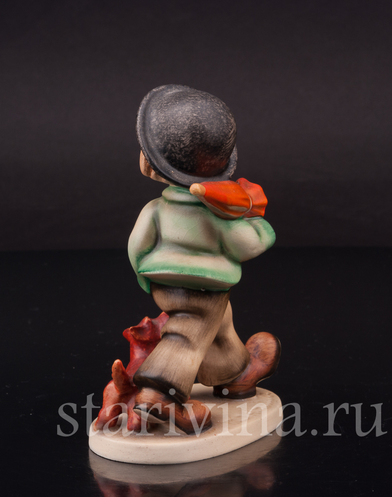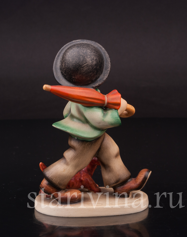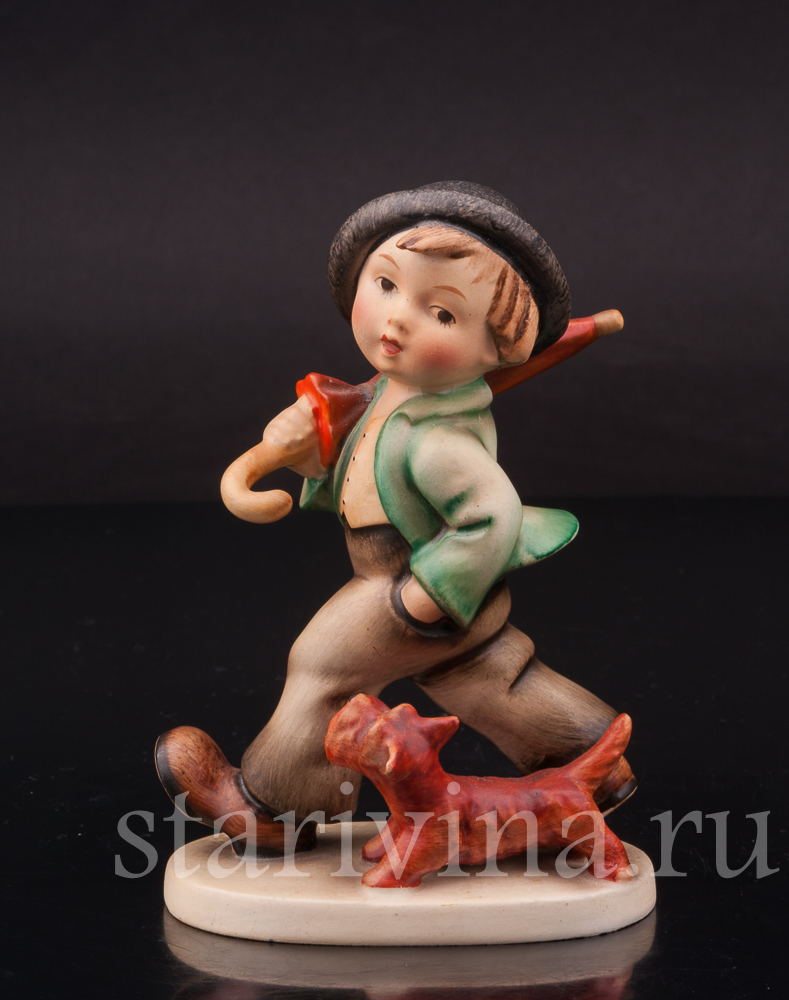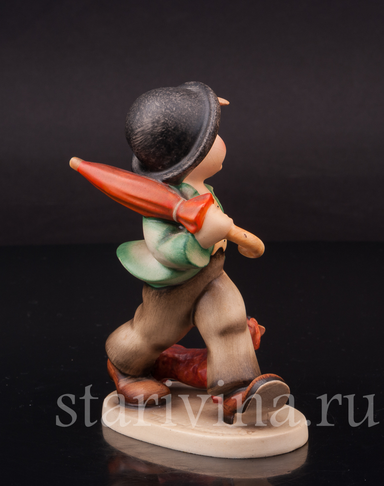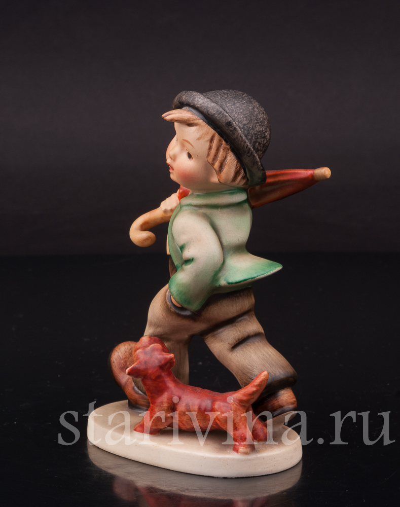 Мальчишка бойко шагает по улице, неся на плече зонт на случай дождя, его сопровождает верный друг - рыжий щенок. Есть в образе мальчишки какое-то очарование детской серьезности. В том, как он держит руку в кармане брюк, как забавно съехала на одно ухо его черная шляпа. Роспись фигуры выполнена узнаваемыми хуммелевскими теплыми оттенками красок, придающими особую уютность сюжету.