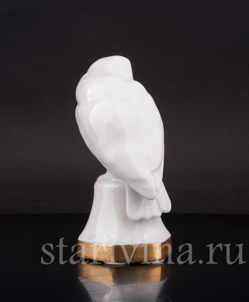 На белом шестигранном постаменте, окрашенном по низу полосой позолоты, сидит сова. Птица слегка наклонила голову, вглядываясь внимательно куда-то своими пронзительными глазами. Ее тонкие золотые лапки крепко вцепились в постамент. Фигура выполнена в белом фарфоре, лишь некоторые детали, глаза, клюв, лапы птицы окрашены золотом, что характерно для фарфора периода ар деко.