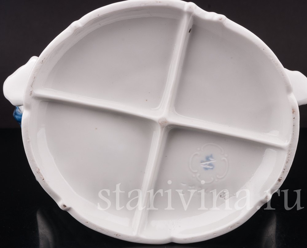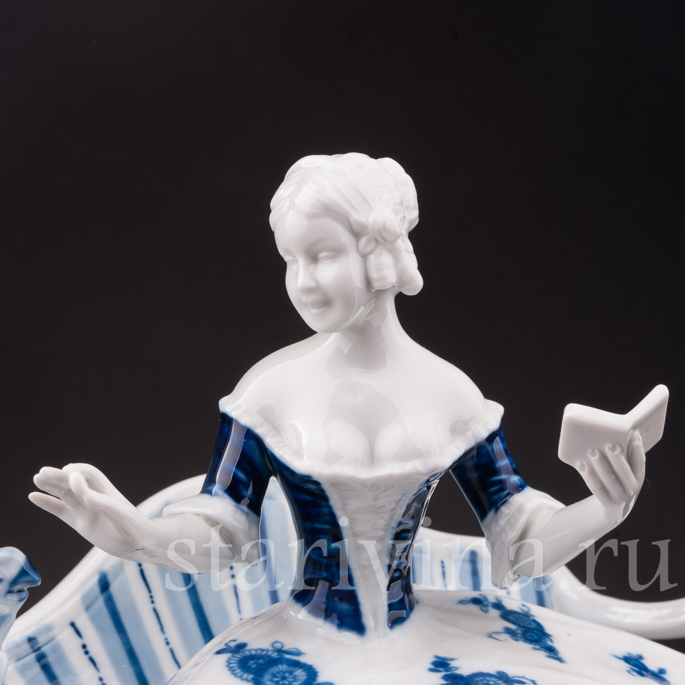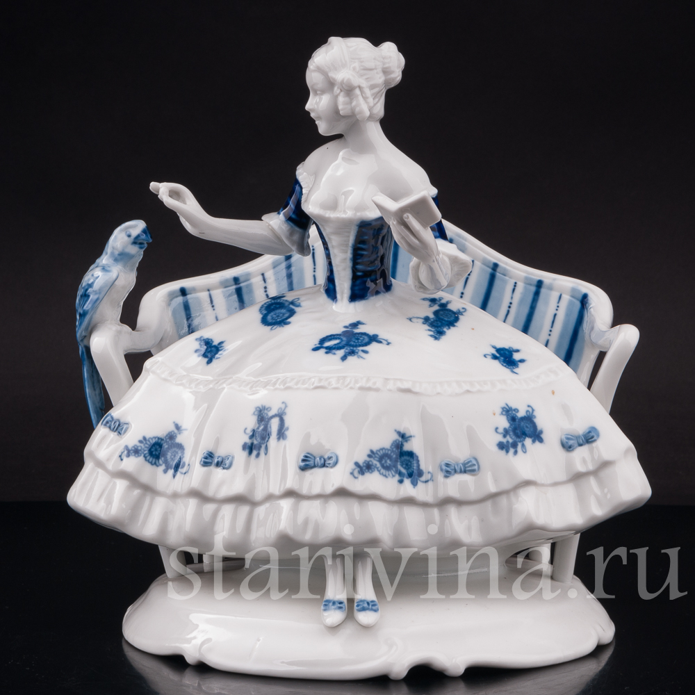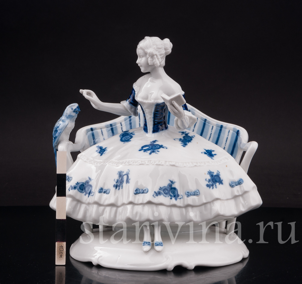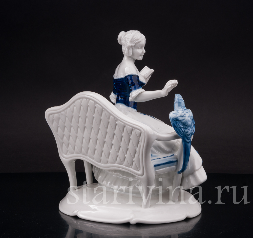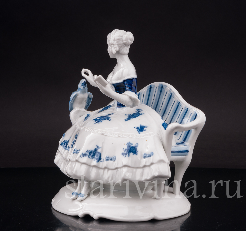 Композиции с девушками и домашними попугаями - популярный сюжет, использовавшийся у многих фабрик в тех или иных вариациях. Сочетание нежности, камерности и некой нотки экзотичности придает таким предметам особое очарование. Композиция выполнена в монохромной росписи, сочетание белого фарфора и оттенков синего подглазурного кобальта смотрится стильно и со вкусом. Изящная роспись подчеркивает хрупкую фигуру девушки, отвлекшейся от чтения книги и угощающей лакомством своего попугая.