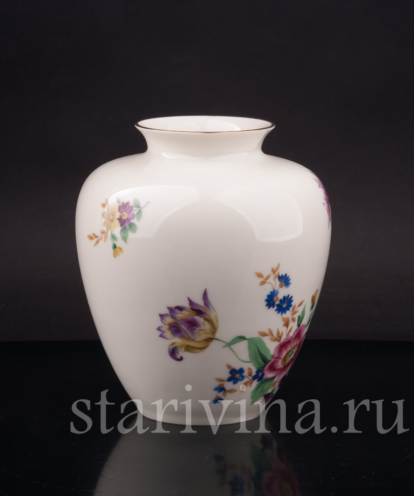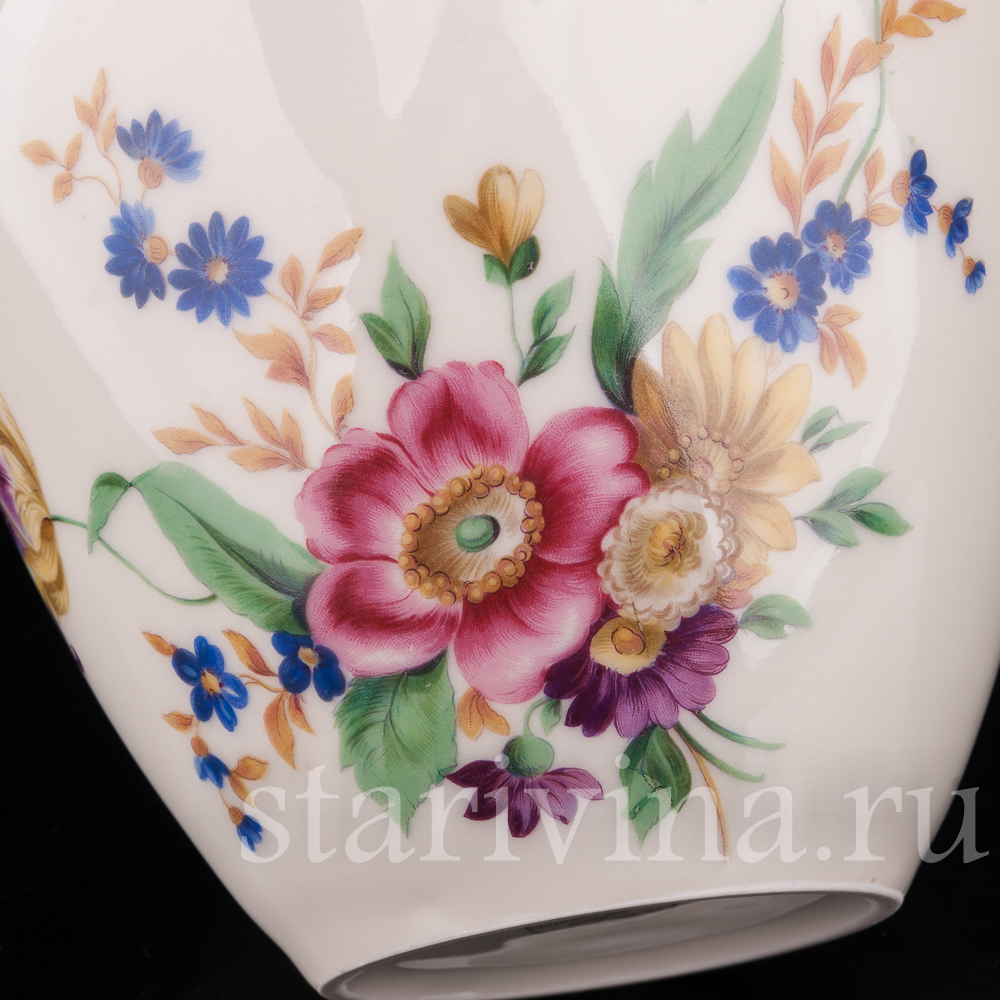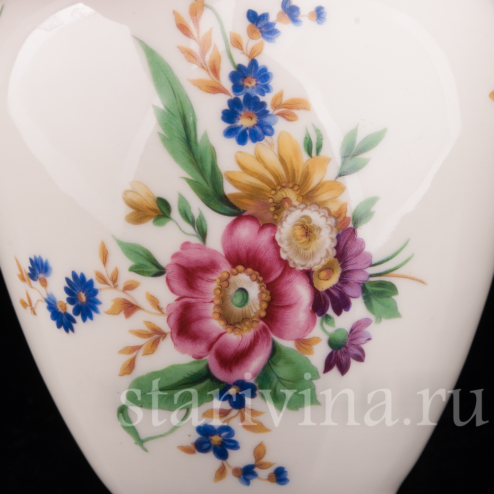 Фарфоровая ваза с цветочной росписью выполнена на одной из крупнейших немецких мануфактур 20 века - фабрике Хученройтера. Помимо статуэток, на этой фабрике выпускались разнообразные предметы декора и сервировки.