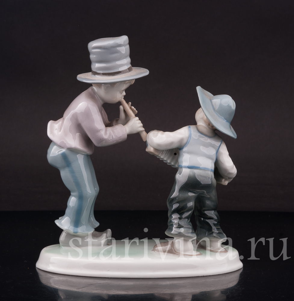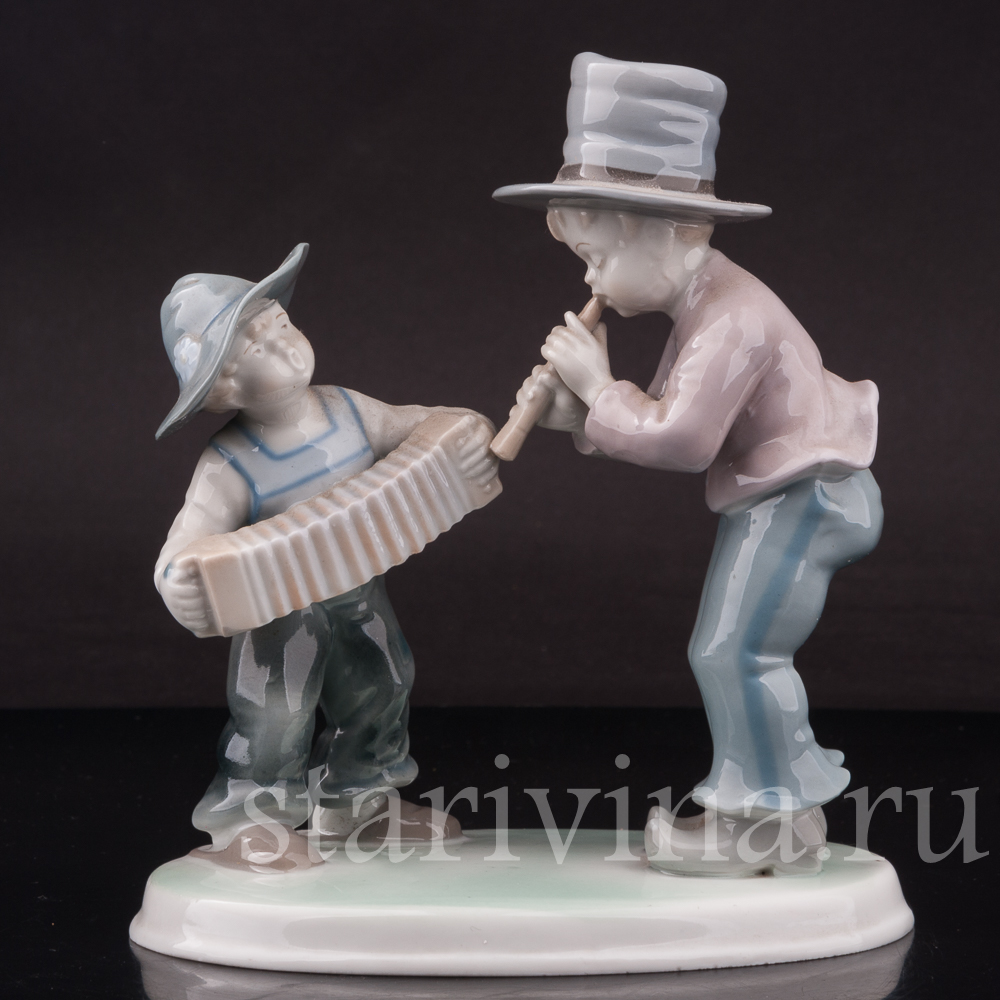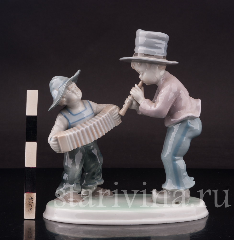 Небольшая забавная фигурка, изображающая двух мальчиков, играющих на музыкальных инструментах. Тот, что постарше и повыше в высокой шляпе-цилиндре держит в руках флейту, а младший лихо растягивает меха у гармошки и громко поёт.