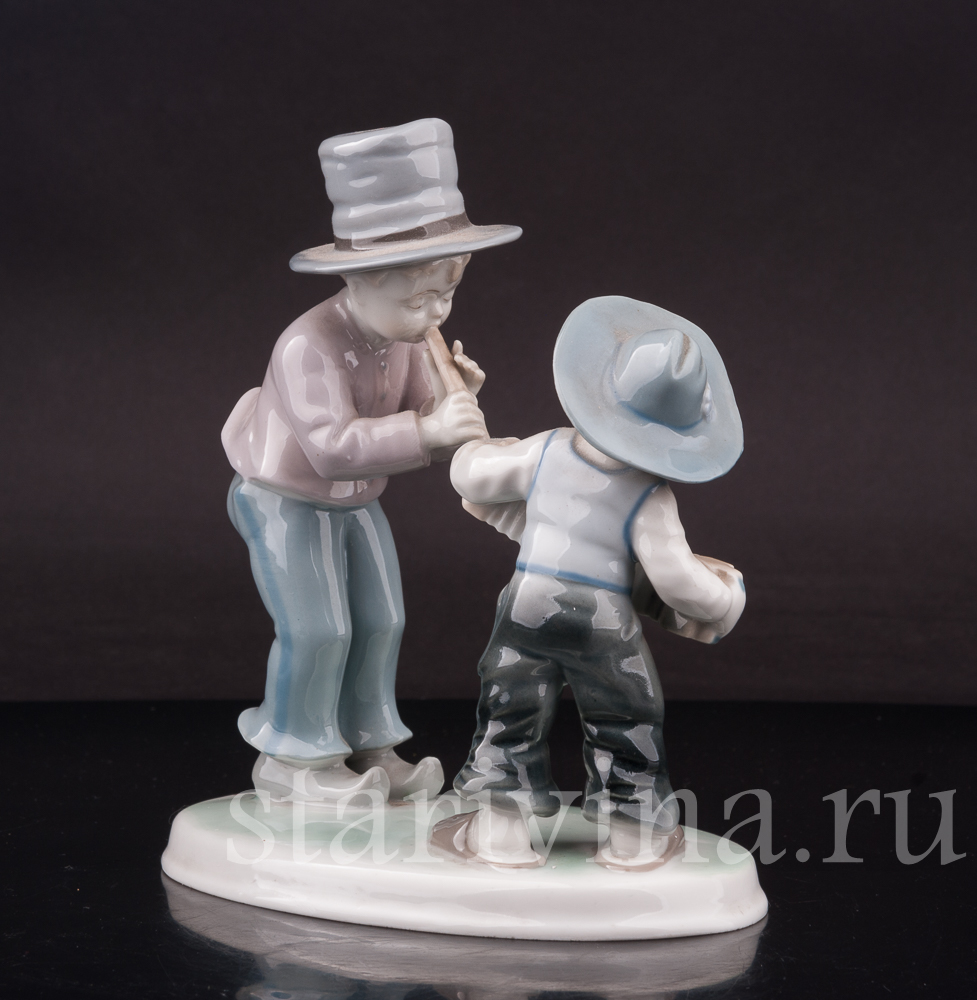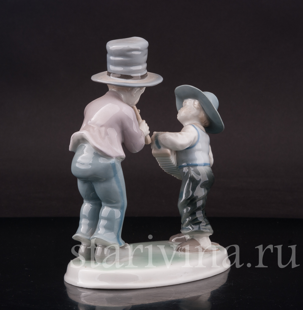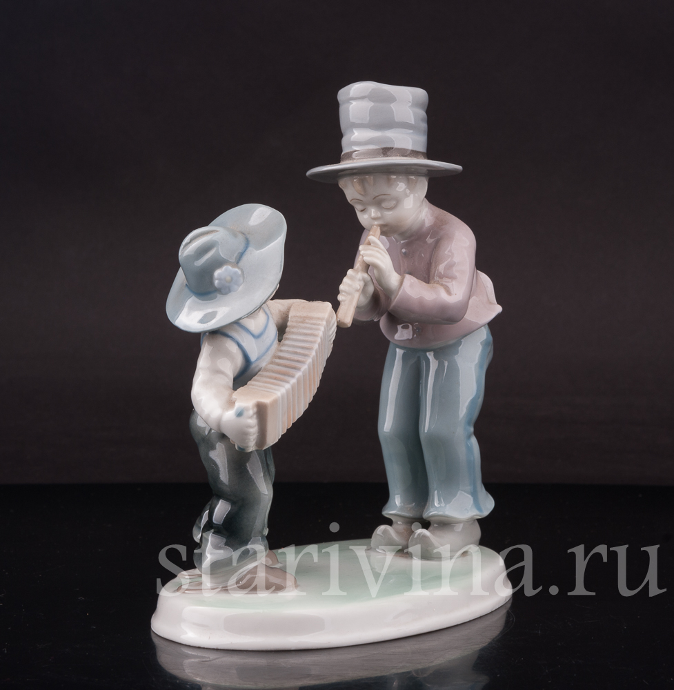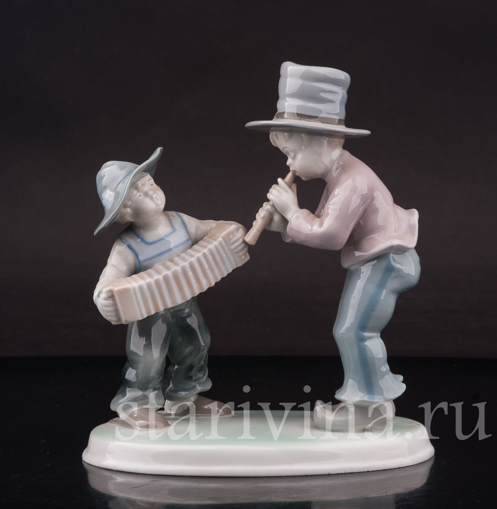 Небольшая забавная фигурка, изображающая двух мальчиков, играющих на музыкальных инструментах. Тот, что постарше и повыше в высокой шляпе-цилиндре держит в руках флейту, а младший лихо растягивает меха у гармошки и громко поёт.