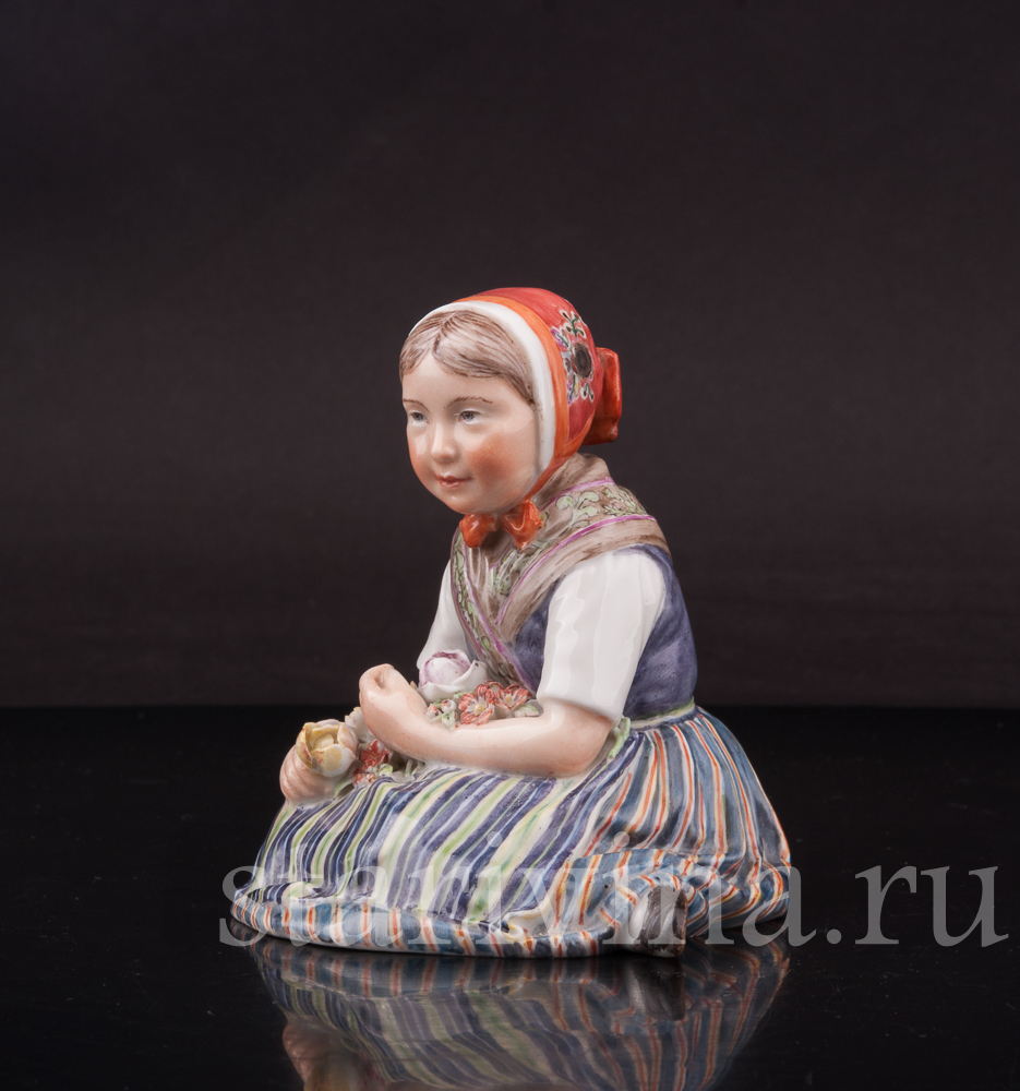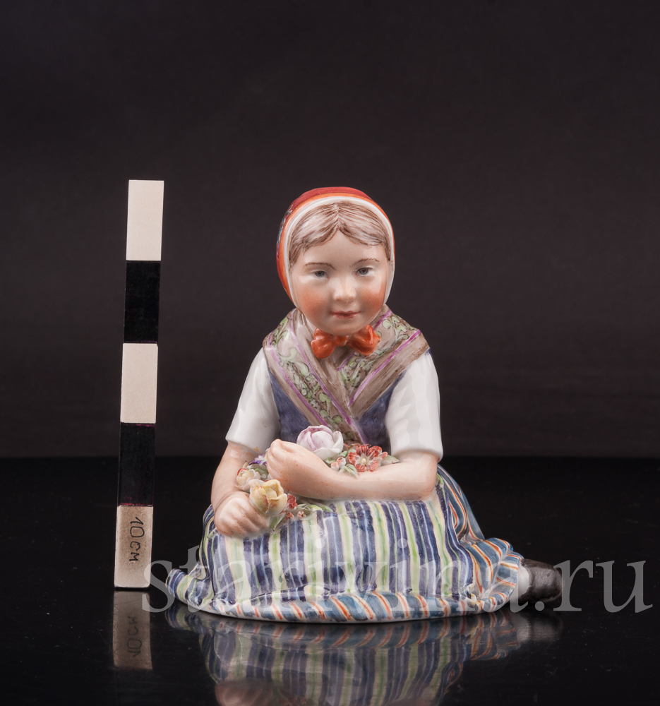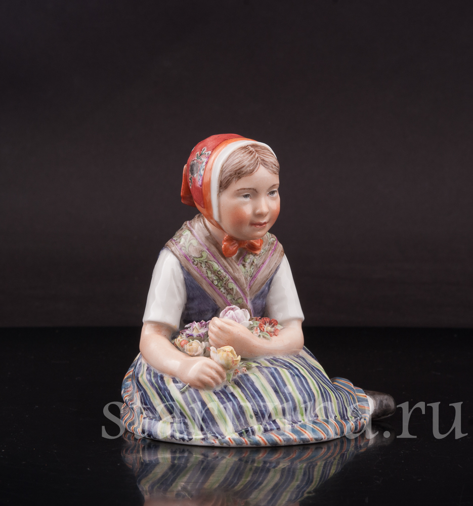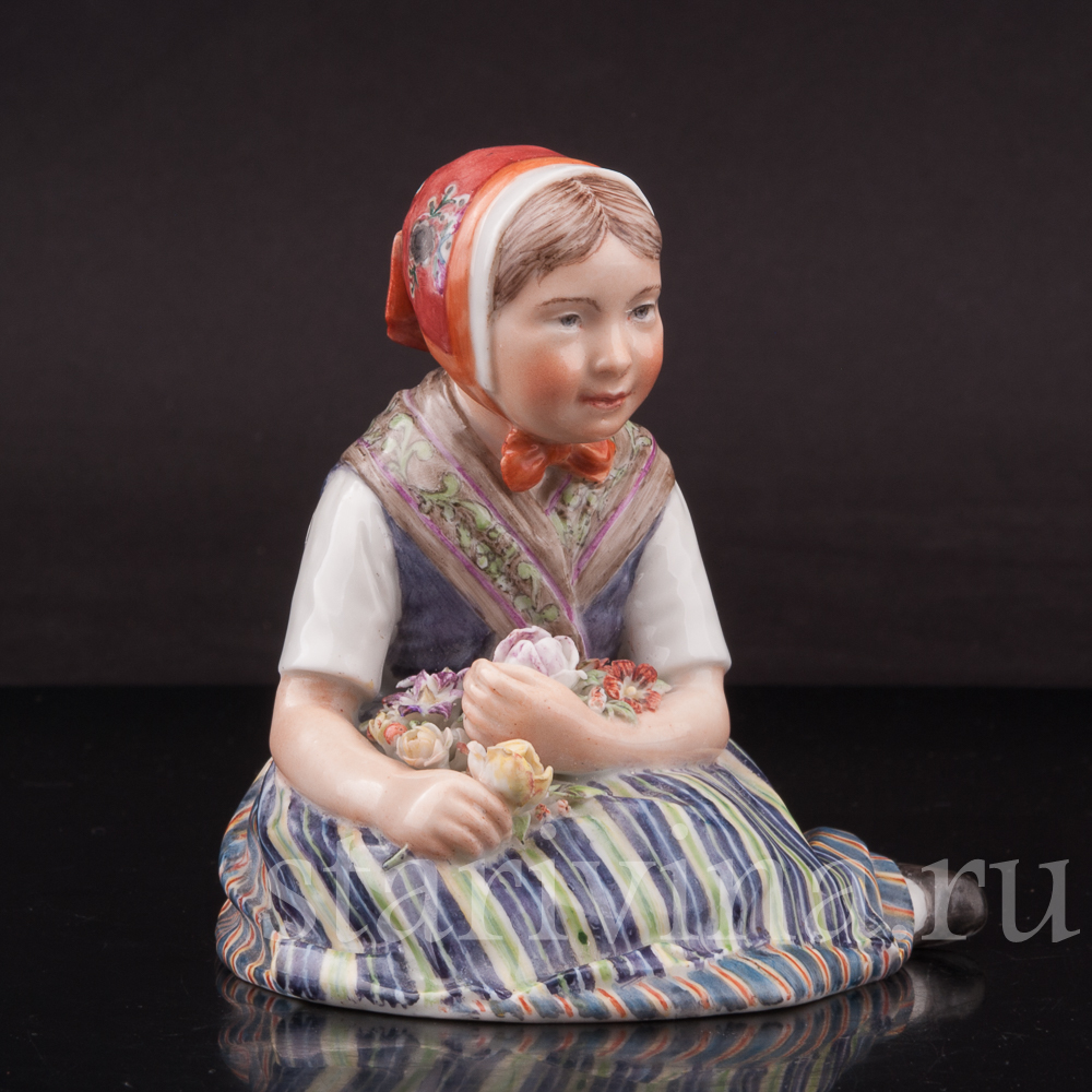 Коллекционная датская статуэтка девочки из Шлезвига создана на фабрике Royal Copenhagen и относится к редкой и очень интересной серии детей из разных датских районов. Серия детей в национальных костюмах была создана в 1923 году к празднованию годовщины свадьбы короля Кристиана X и королевы Александры.мФигура девочки выполнена в нетипичной для датского фарфора манере с надглазурной росписью. Миниатюрные цветы в руках у девочки, тонкая прорисовка узоров на тканях ее одежды, довольно яркие краски - эти признаки явно выделяют эту серию из других датских фигур. Такие статуэтки детей встречаются все реже, собрать коллекцию датских детей в национальных костюмах по-настоящему интересная задача для коллекционера.