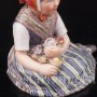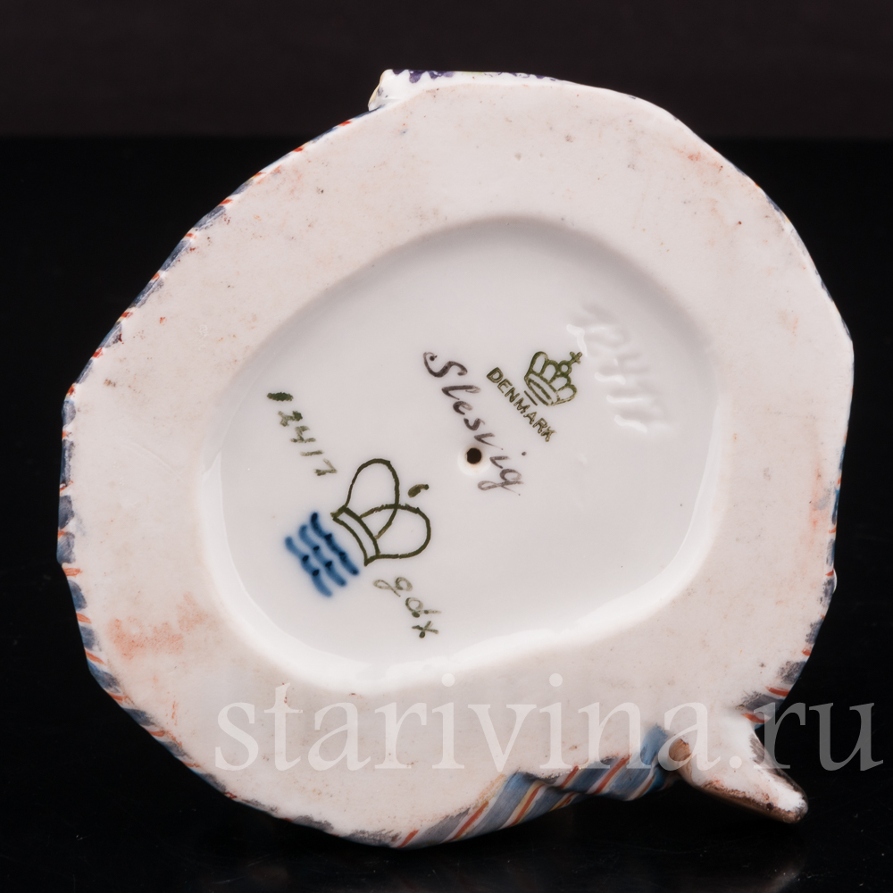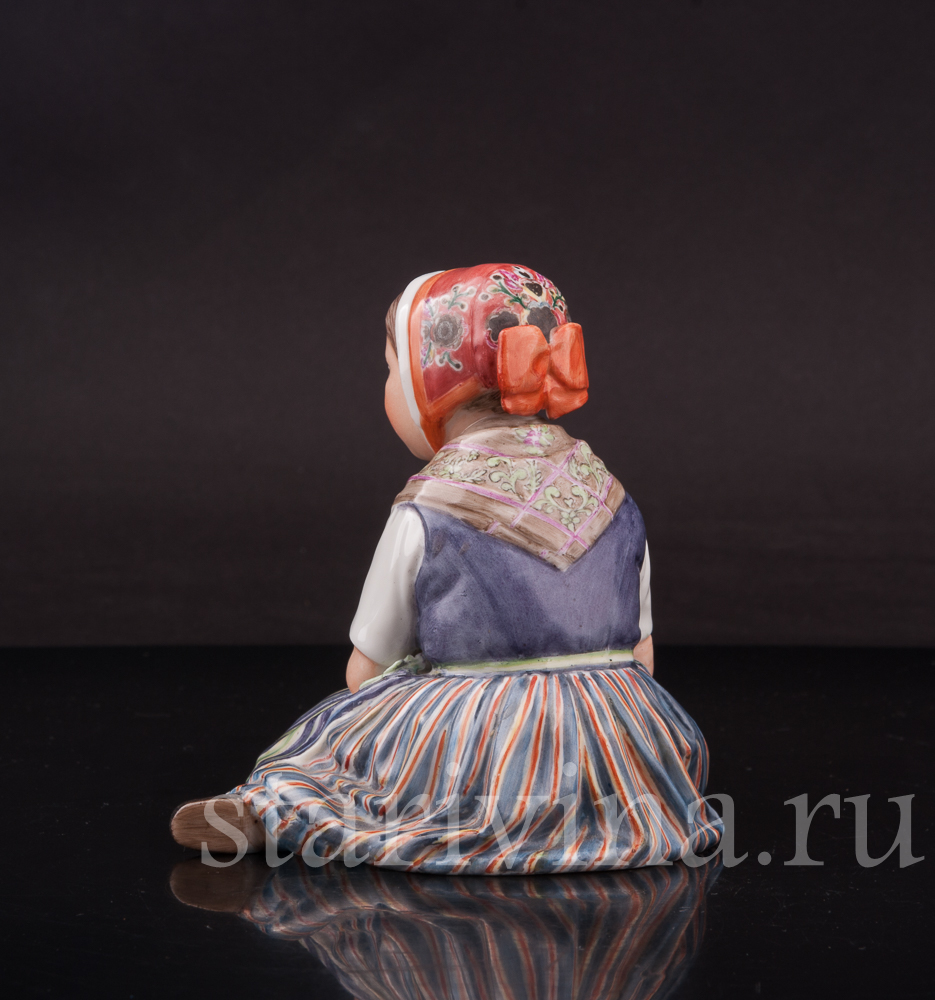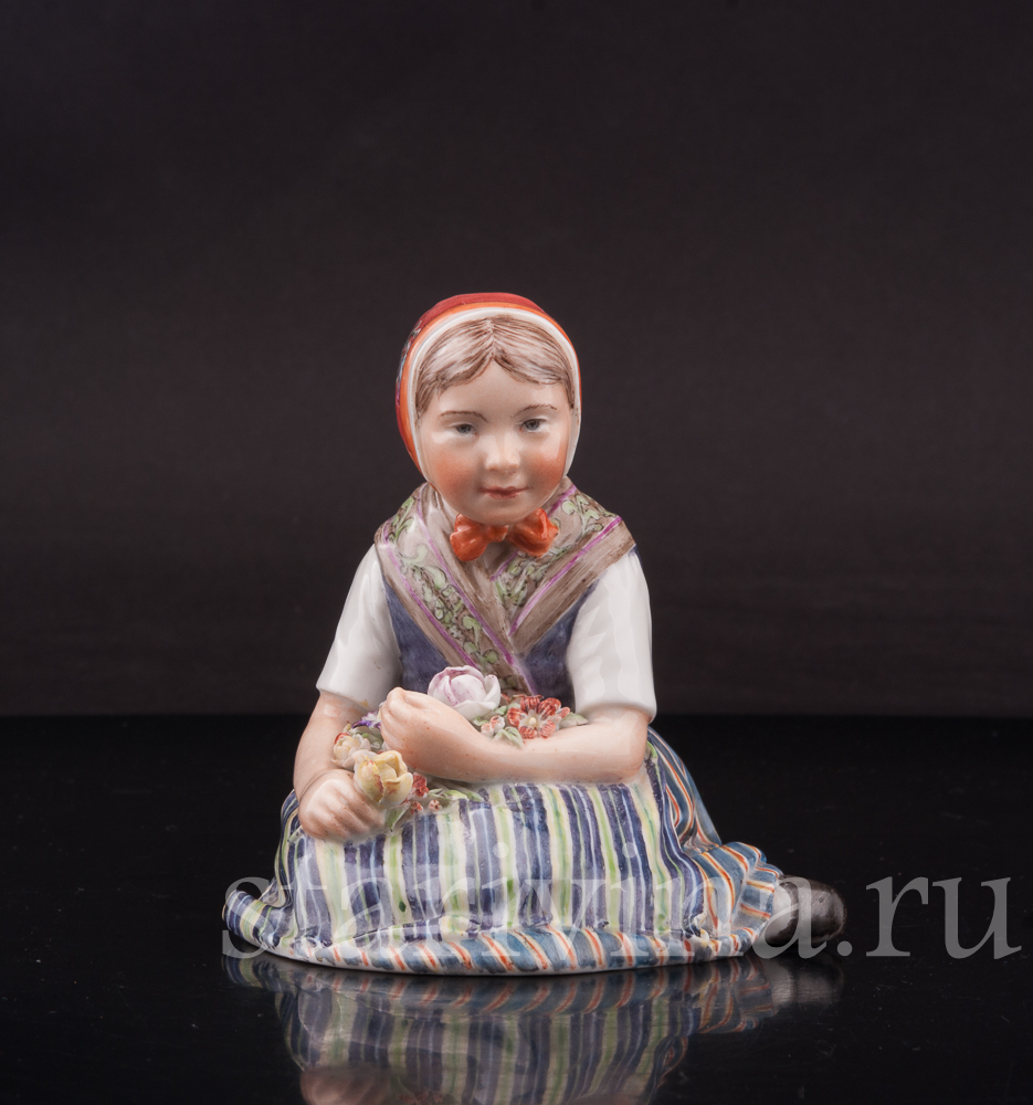 Коллекционная датская статуэтка девочки из Шлезвига создана на фабрике Royal Copenhagen и относится к редкой и очень интересной серии детей из разных датских районов. Серия детей в национальных костюмах была создана в 1923 году к празднованию годовщины свадьбы короля Кристиана X и королевы Александры.мФигура девочки выполнена в нетипичной для датского фарфора манере с надглазурной росписью. Миниатюрные цветы в руках у девочки, тонкая прорисовка узоров на тканях ее одежды, довольно яркие краски - эти признаки явно выделяют эту серию из других датских фигур. Такие статуэтки детей встречаются все реже, собрать коллекцию датских детей в национальных костюмах по-настоящему интересная задача для коллекционера.