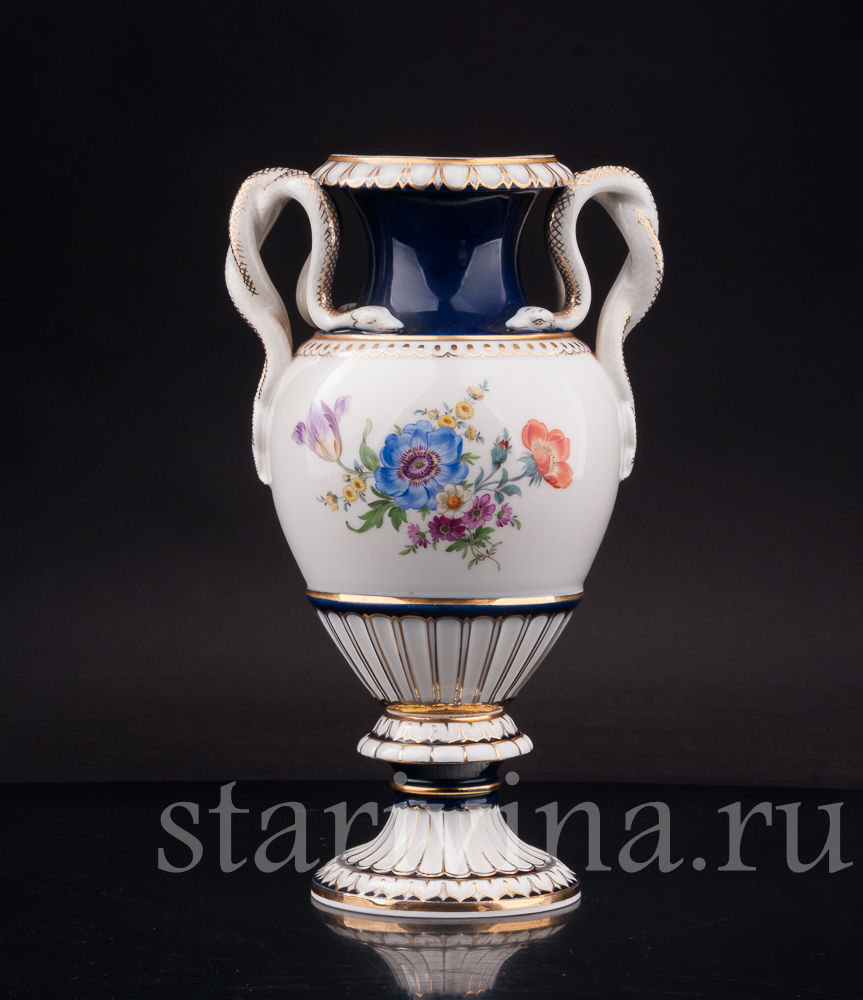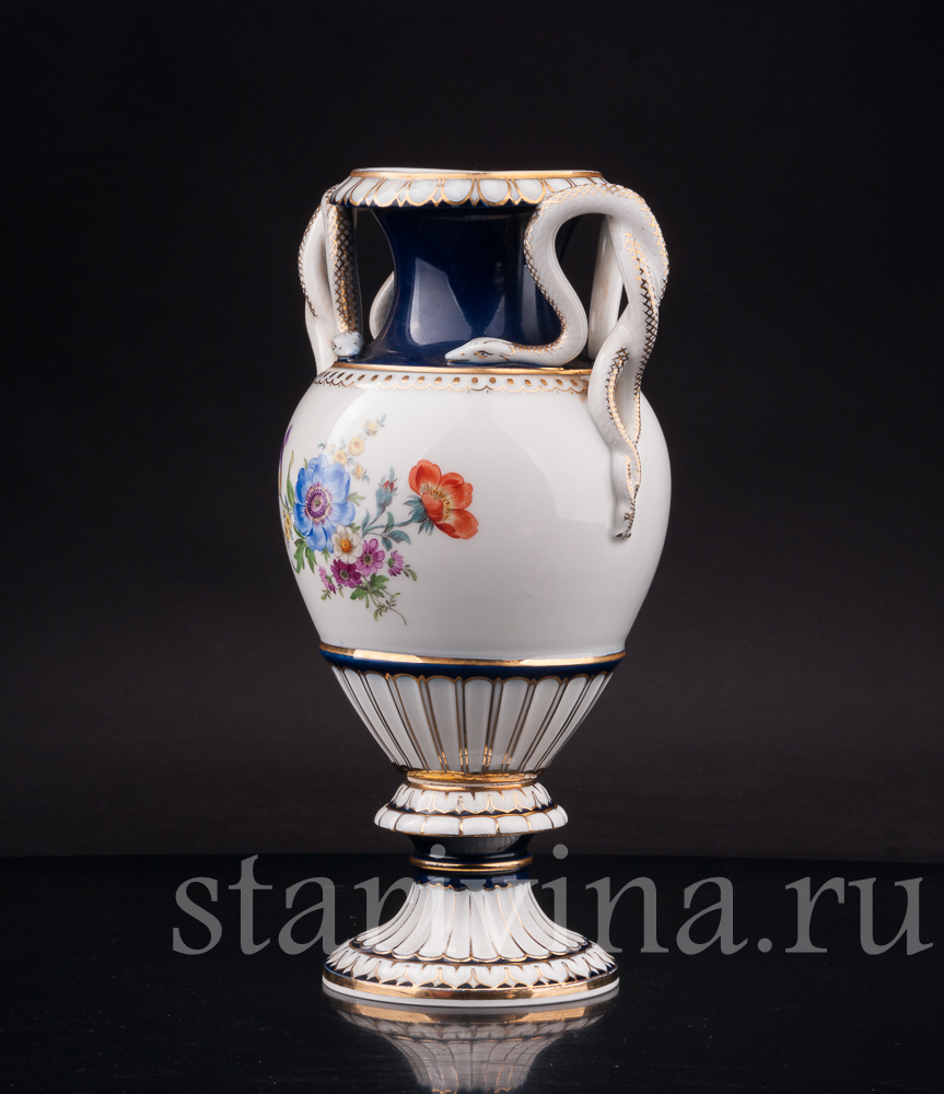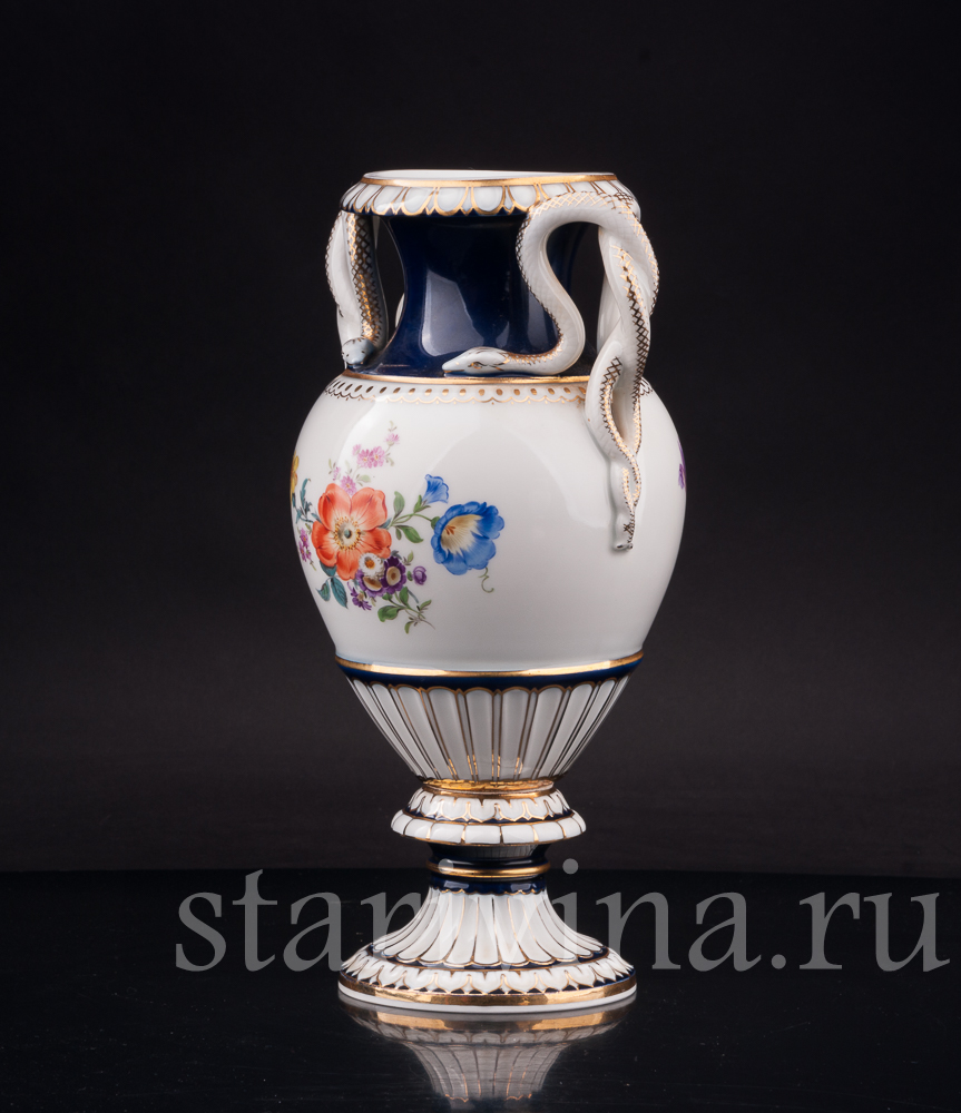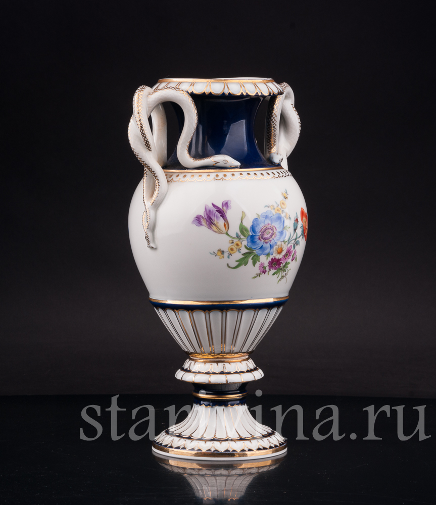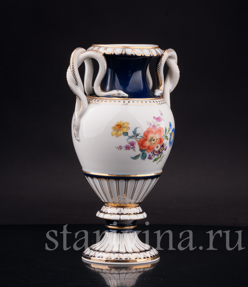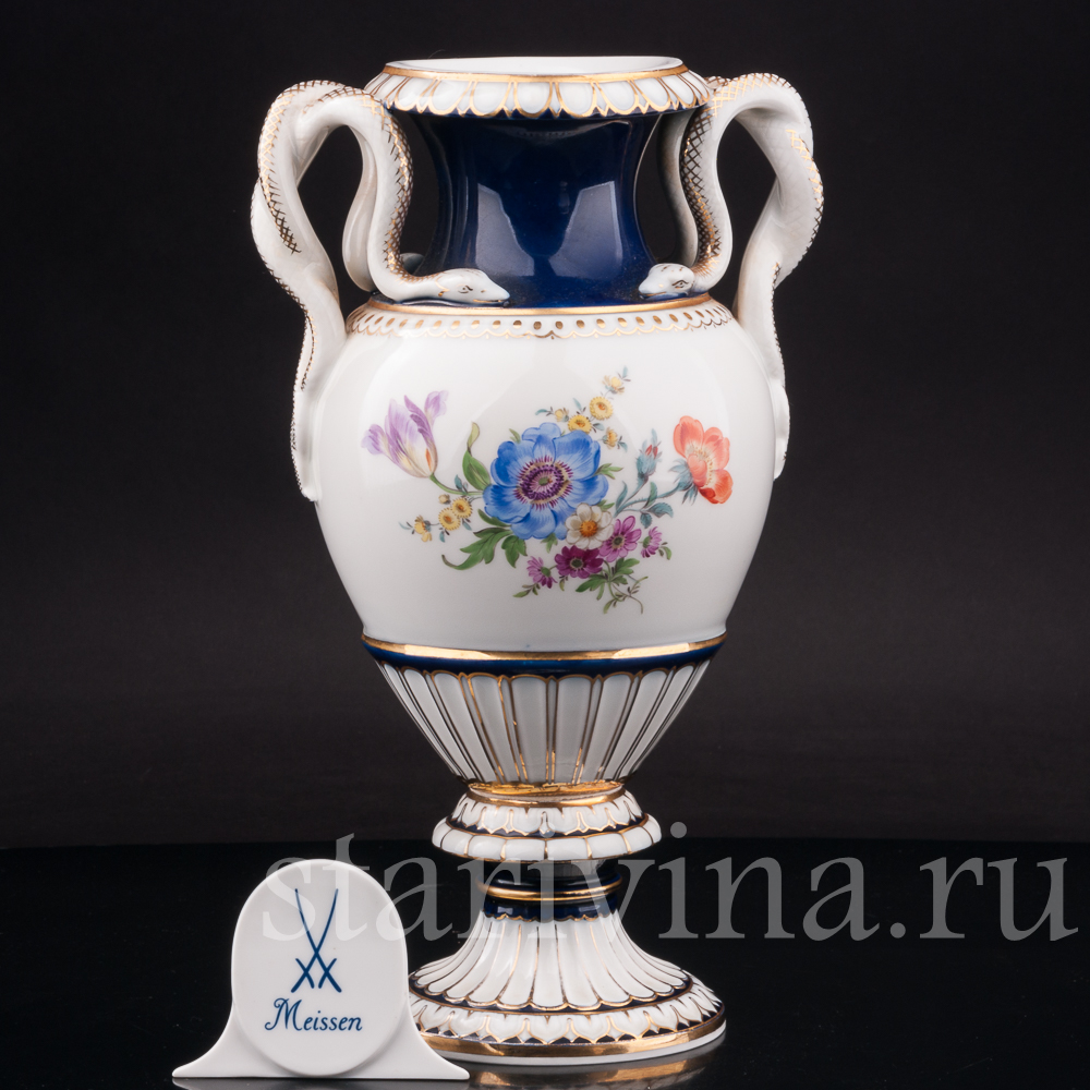 Классическая мейсенская ваза в стиле ампир с ручками, выполненными в виде переплетенных змей. Данная модель вазы, повторяющая античные амфоры, была разработана в середине 19 века Эрнстом Августом Лейтерицем и стала одной из знаковых моделей фабрики Meissen. Сам Лейтериц оказал сильное влияние на стиль и формат изделий фабрики, разработал новые приёмы росписи, придав им уникальный вид.