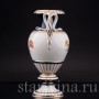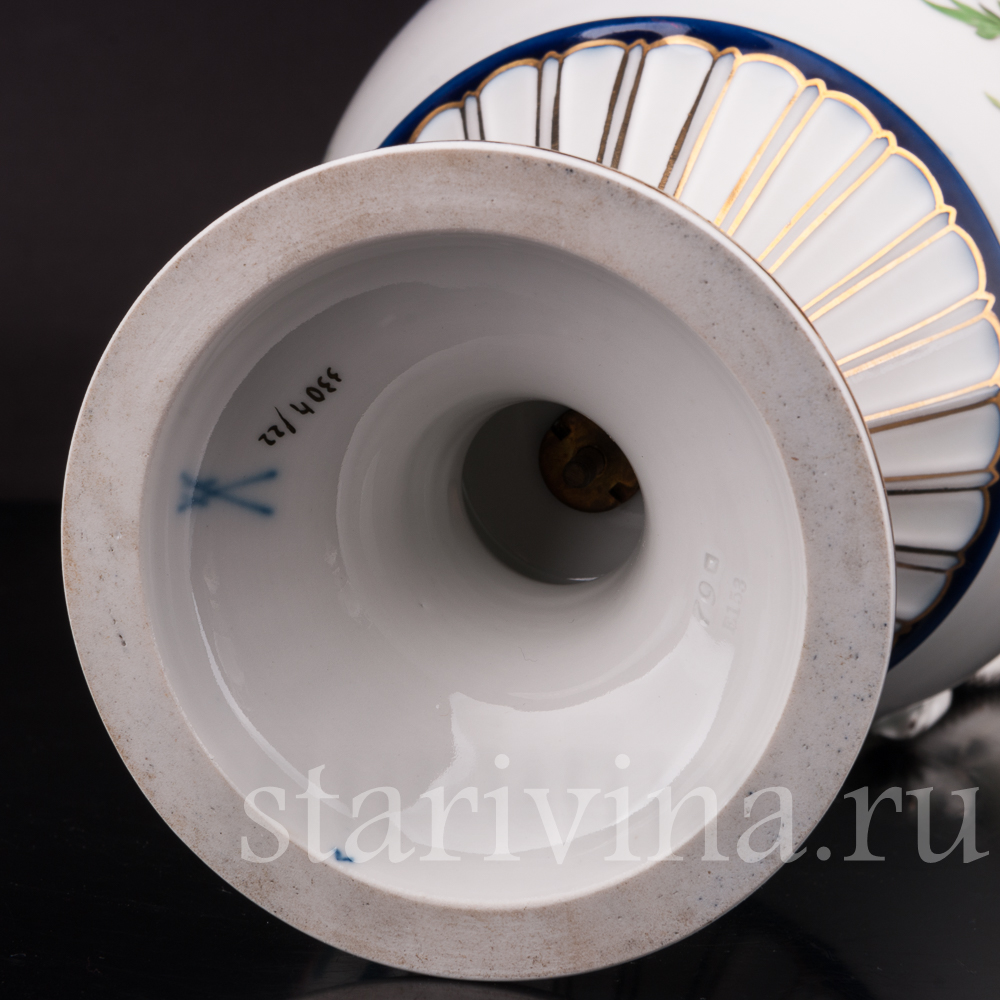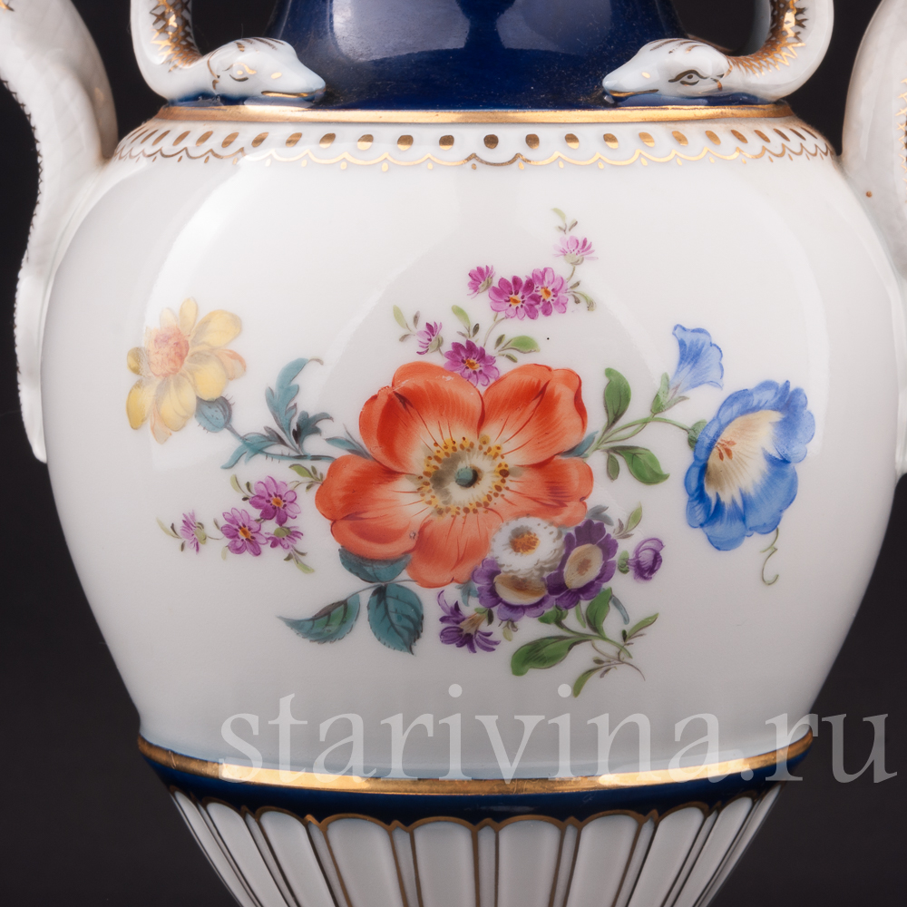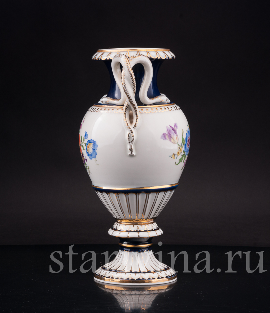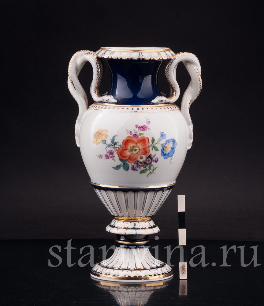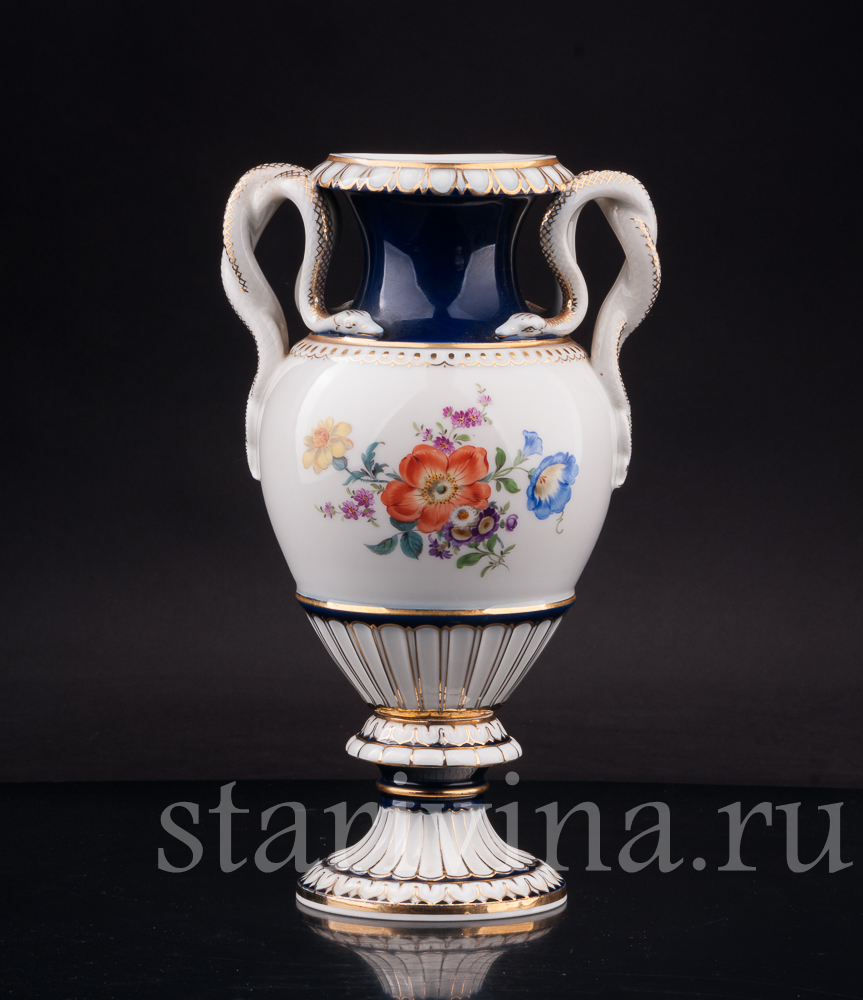 Классическая мейсенская ваза в стиле ампир с ручками, выполненными в виде переплетенных змей. Данная модель вазы, повторяющая античные амфоры, была разработана в середине 19 века Эрнстом Августом Лейтерицем и стала одной из знаковых моделей фабрики Meissen. Сам Лейтериц оказал сильное влияние на стиль и формат изделий фабрики, разработал новые приёмы росписи, придав им уникальный вид.