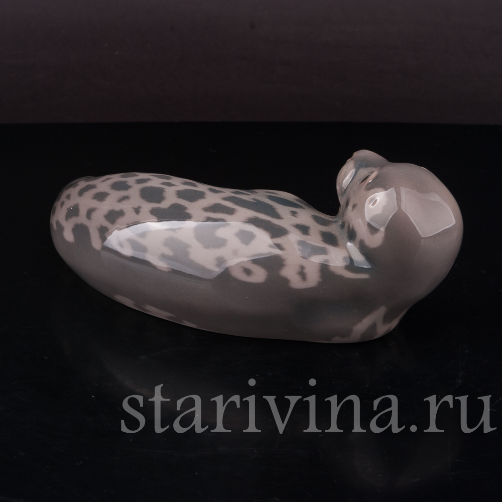 Характерное для датского фарфора исполнение, с его мягкими, обтекаемыми линиями и дымчатой подглазурной росписью, мастерски передает натуралистичный образ морского котика, отдыхающего на берегу.