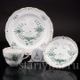 Каждый элемент трио – чашка, блюдце и пирожковая тарелка – украшен легендарным "индийским" орнаментом. Изысканная роспись в глубоком зелено-изумрудном тоне выполнена с ювелирной точностью тончайшей кистью, оживляя белоснежный фарфор. Сияющая позолота гармонично дополняет узоры, подчеркивая их утонченность и роскошь.