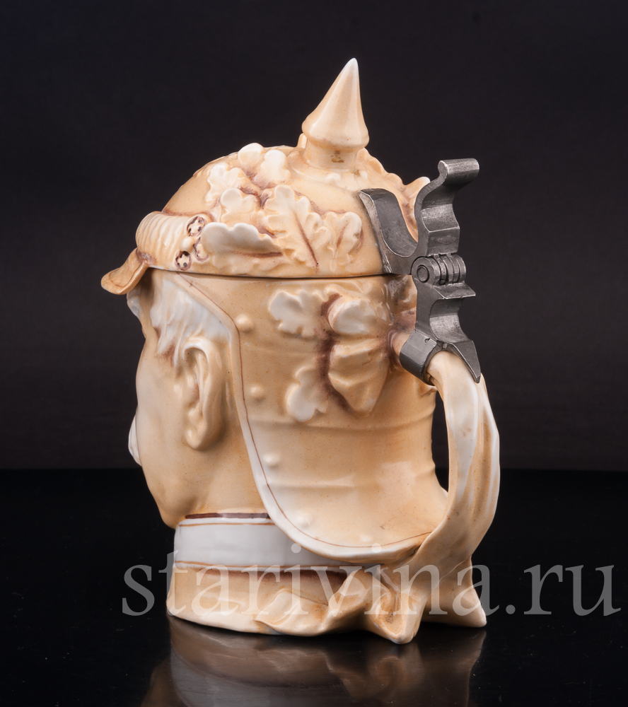 На многих портретах Бисмарк изображён в военной форме и каске, увенчанной острым навершием — пикельхельме. Одно из таких изображений и послужило прообразом для данной кружки.