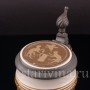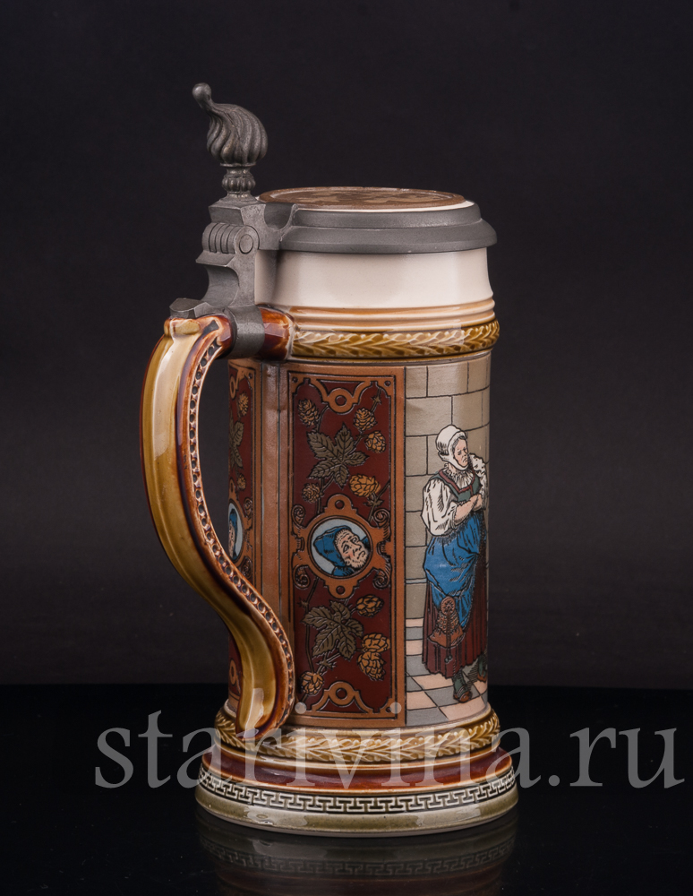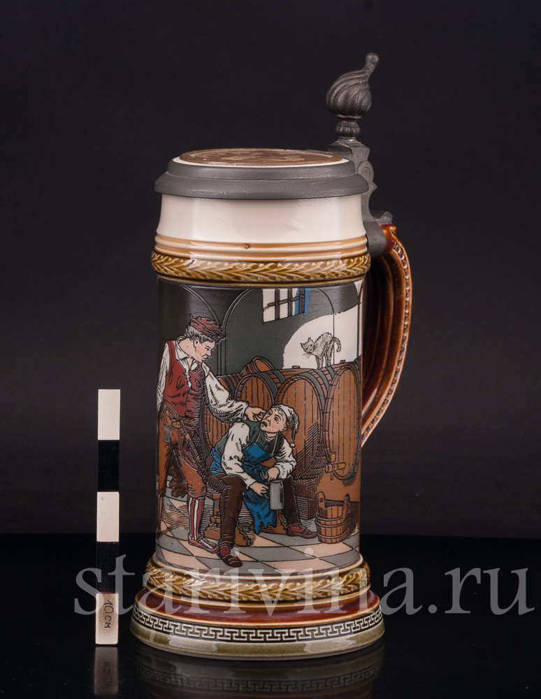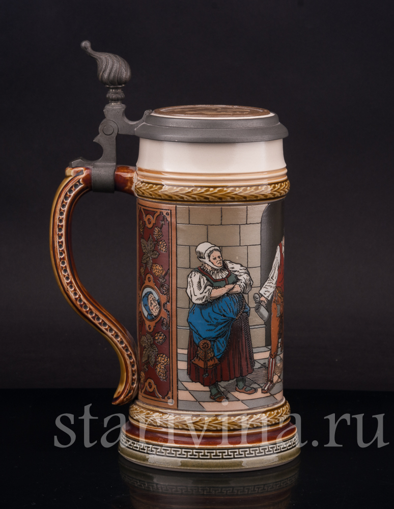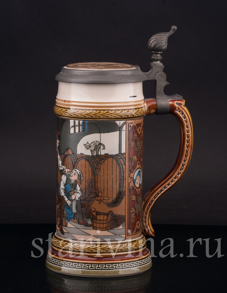 Кружка сделана весьма искусно – точные, будто бы прорезанные линии, яркие цвета, забавный сюжет. Все это делает данный предмет великолепным экземпляром для коллекции старинных кружек или оригинальным подарком поклоннику пенного напитка.