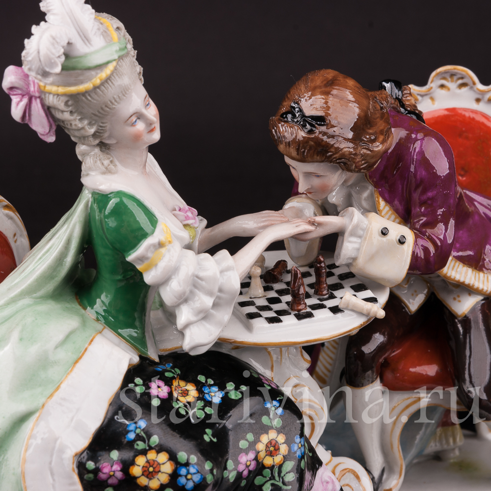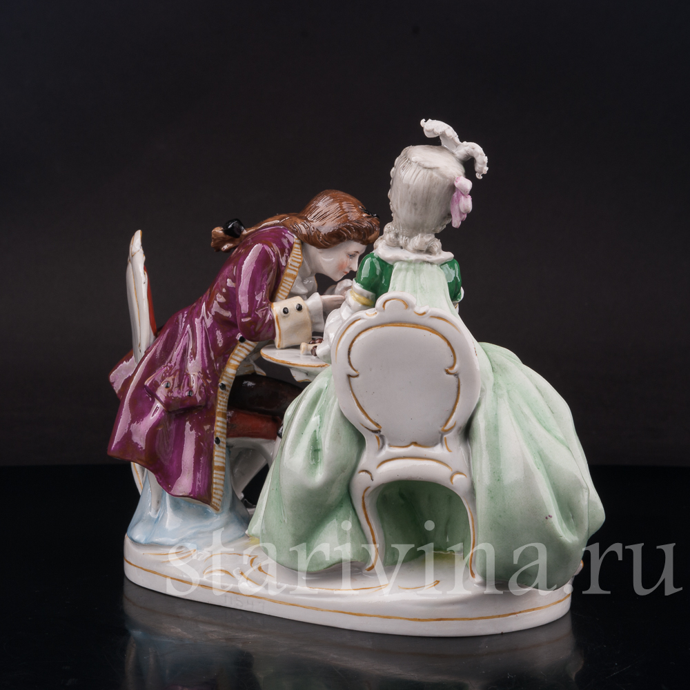 Молодые люди, увлеченные игрой, проводят время в приятном обществе друг друга. Их партия прервана трогательным моментом: кавалер склонился, чтобы поцеловать руку своей дамы, возможно, в знак признательности за игру. Прекрасная незнакомка в пышном платье явно наслаждается вниманием своего спутника. Насыщенная и яркая роспись статуэтки создает атмосферу роскошной гостиной в благородном доме. Искусное исполнение каждой детали свидетельствует о высочайшем мастерстве ее создателей.