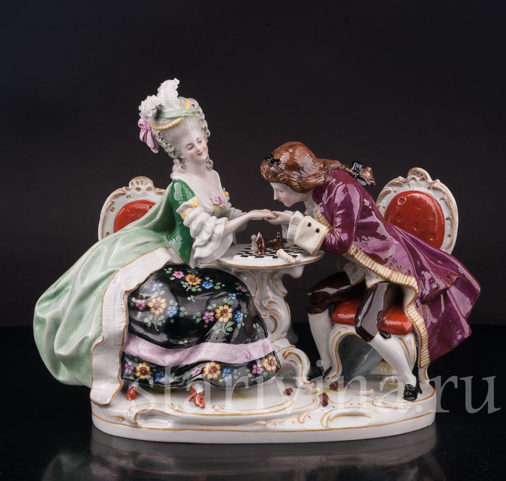 Изящная фарфоровая композиция, запечатлевшая пару за партией в шахматы, создана на фабрике Scheibe-Alsbach. Эта крупная немецкая мануфактура славится своим неизменным качеством и вековыми традициями.