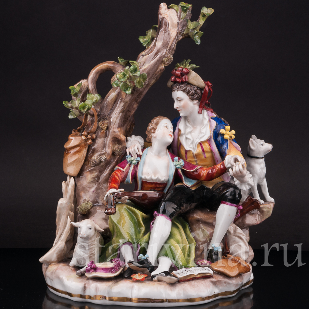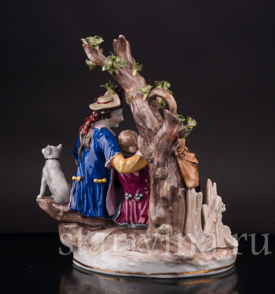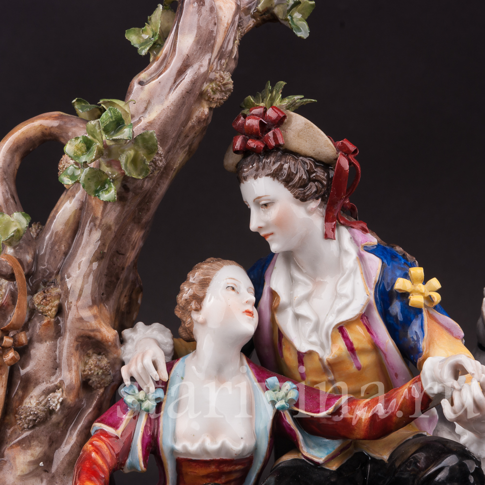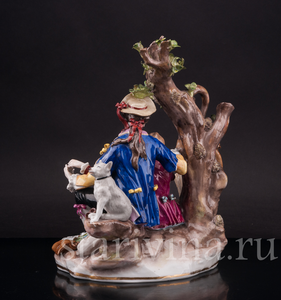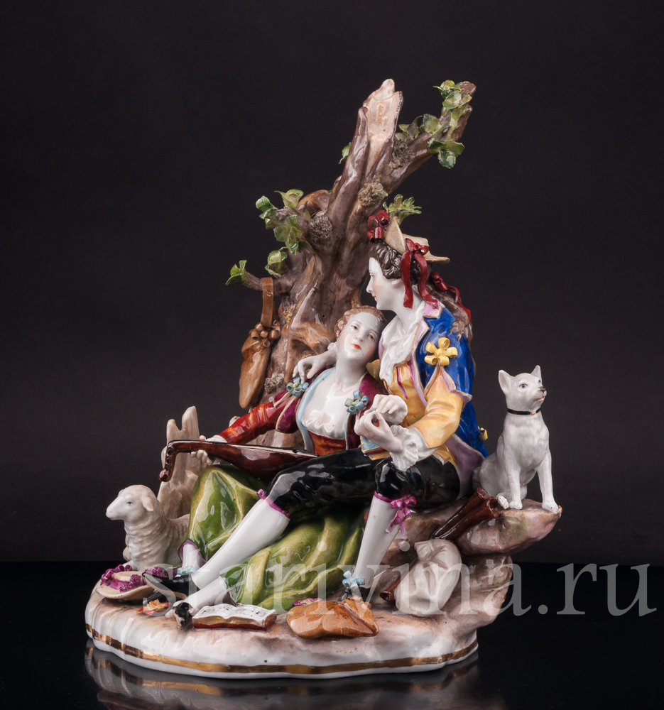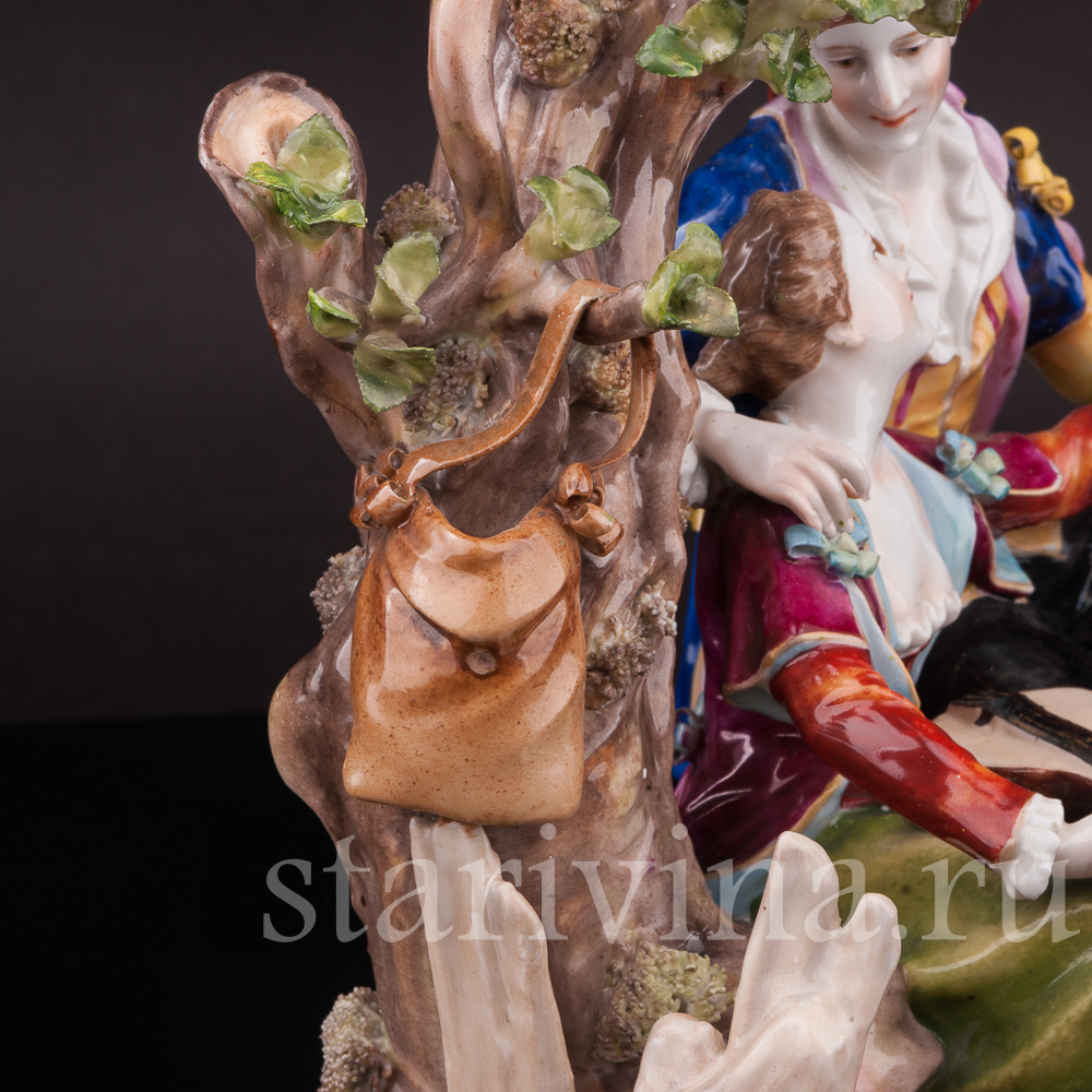 Яркая фарфоровая композиция с парой, отдыхающей у старого дерева, создана в Германии на фабрике Von Schierholz, существовавшей с 1816 по 1972 годы в городе Plaue, в Тюрингии.