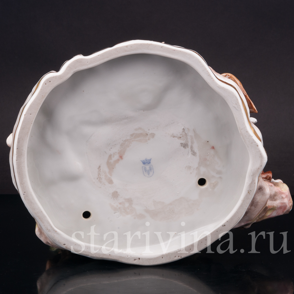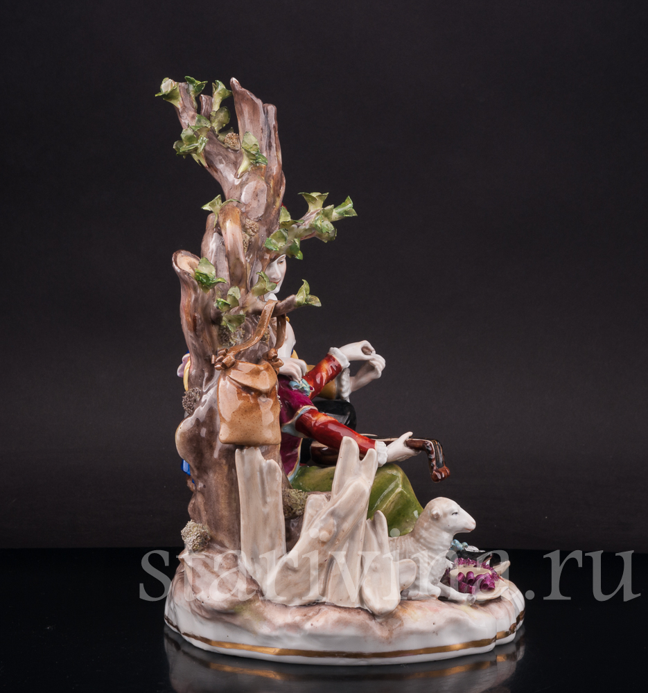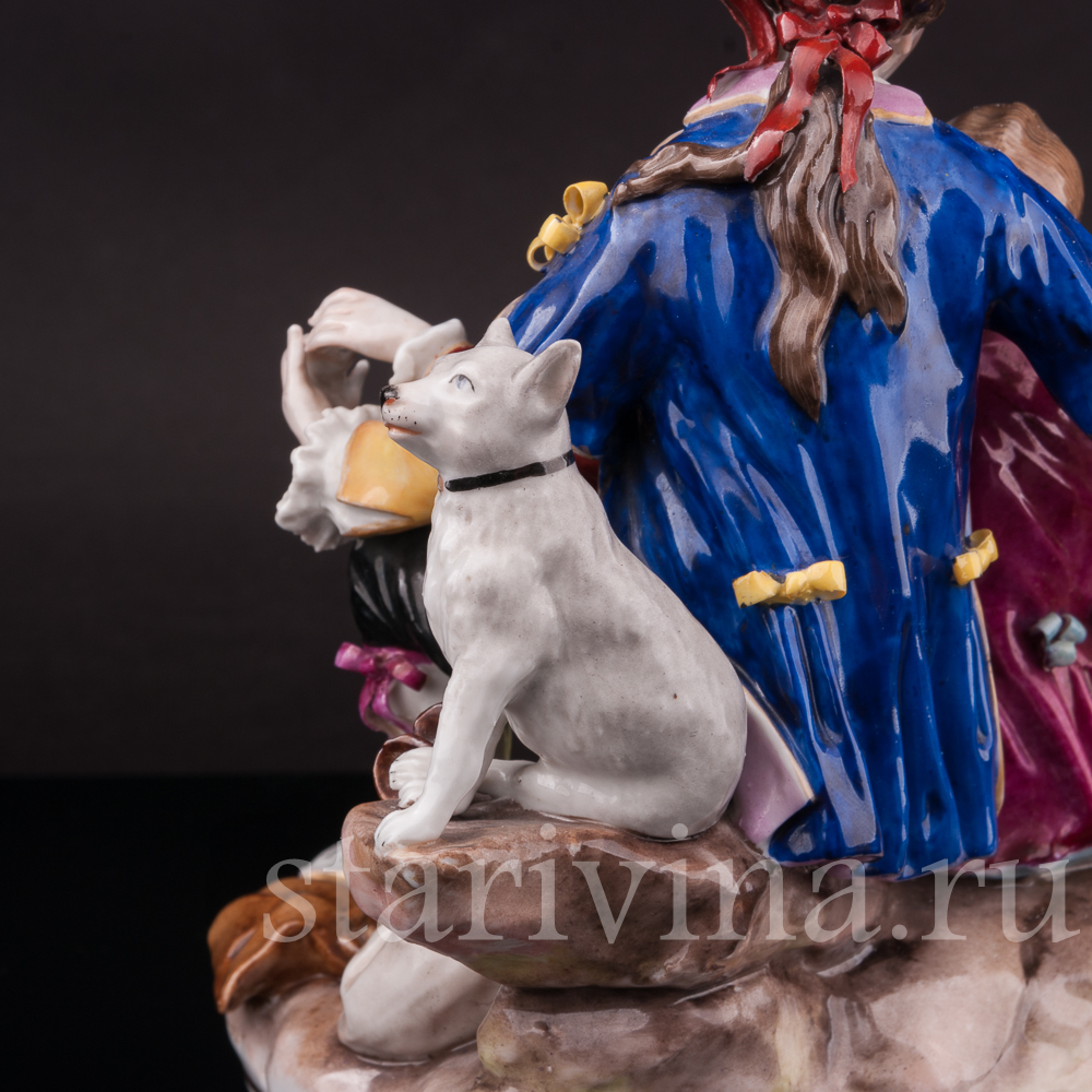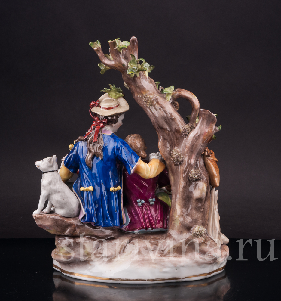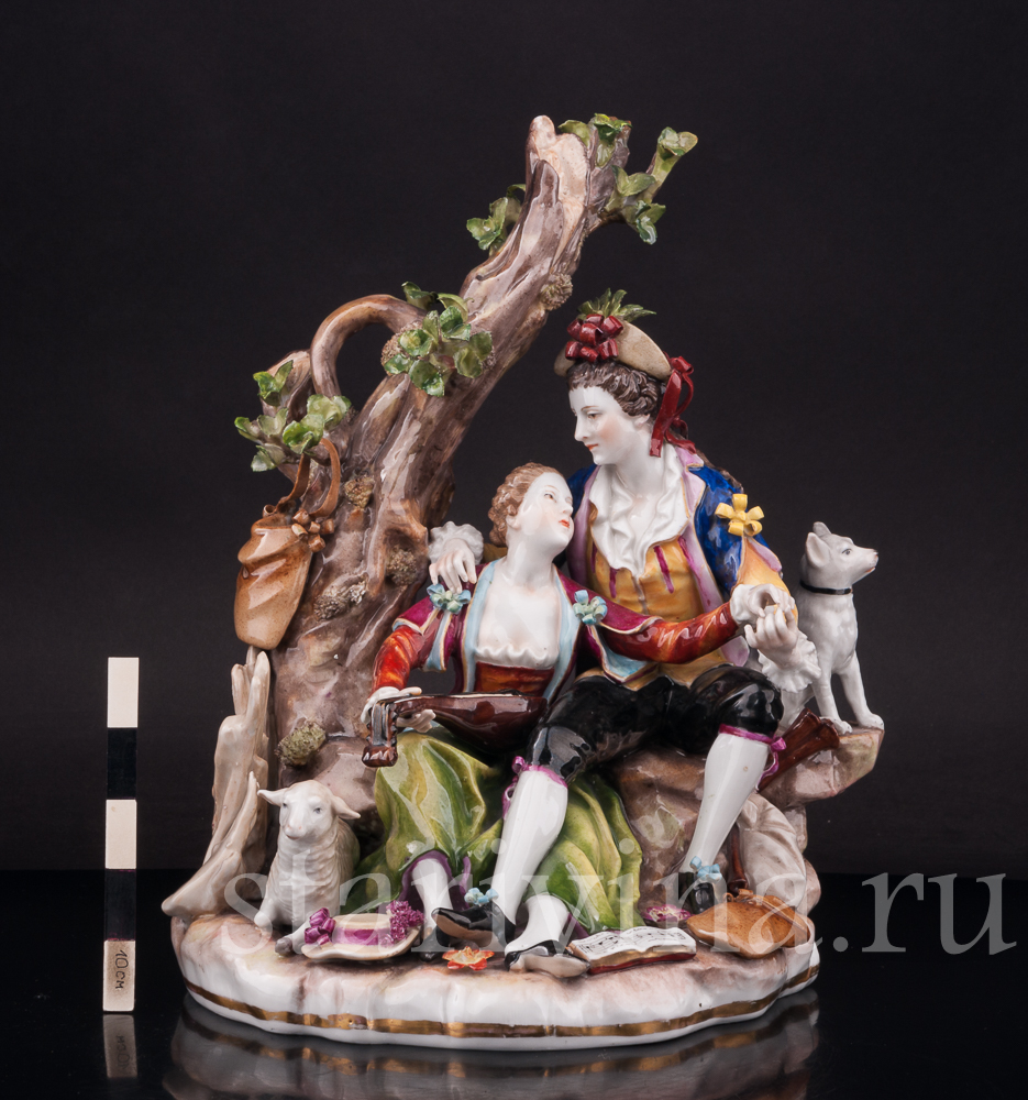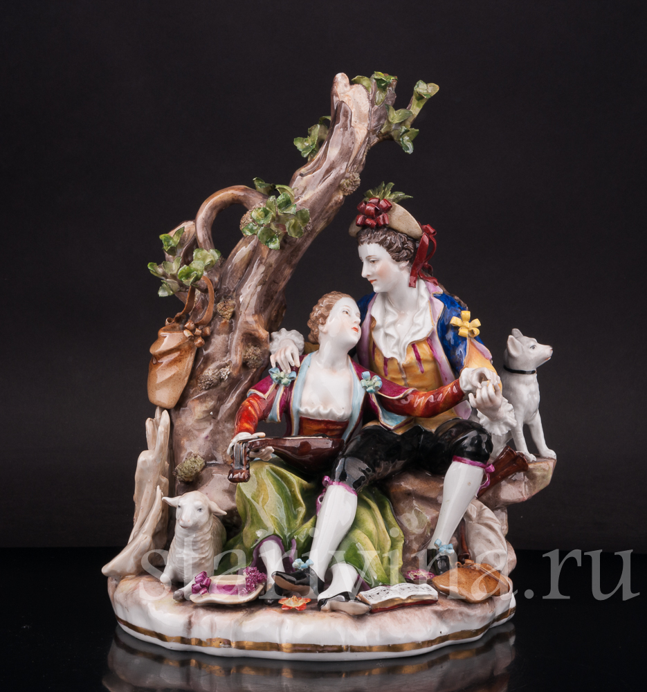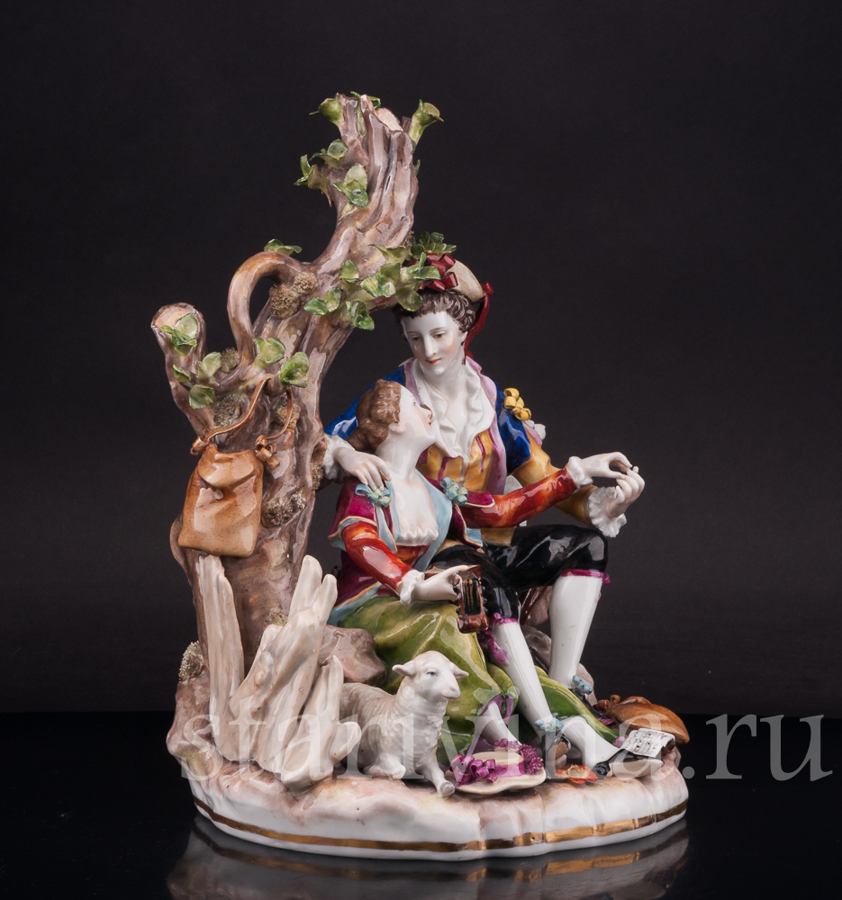 Яркая фарфоровая композиция с парой, отдыхающей у старого дерева, создана в Германии на фабрике Von Schierholz, существовавшей с 1816 по 1972 годы в городе Plaue, в Тюрингии.