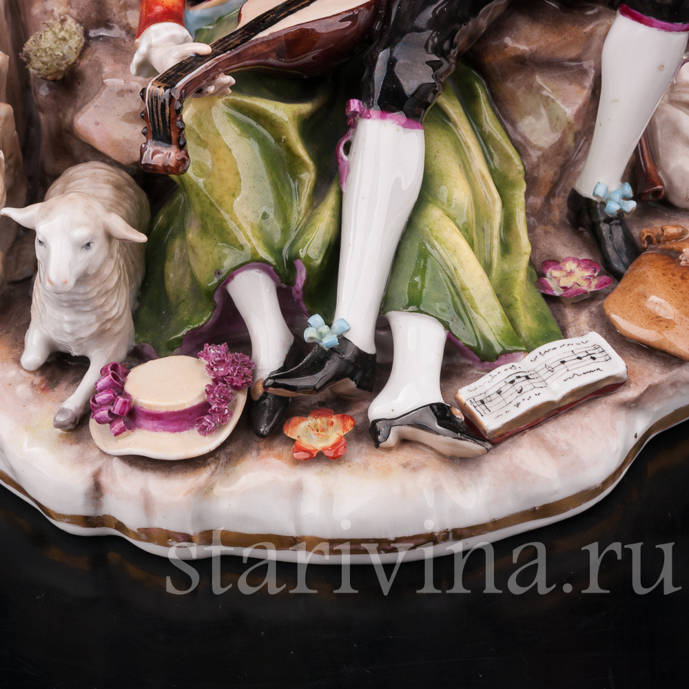 Юноша и девушка сидят под старым деревом, играя на музыкальных инструментах и наслаждаясь солнечным летним днем. Девушка опустила свою лютню, у ног героев небрежно брошена раскрытая нотная книга, лежит шляпка, украшенная лентами – все детали композиции подчеркивают романтичное настроение пары, которым так хочется насладиться временем, проведенным наедине. Лишь верный пес, да милая овечка составляют им компанию. Композиция расписана яркими, насыщенными красками и декорирована фарфоровыми лентами. Тонкая роспись и тщательная проработка деталей говорят о высоком уровне работы мастеров старой фабрики Von Schierholz.