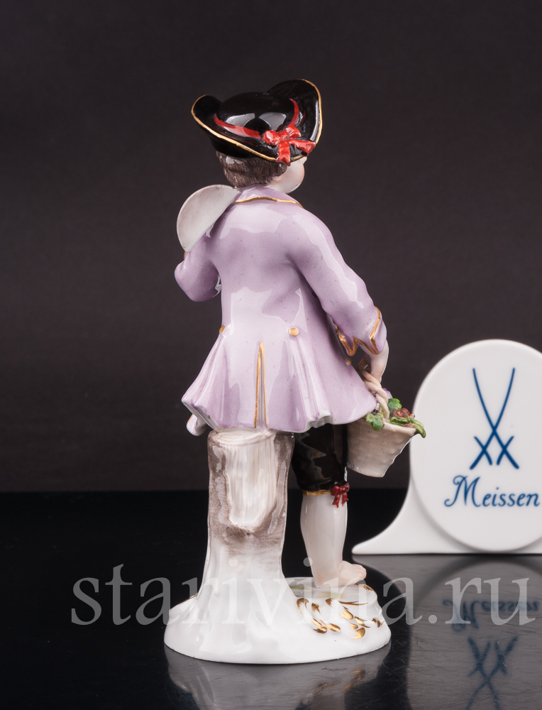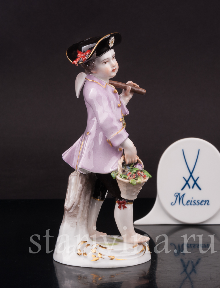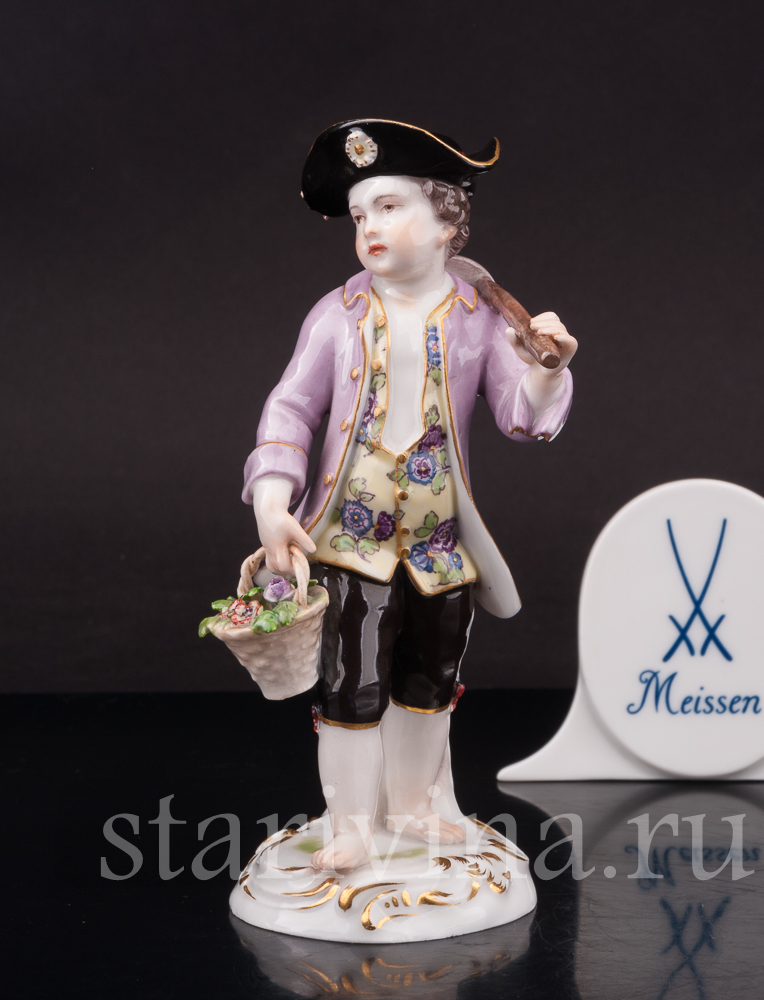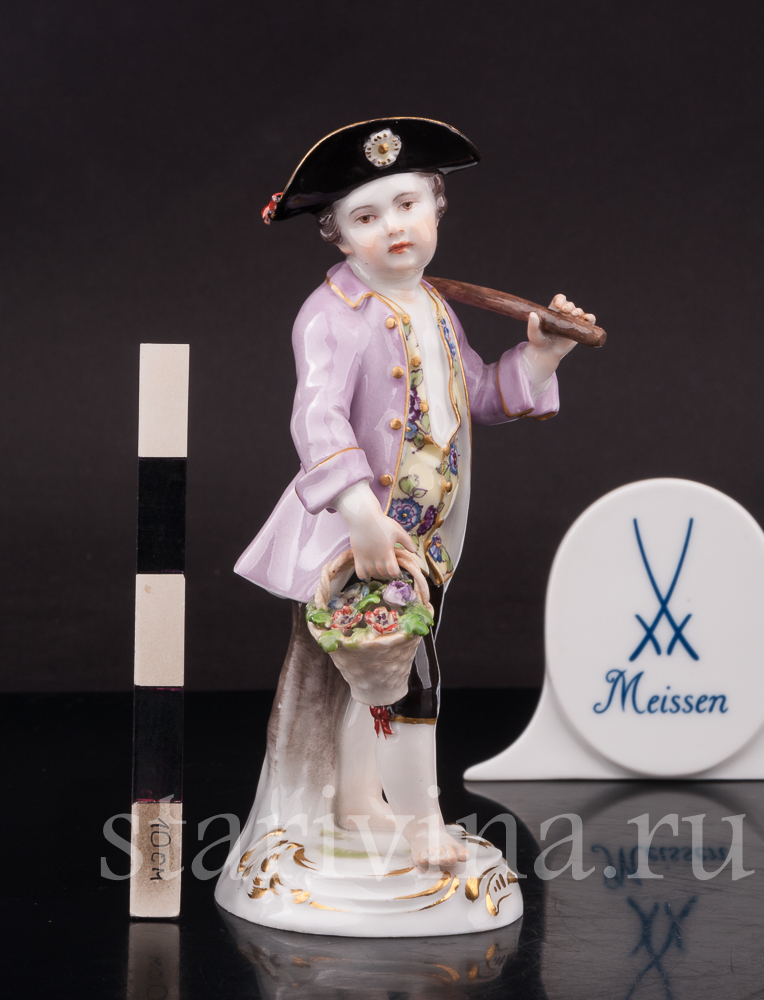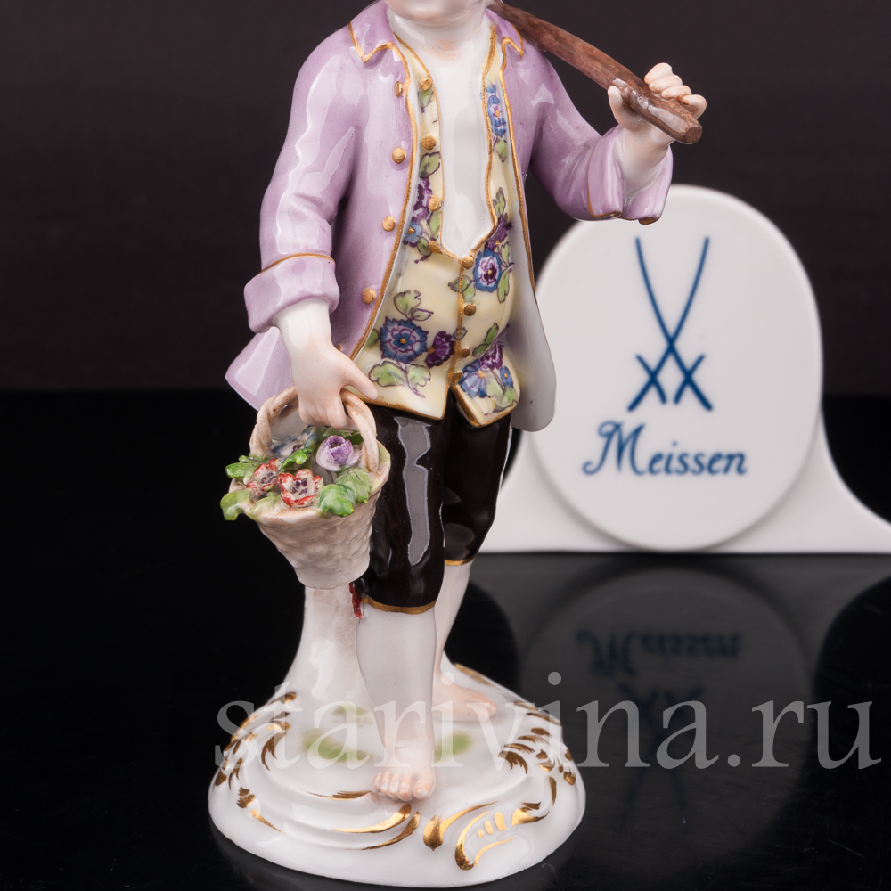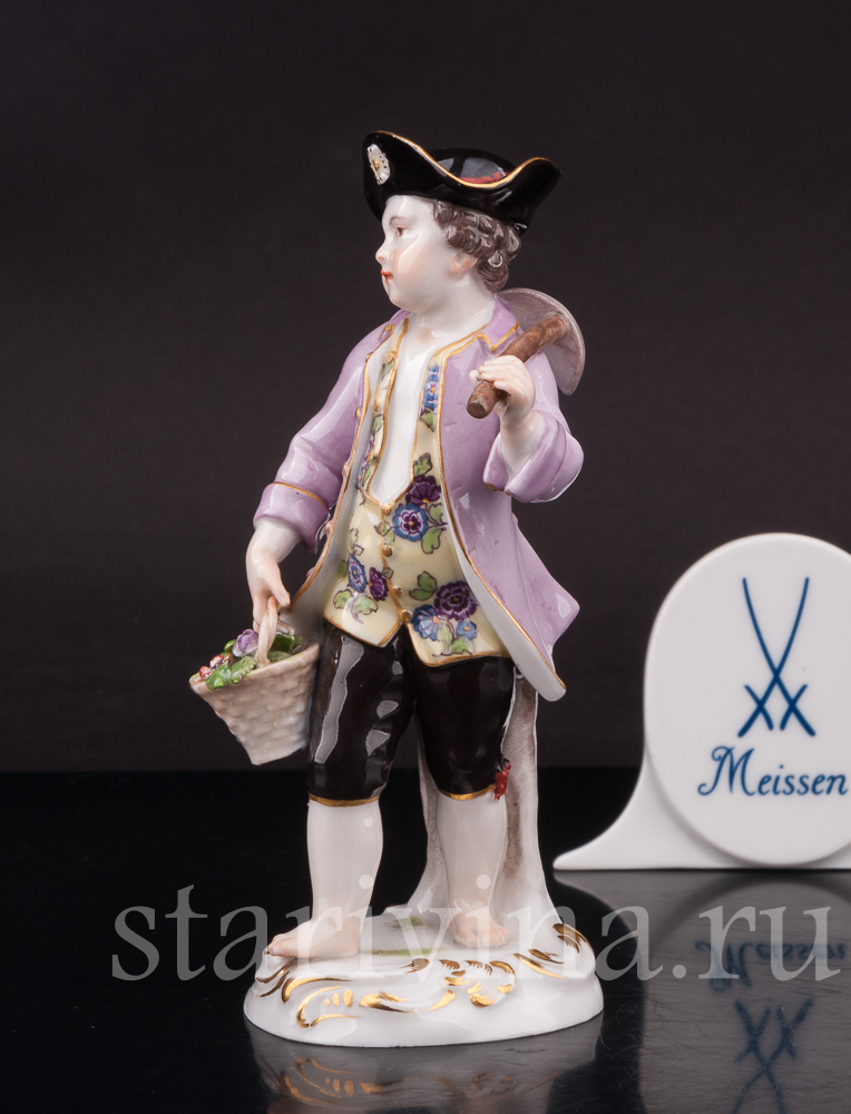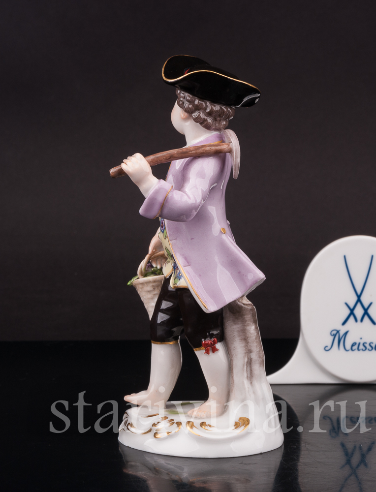 Серия включает в себя более 40 фигурок детей, изображенных во время занятий различными садовыми работами. Мальчик в одной руке держит мотыгу, закинутую на плечо, а в другой – корзинку со свежесобранными цветами. Изящная моделировка, тонкое исполнение деталей и искусная роспись делают эту фигурку прекрасным образчиком искусства мастеров прошлого