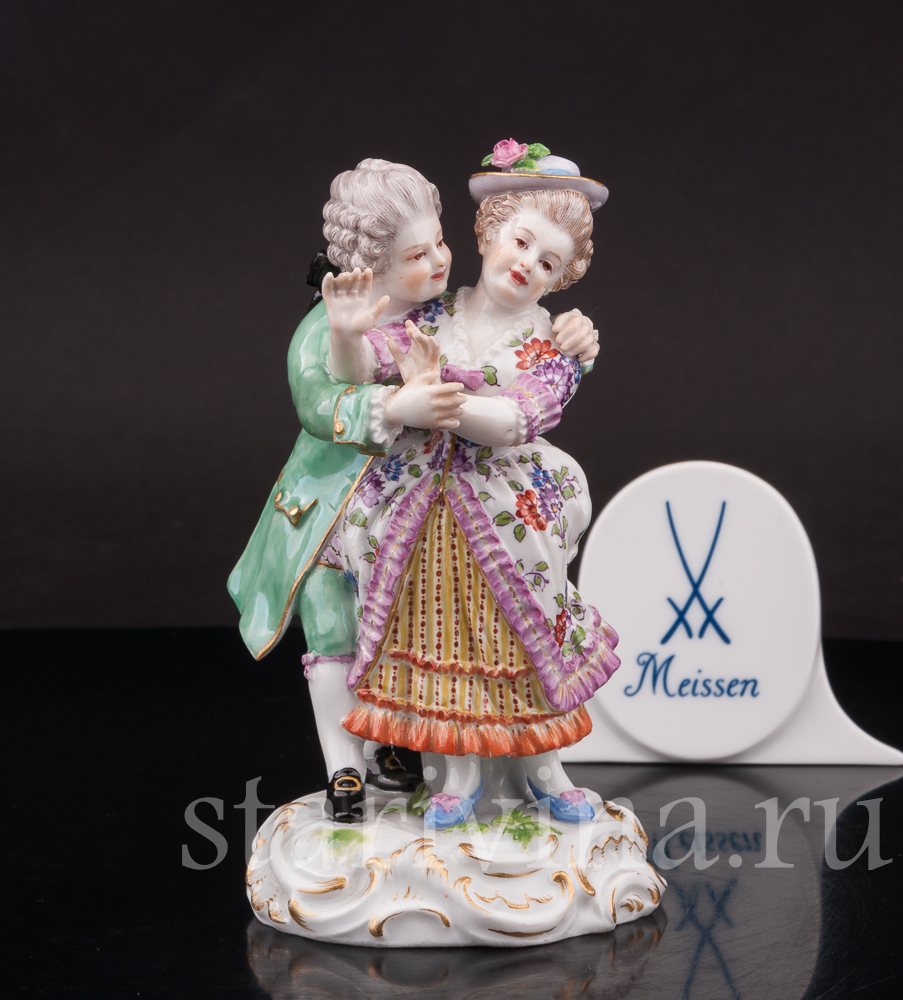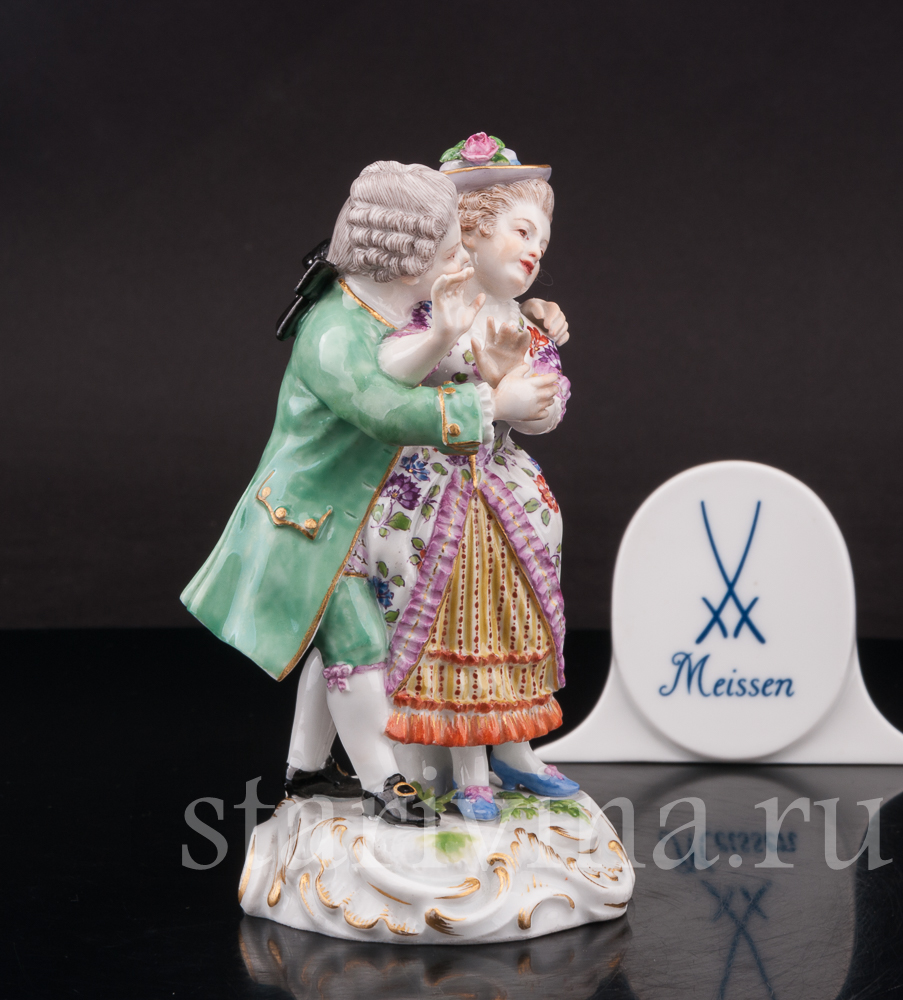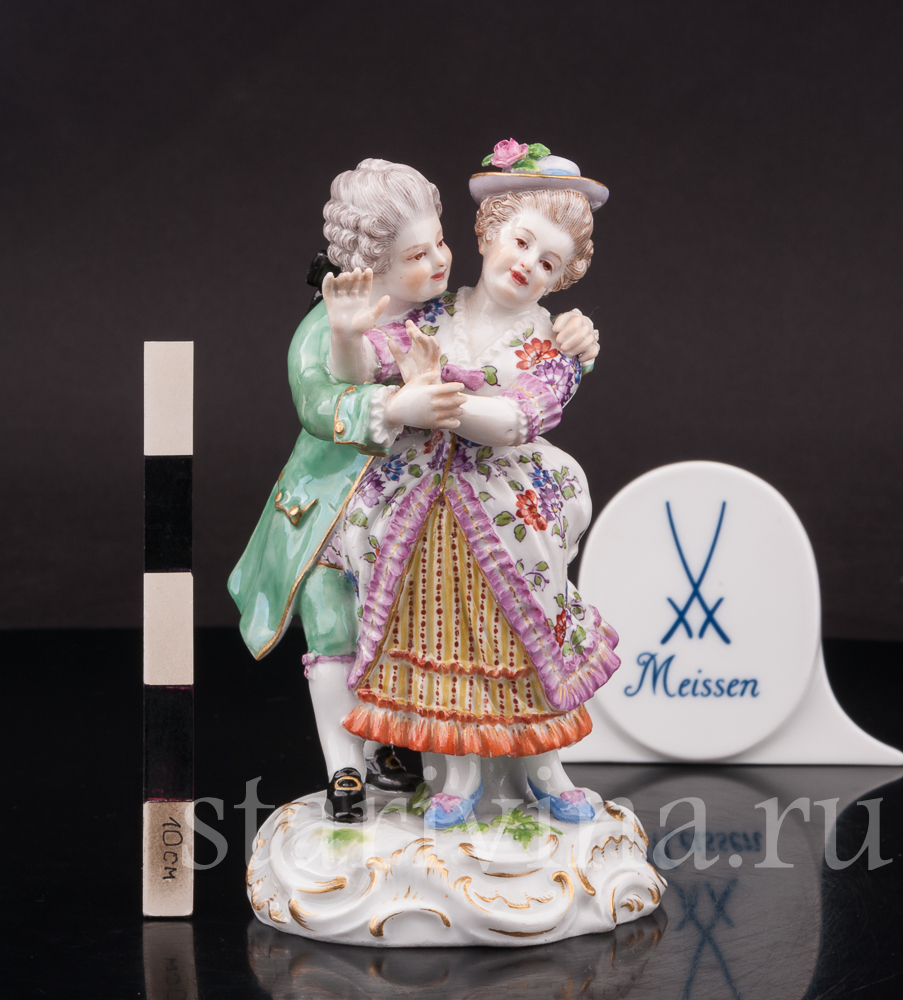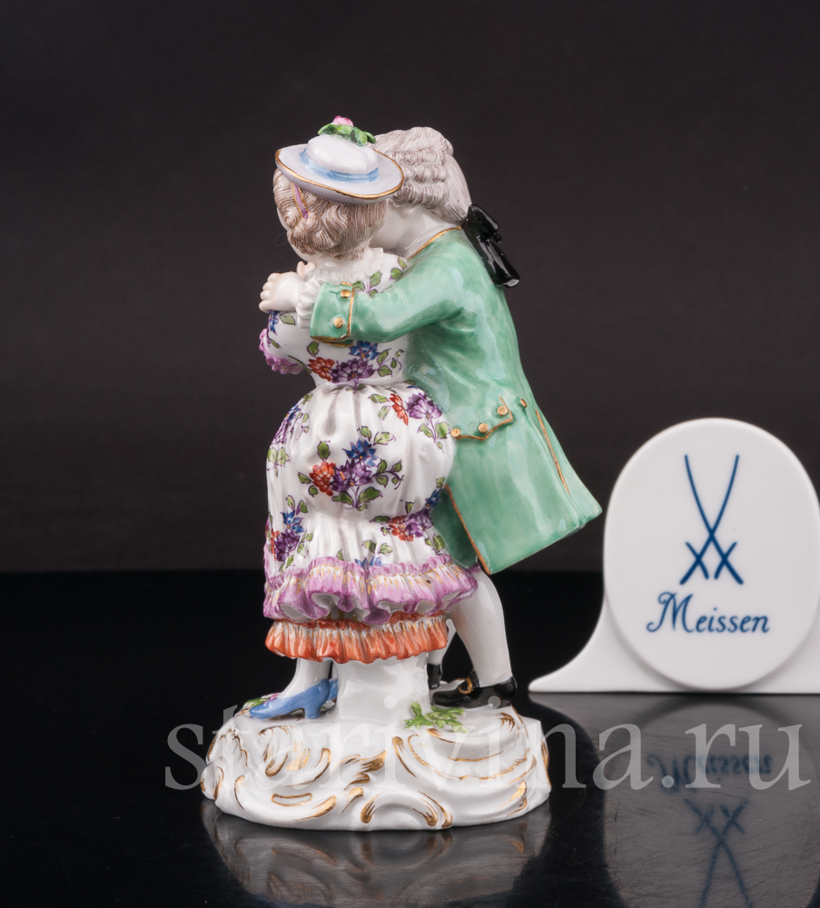Небольшая статуэтка флиртующей пары. Кавалер обнимает свою возлюбленную, а дама притворно и не очень настойчиво пытаться освободится от его объятий. Фигурка выполнена по-мейсенски точно и изящно. Внимание к деталям искусная роспись и высококачественный белый фарфор — всё свидетельствует о высоком мастерстве художников прошлого.