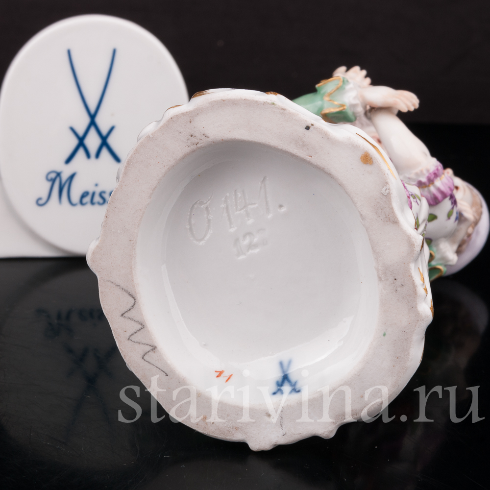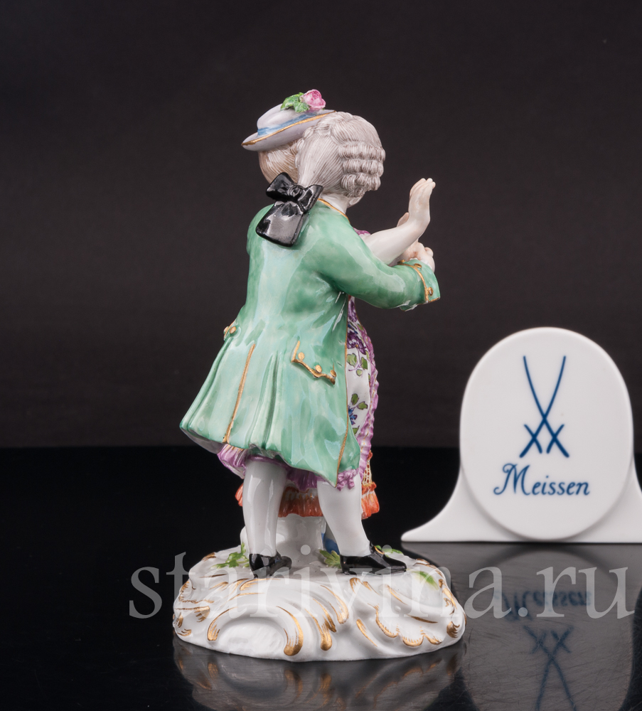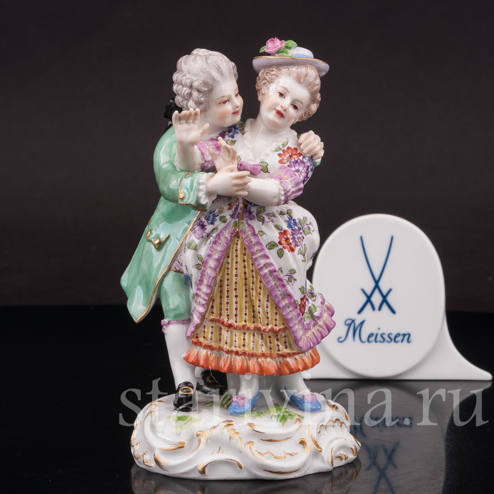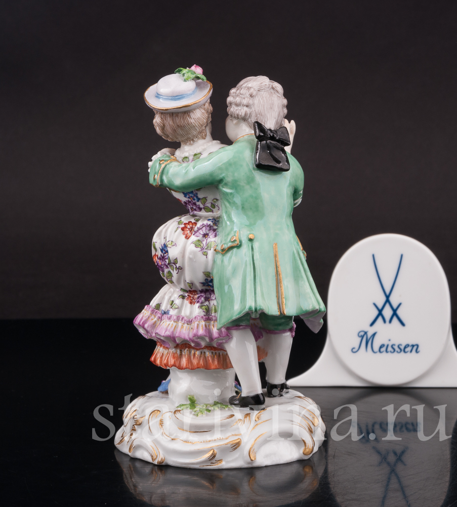 Небольшая статуэтка флиртующей пары. Кавалер обнимает свою возлюбленную, а дама притворно и не очень настойчиво пытаться освободится от его объятий. Фигурка выполнена по-мейсенски точно и изящно. Внимание к деталям искусная роспись и высококачественный белый фарфор — всё свидетельствует о высоком мастерстве художников прошлого.