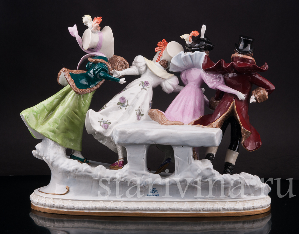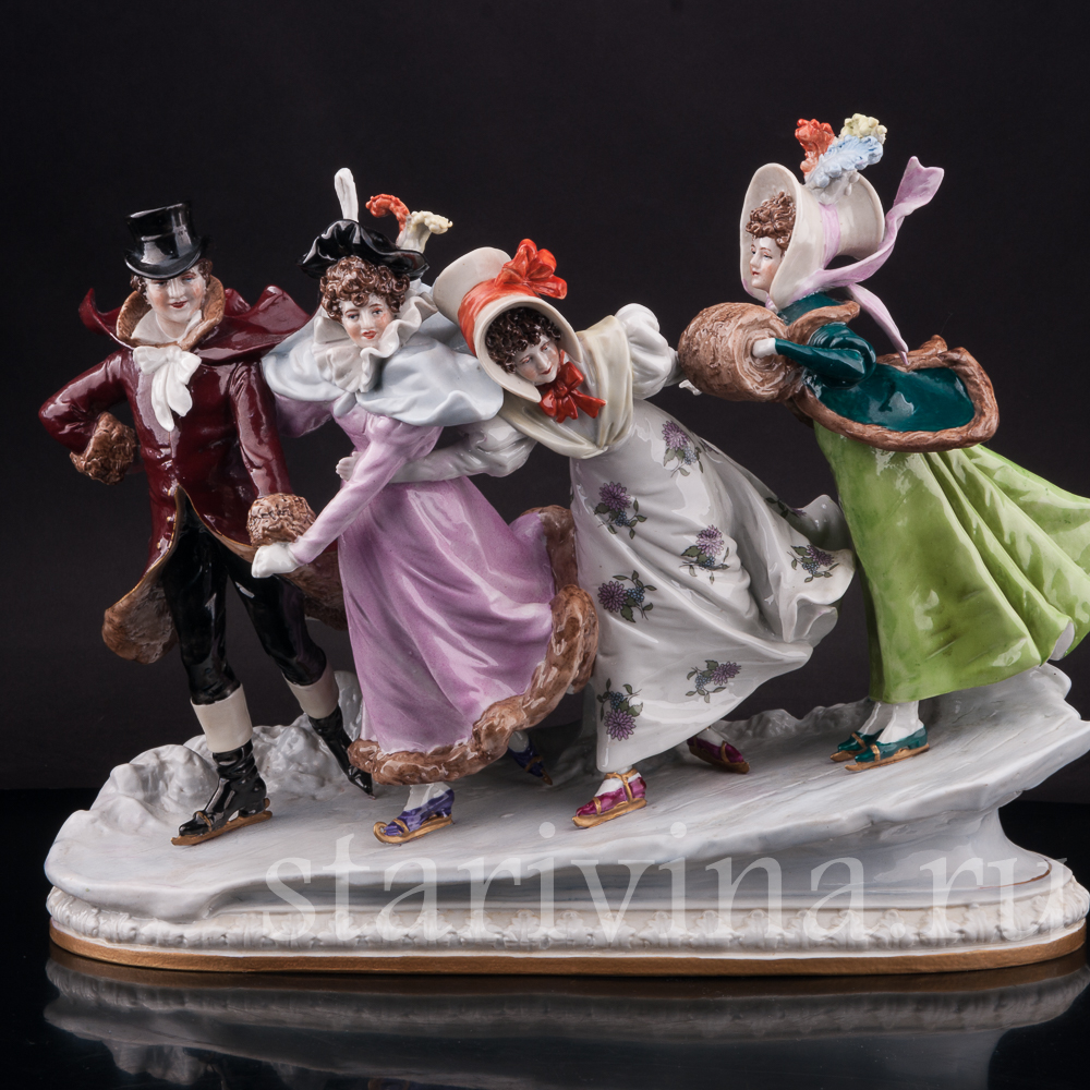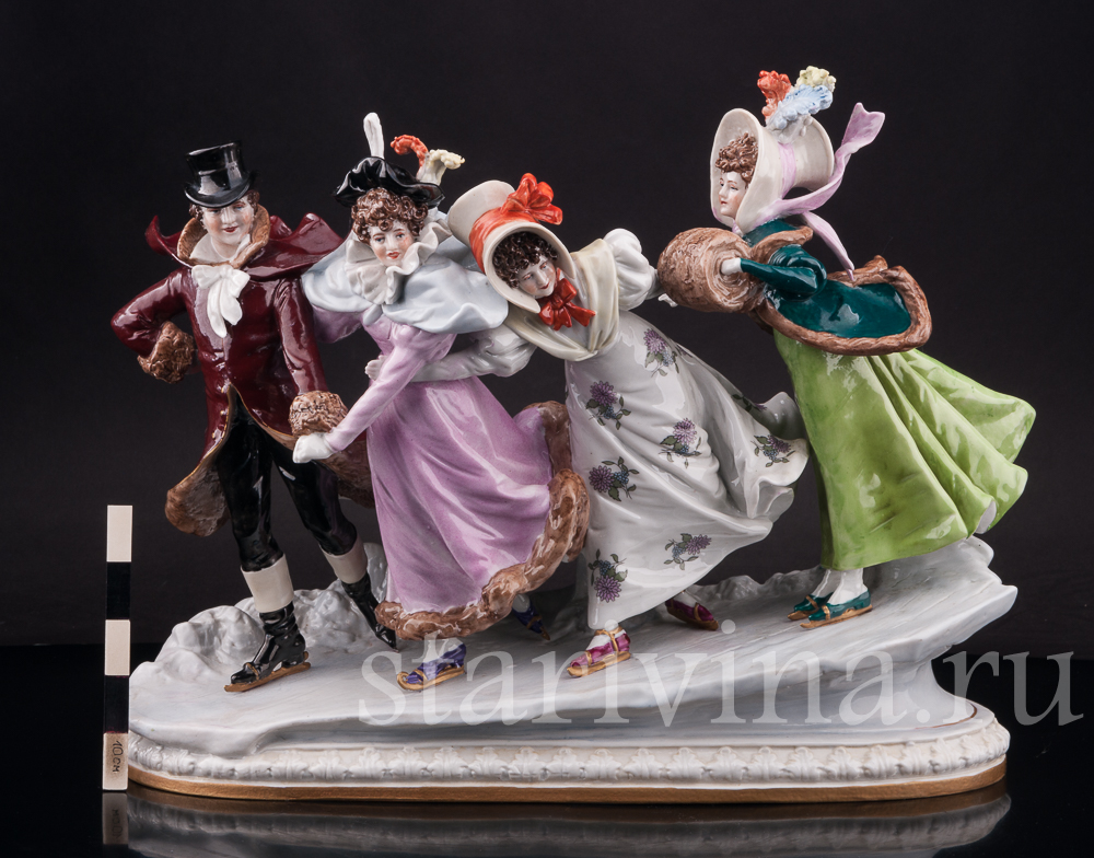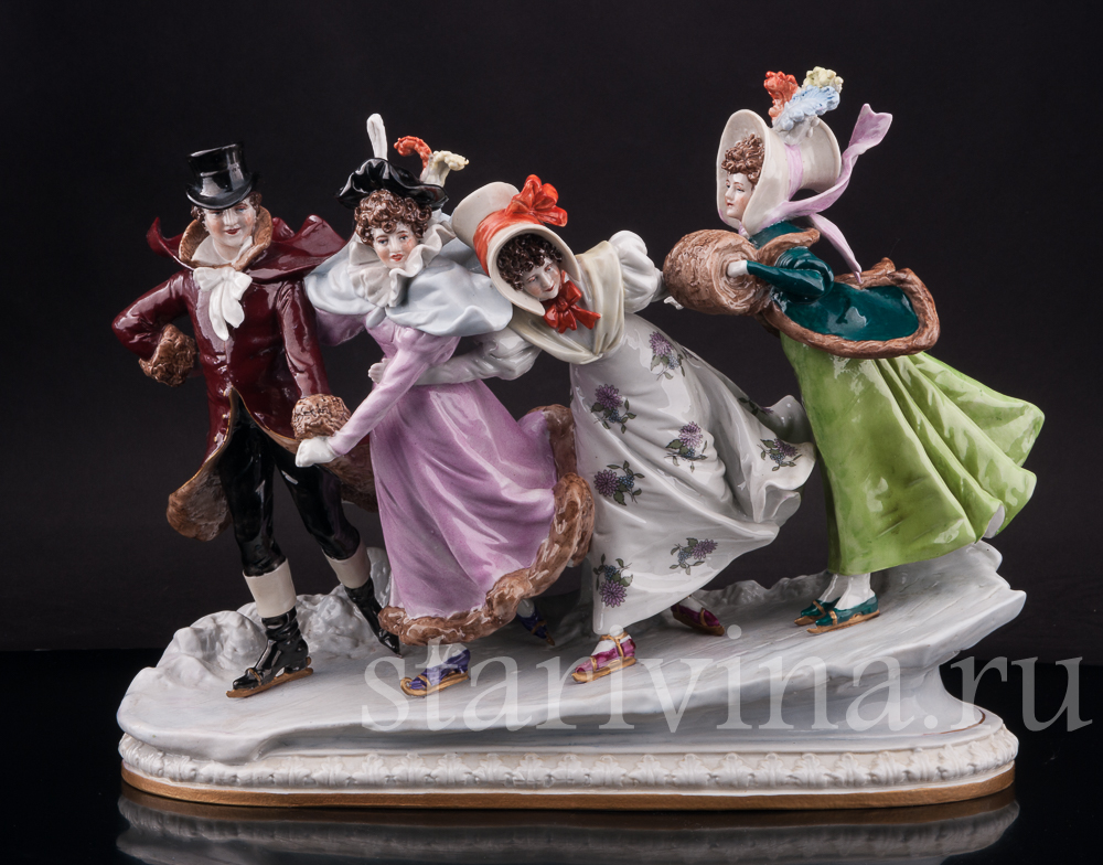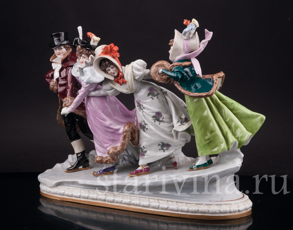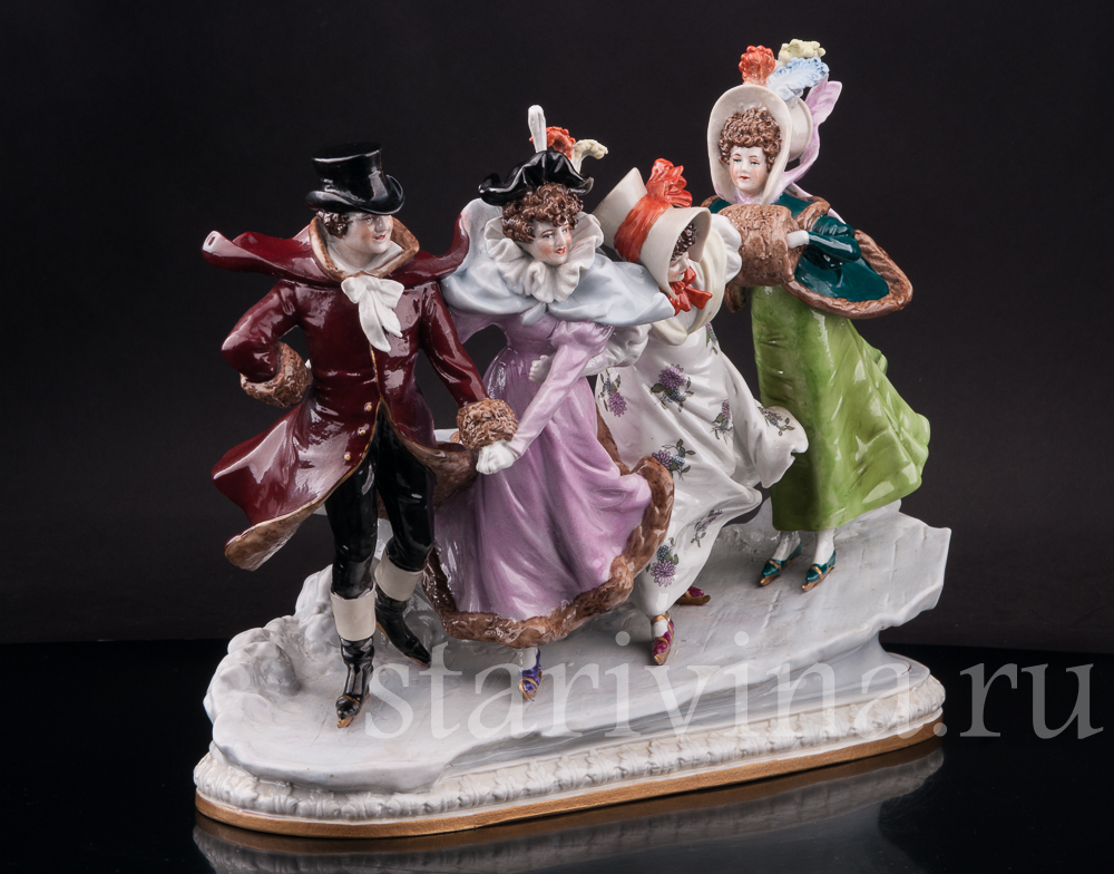 Многофигурная композиция изображающая весёлую компанию, катающуюся на коньках. Фигура сделана на немецкой фабрике Scheibe-Alsbach во второй половине 20 века. Статуэтку можно рассматривать, как аллегорию зимы.