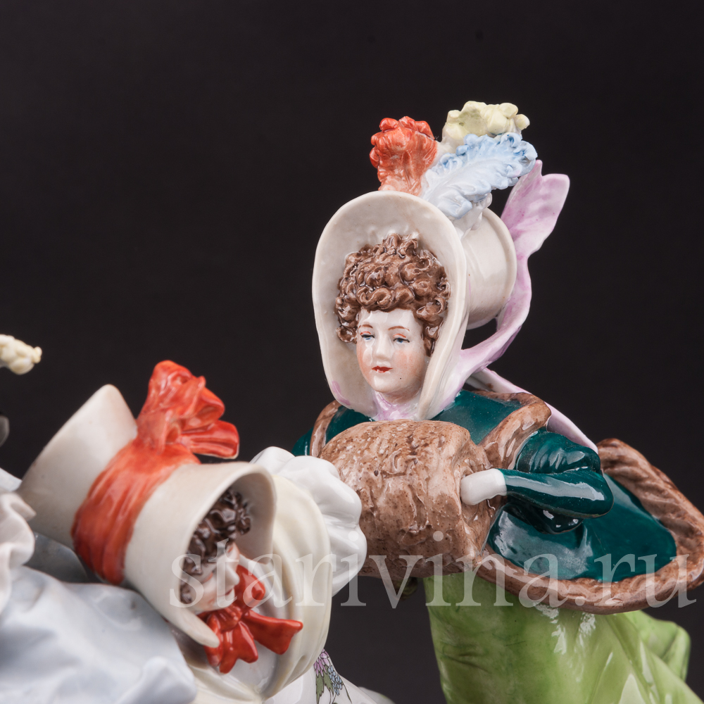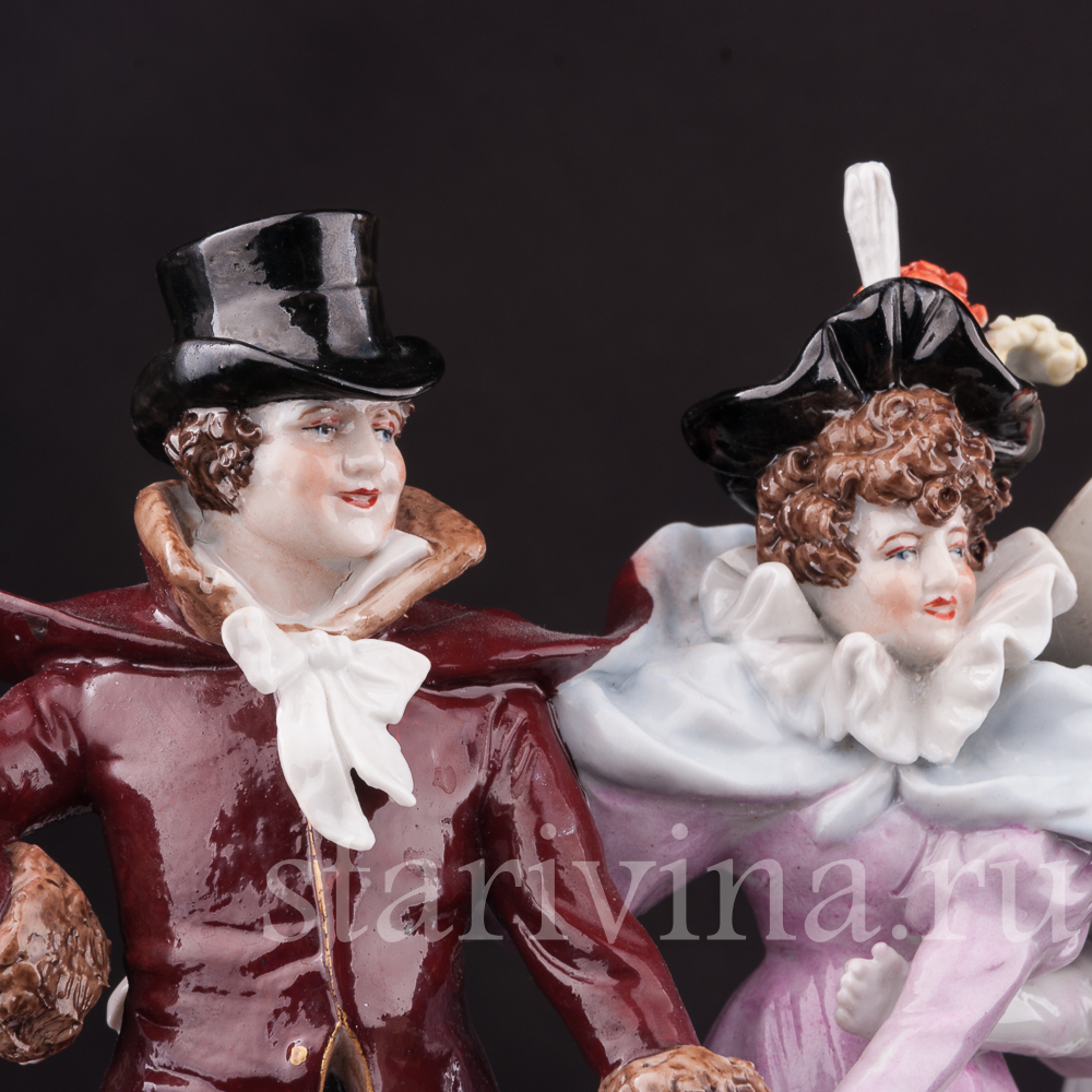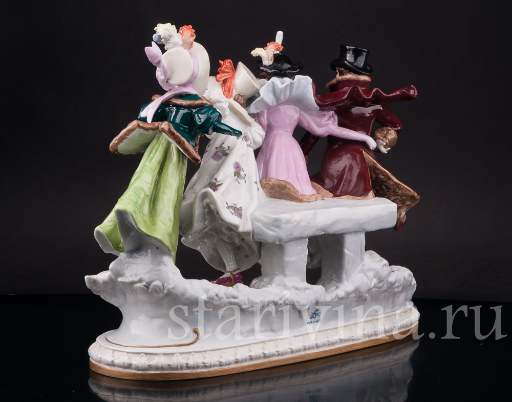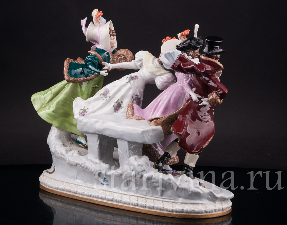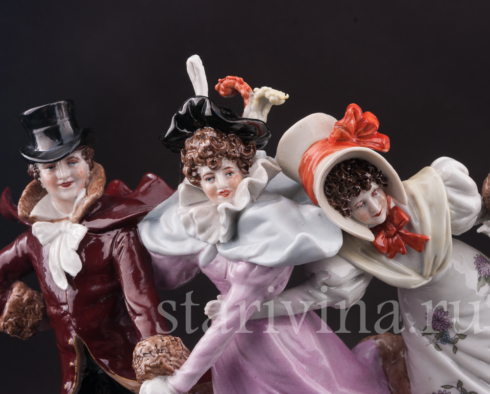 Многофигурная композиция изображающая весёлую компанию, катающуюся на коньках. Фигура сделана на немецкой фабрике Scheibe-Alsbach во второй половине 20 века. Статуэтку можно рассматривать, как аллегорию зимы.