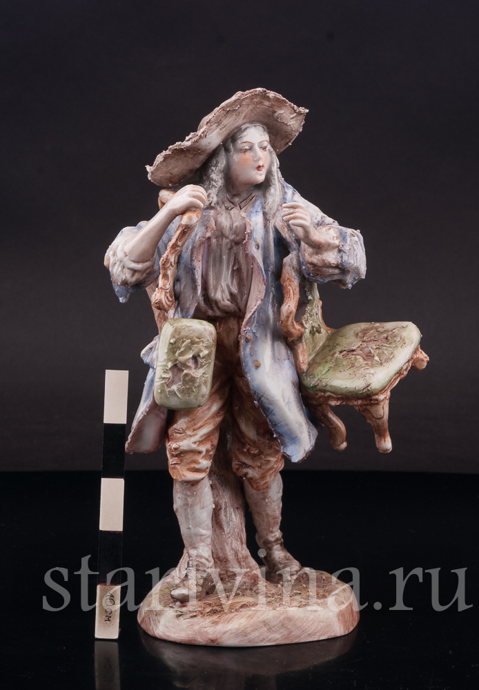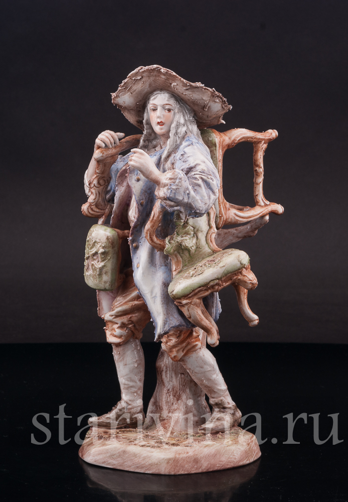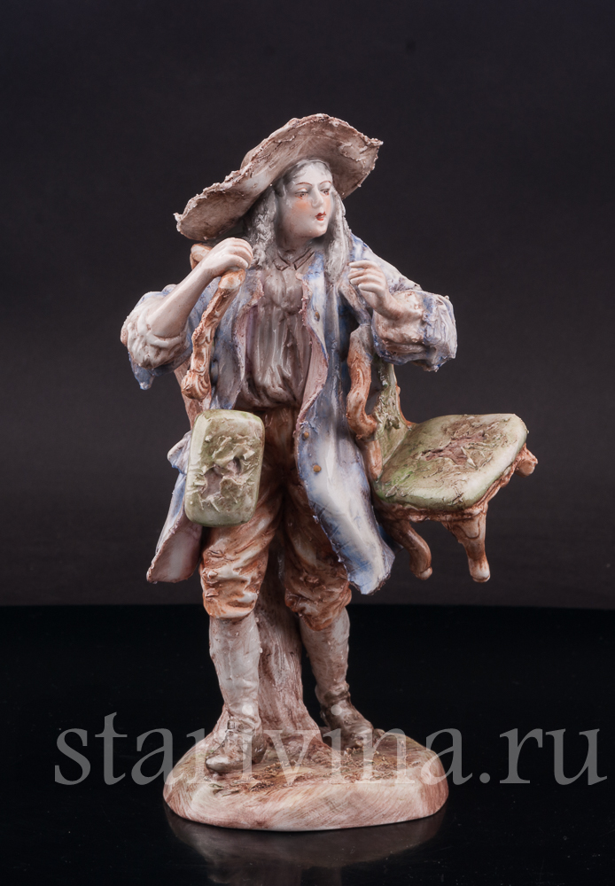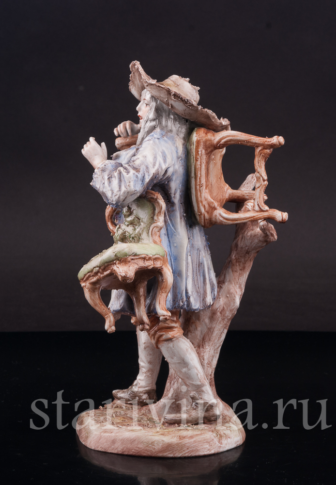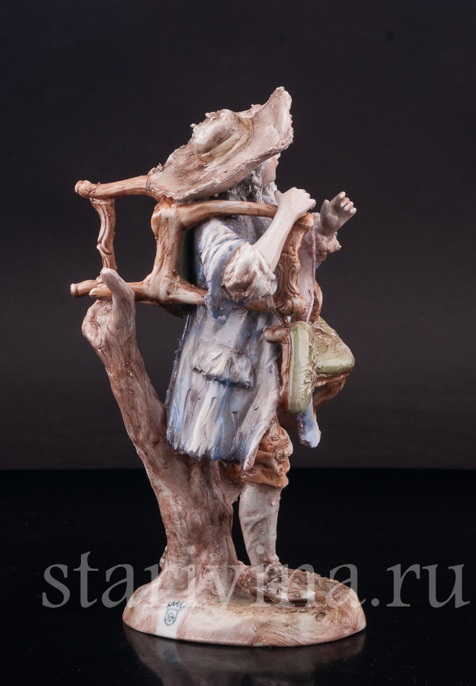 Оригинальная фигурка, изготовленная на одной из тюрингских фабрик в первой половине прошлого века, представляет нам образ уличного старьёвщика. Мужчина в видавшем виды костюме и широкополой шляпе несет потрепанные стулья и небольшую банкетку; ножки стульев сломаны, обивка износилась. Быть может он, действительно покупает старые вещи, а может, просто решил отправиться к мебельному мастеру, чтобы дать старым вещам ремонт?