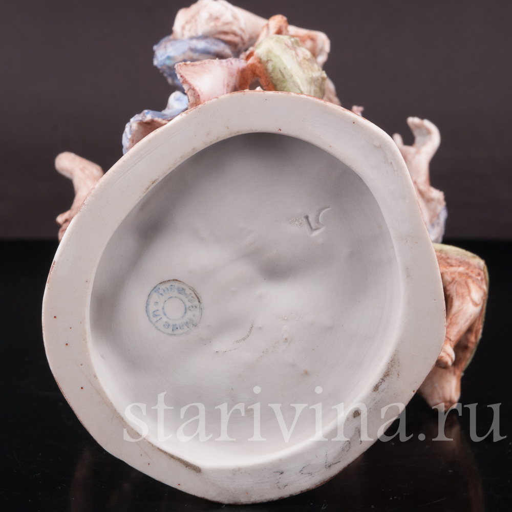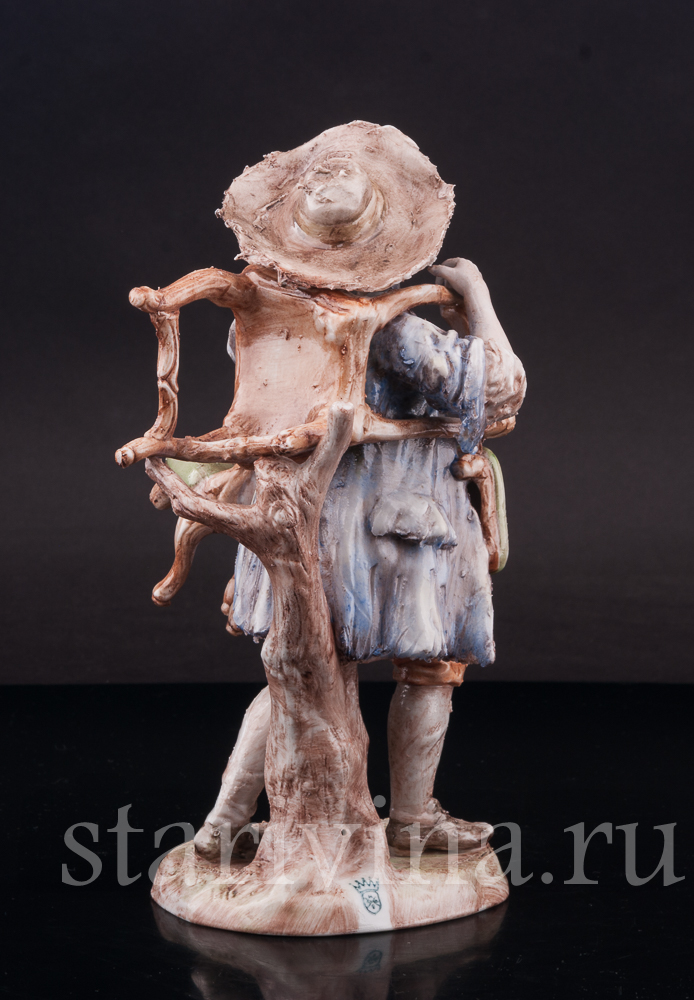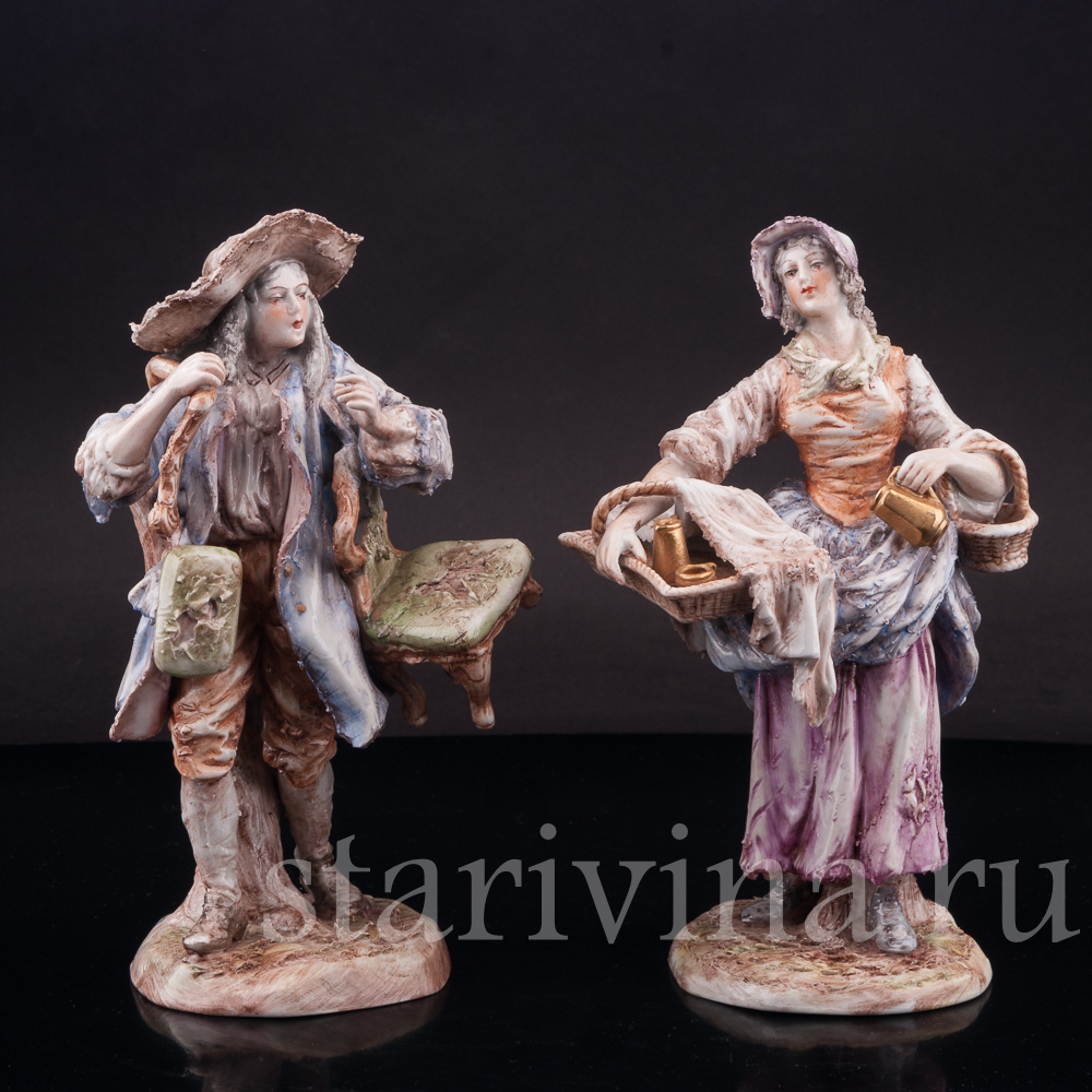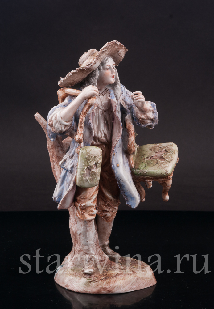 Оригинальная фигурка, изготовленная на одной из тюрингских фабрик в первой половине прошлого века, представляет нам образ уличного старьёвщика. Мужчина в видавшем виды костюме и широкополой шляпе несет потрепанные стулья и небольшую банкетку; ножки стульев сломаны, обивка износилась. Быть может он, действительно покупает старые вещи, а может, просто решил отправиться к мебельному мастеру, чтобы дать старым вещам ремонт?