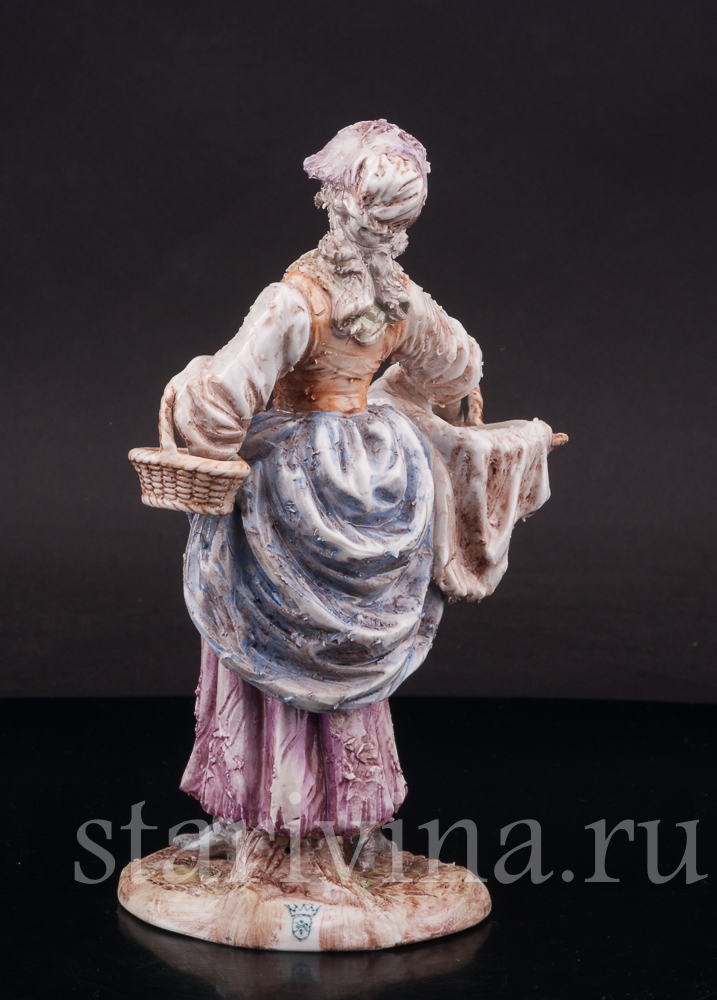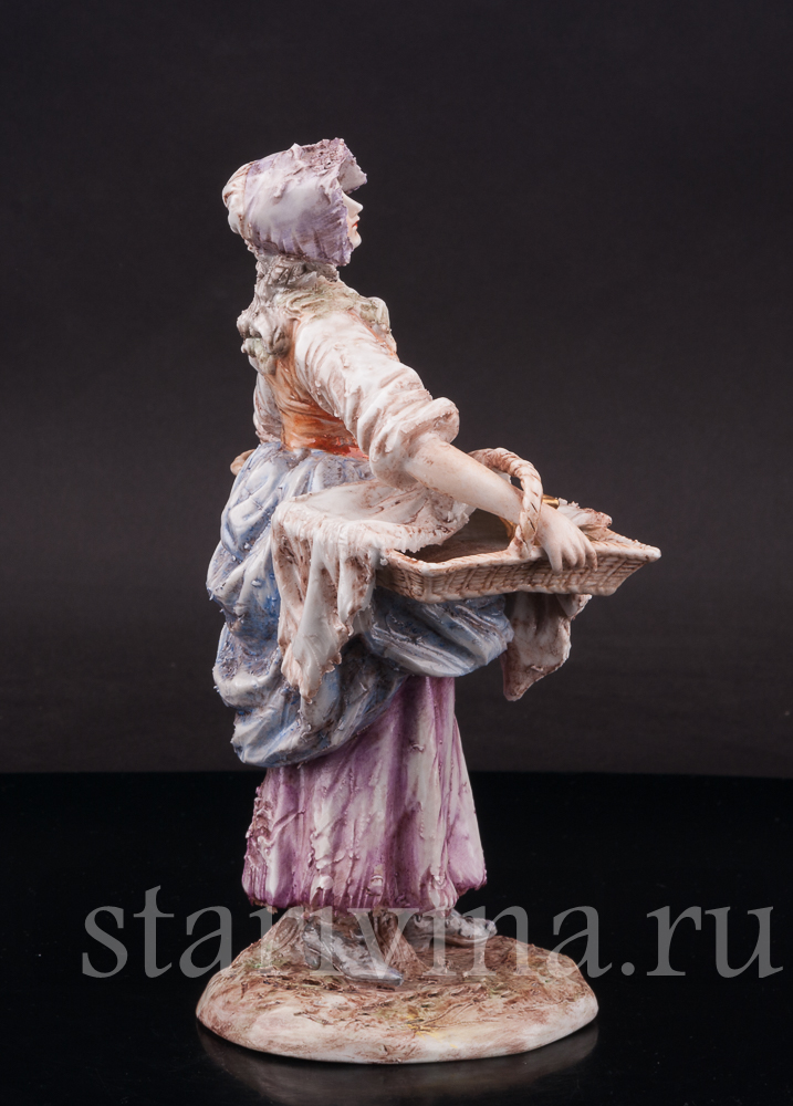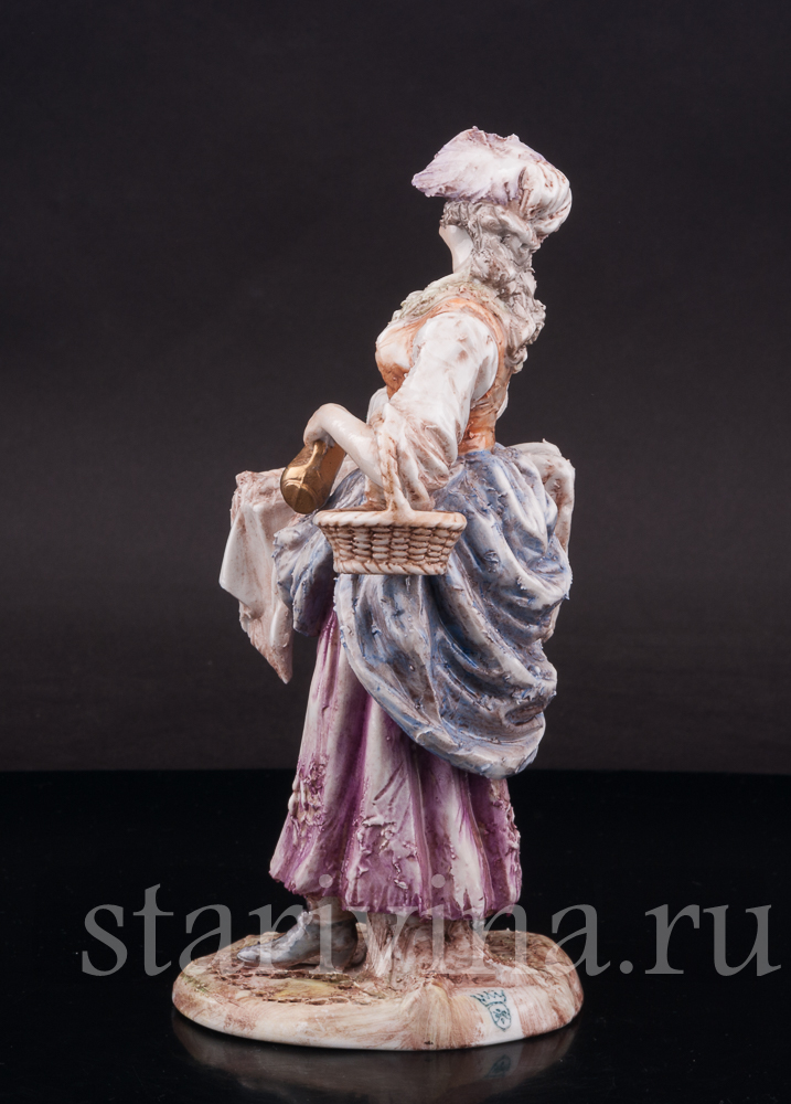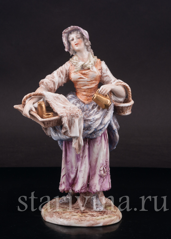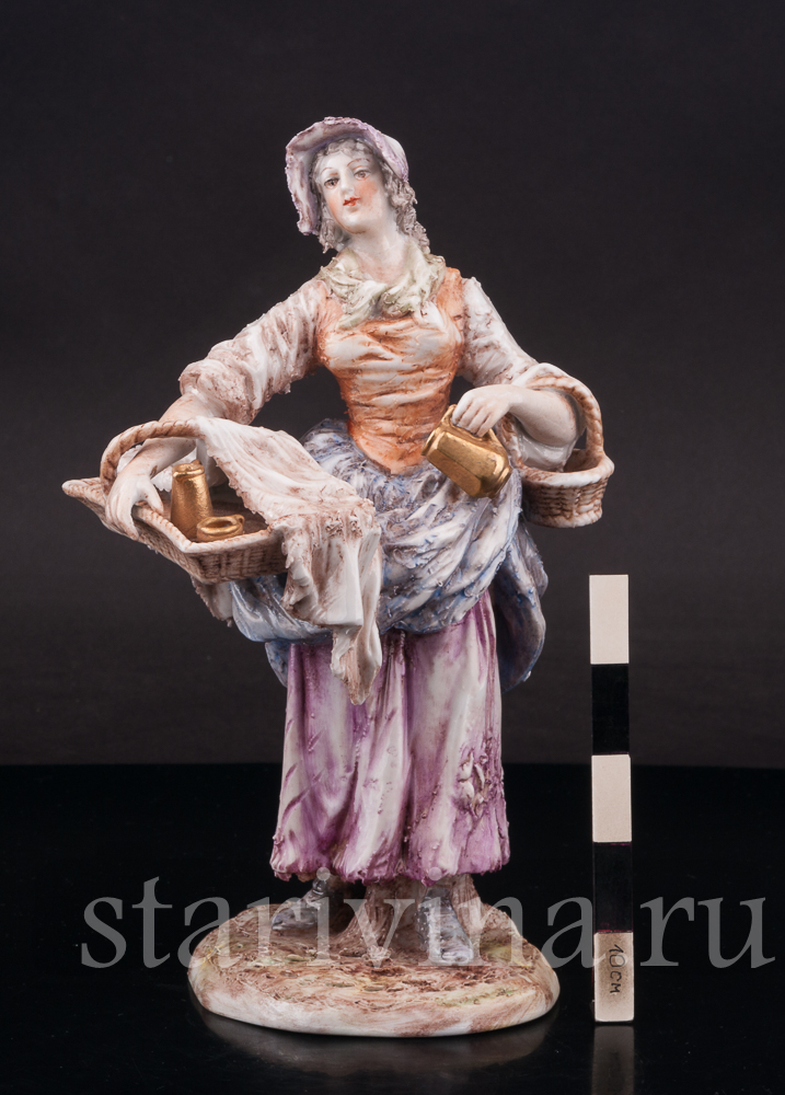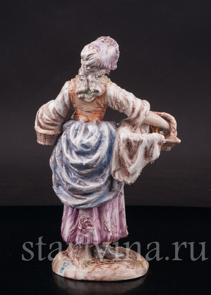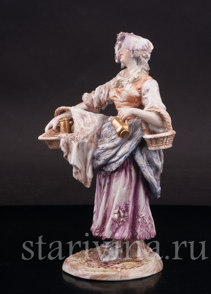 Статуэтка торговки создана на одной из тюрингских фабрик в первой половине прошлого века и представляет сценку из уличной жизни.