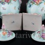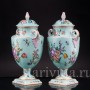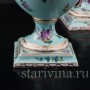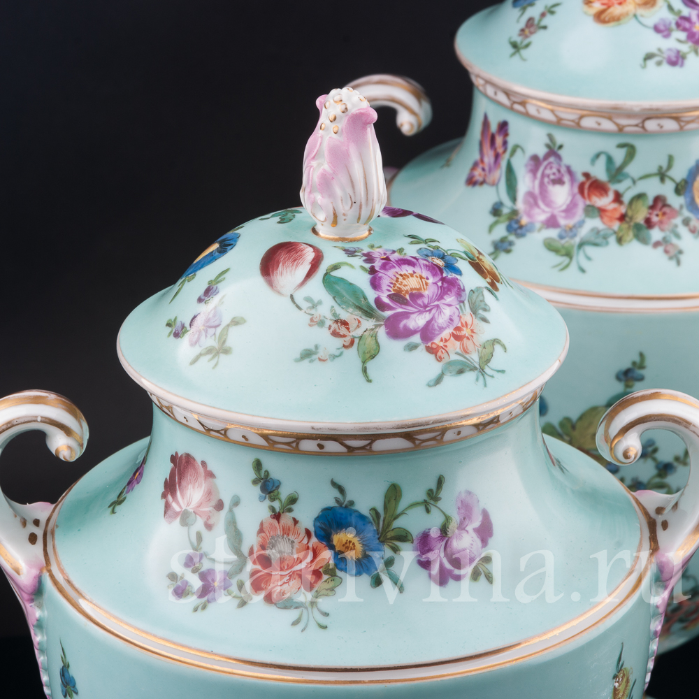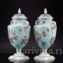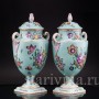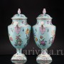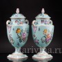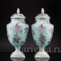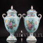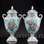 Большие вазы классической формы с изящными ручками расписаны в стиле рококо, с использованием характерных оттенков светло-голубого, розового, сиреневого, зеленого. Вазы богато украшены, разнообразие цветов в букетах позволяет бесконечно разглядывать предметы, наслаждаясь ручной росписью и красотой оттенков.