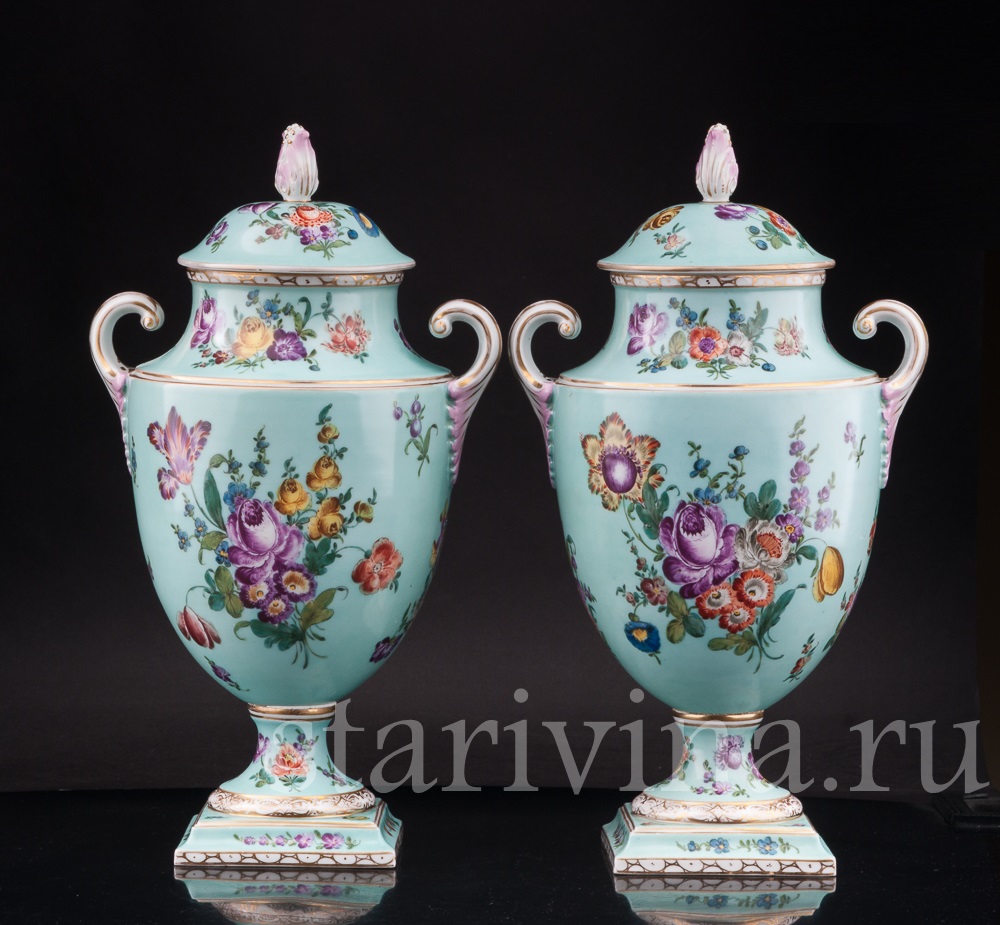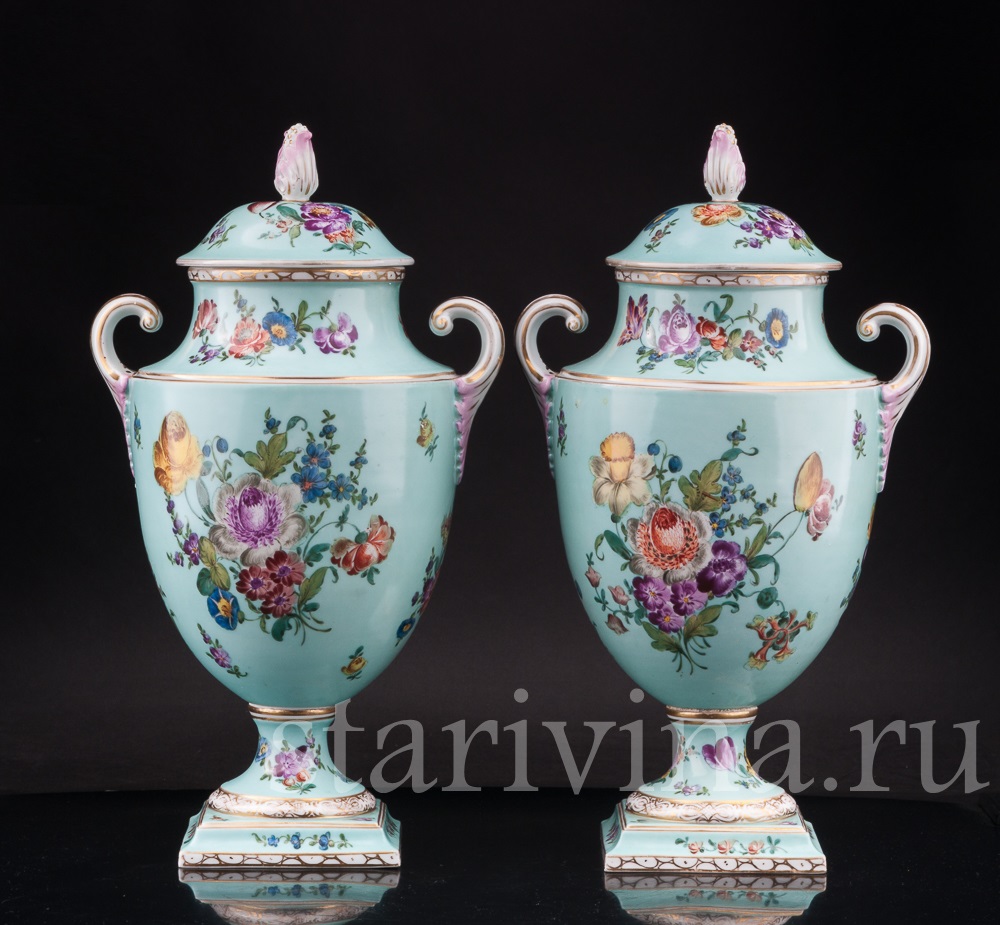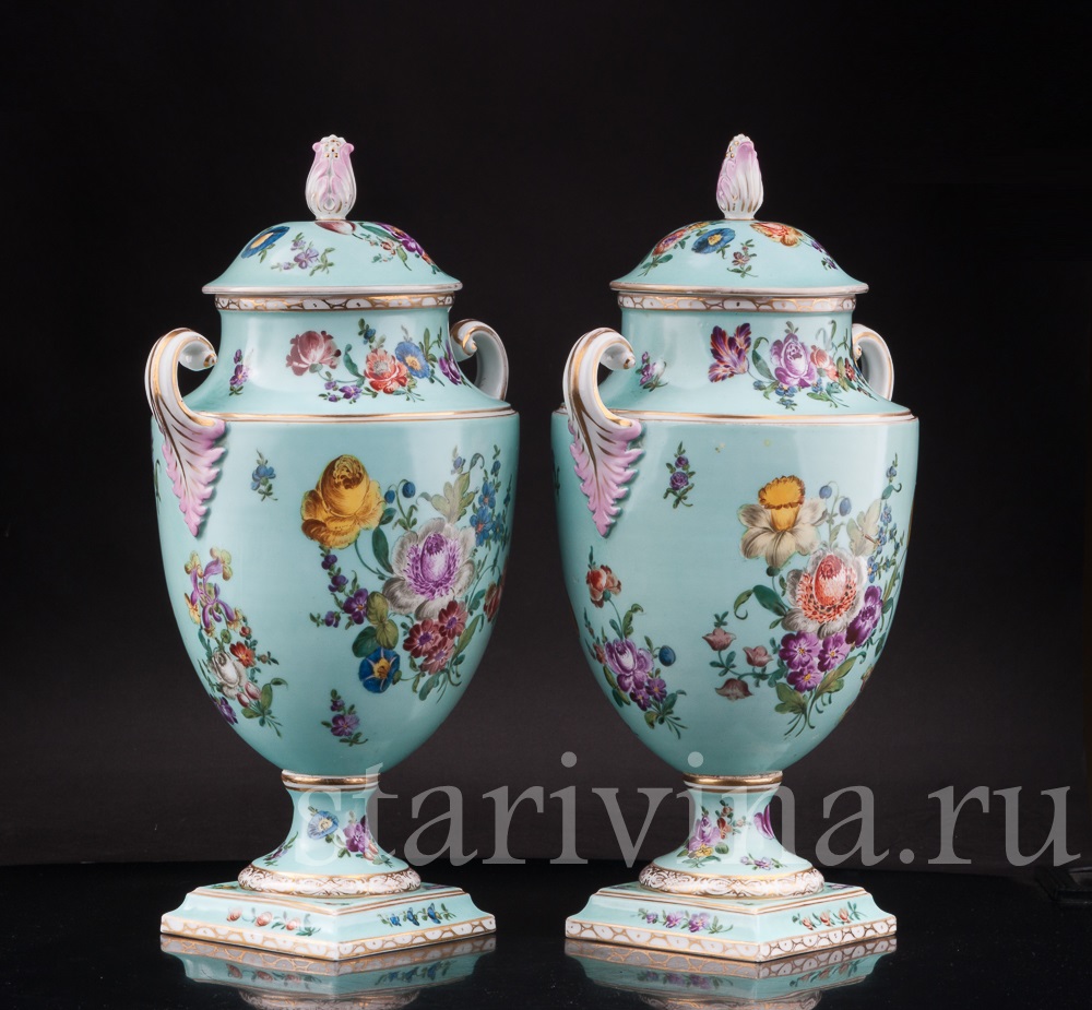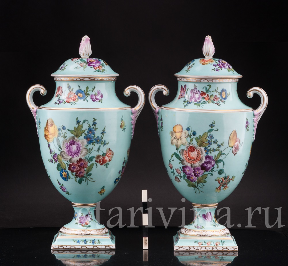 Две роскошные, антикварные фарфоровые вазы с крышками созданы на мануфактуре Helena Wolfsohn в 70-х годах 19 века. Это производство хорошо известно коллекционерам, благодаря своей истории. Начав как последователи фабрики Meissen, они стали специализироваться на росписи заготовок других фарфоровых заводов, достигнув в этом высочайшего мастерства и создавая действительно высококлассные предметы, которые особенно ценятся на антикварном рынке благодаря своей редкости.