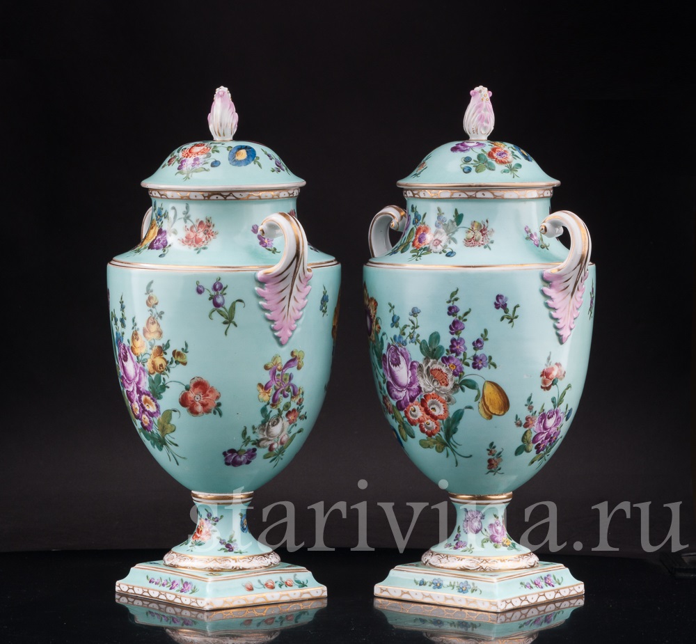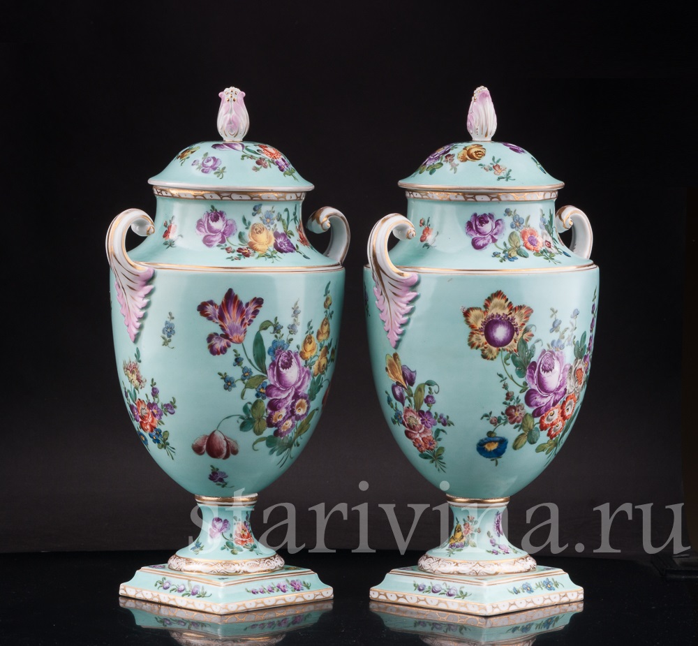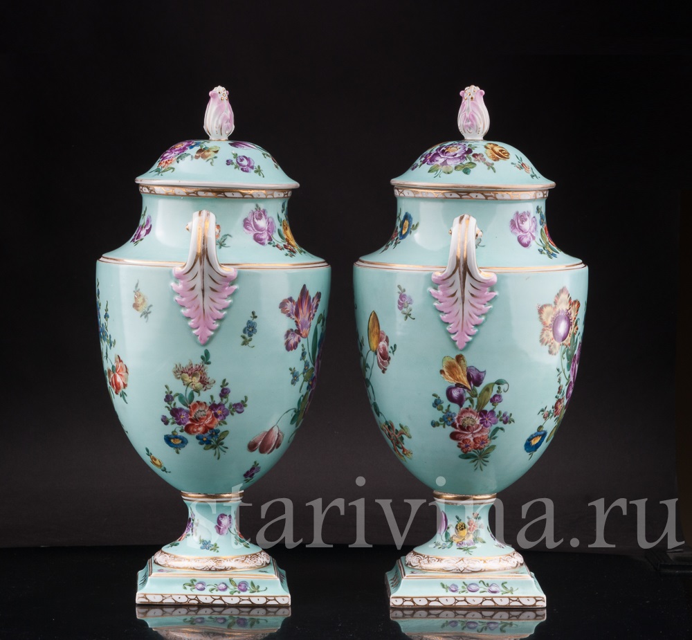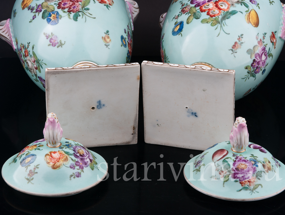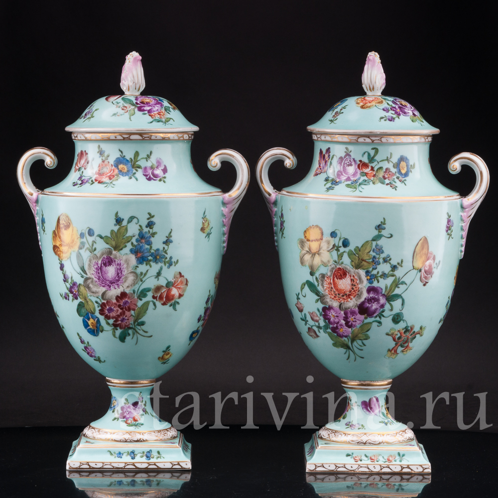 Две роскошные, антикварные фарфоровые вазы с крышками созданы на мануфактуре Helena Wolfsohn в 70-х годах 19 века. Это производство хорошо известно коллекционерам, благодаря своей истории. Начав как последователи фабрики Meissen, они стали специализироваться на росписи заготовок других фарфоровых заводов, достигнув в этом высочайшего мастерства и создавая действительно высококлассные предметы, которые особенно ценятся на антикварном рынке благодаря своей редкости.