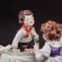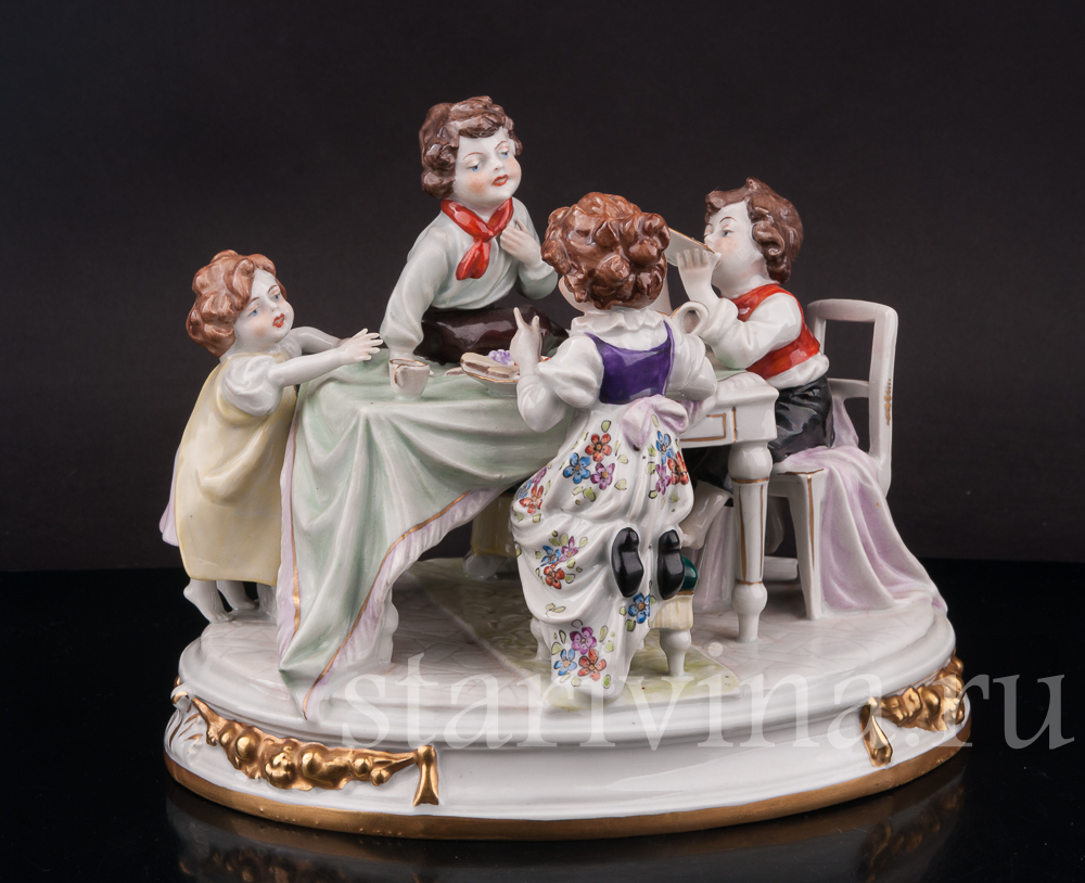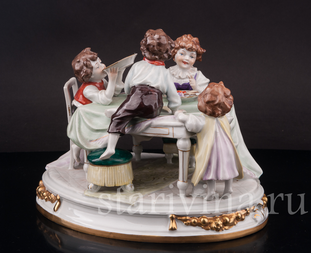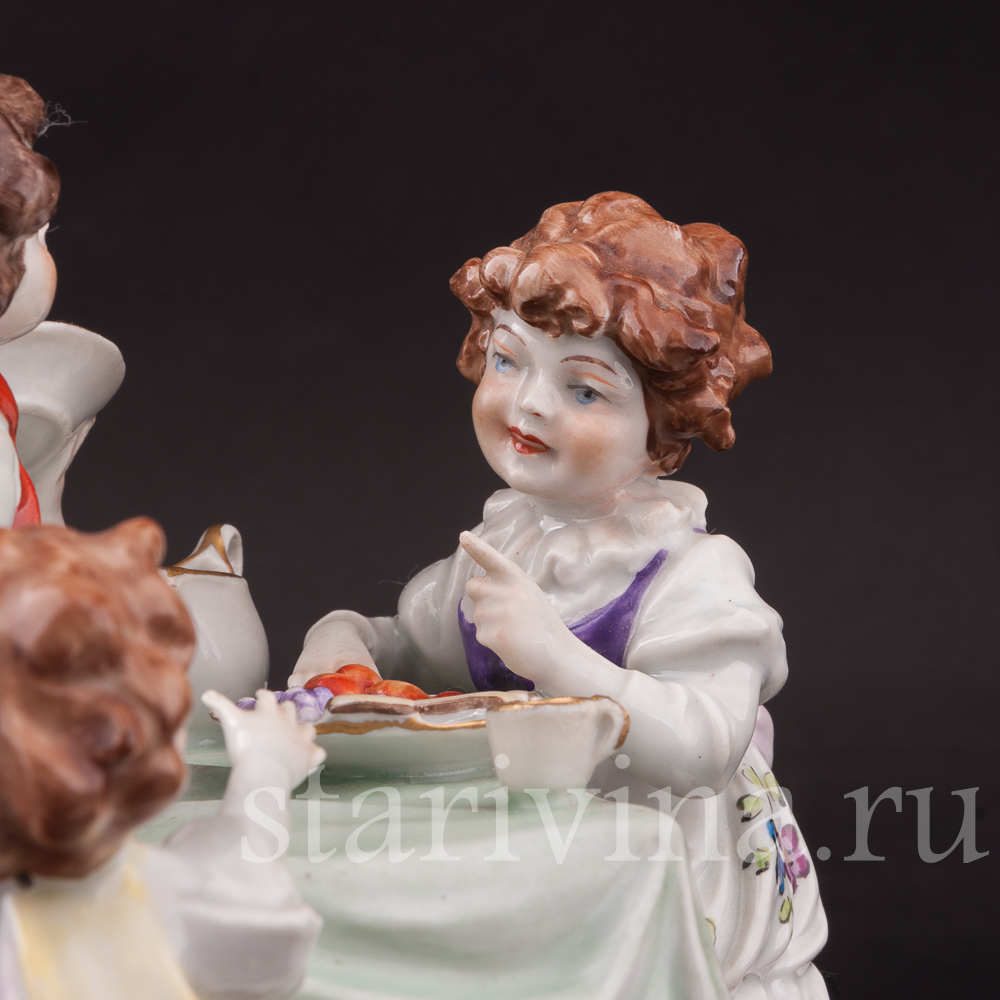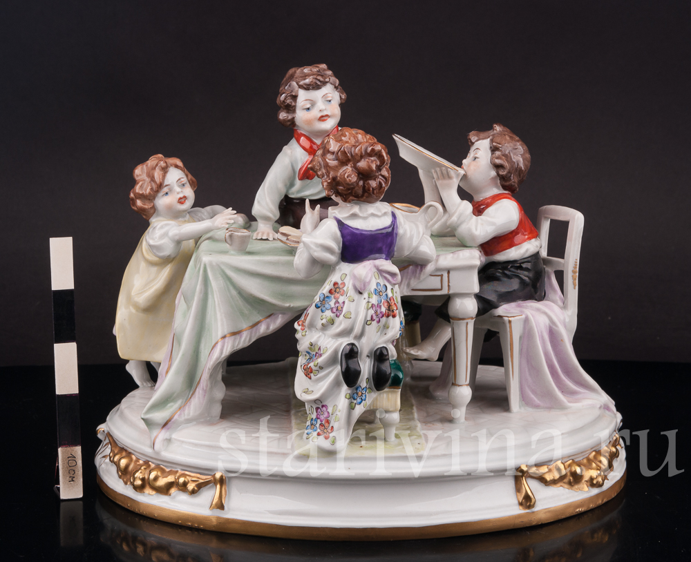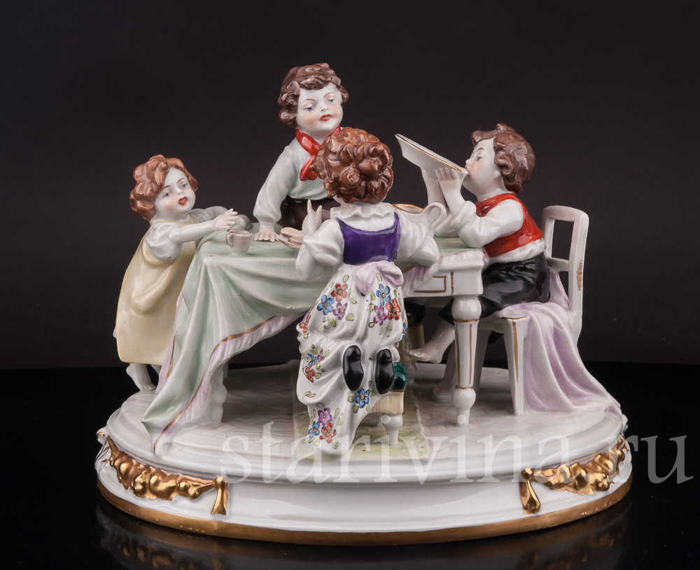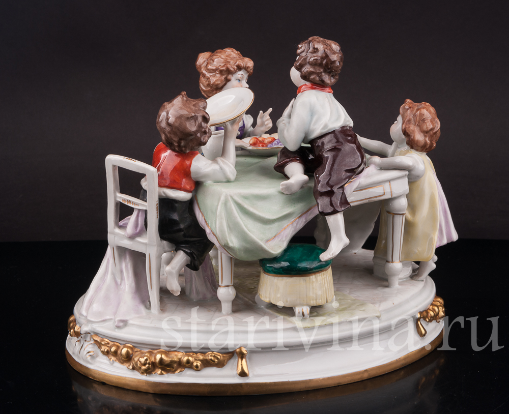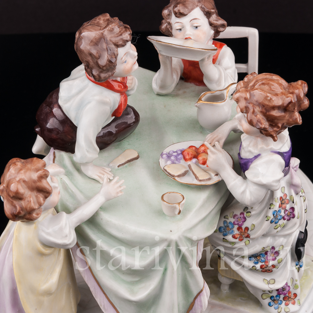 Фарфоровая композиция с детьми, сидящими за столом, создана на фабрике Scheibe-Alsbach, одном из крупнейших старых производств Германии, известном своим высоким качеством изделий и оригинальными моделями.