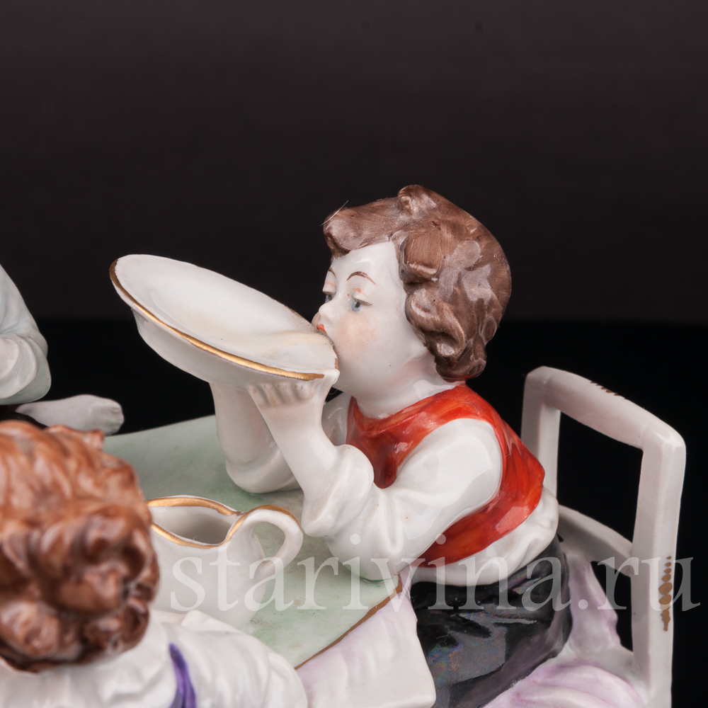 Четверо детей, братья и сестры, собрались за одним столом на завтрак. Как и положено малышам, им не усидеть на месте - мальчишка садится на стол, малышка ходит вокруг, стягивая со стола скатерть. Каждый увлечен чем-то, но главное, они вместе за одним столом. Небольшие, но продуманные детали наполняют композицию ощущением уюта, жизни и веселья. Нежная, светлая роспись с яркими акцентами придает фигурам особую прелесть.