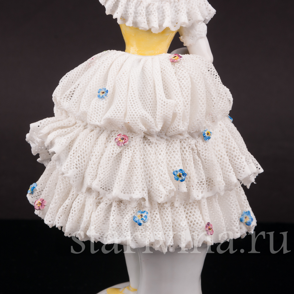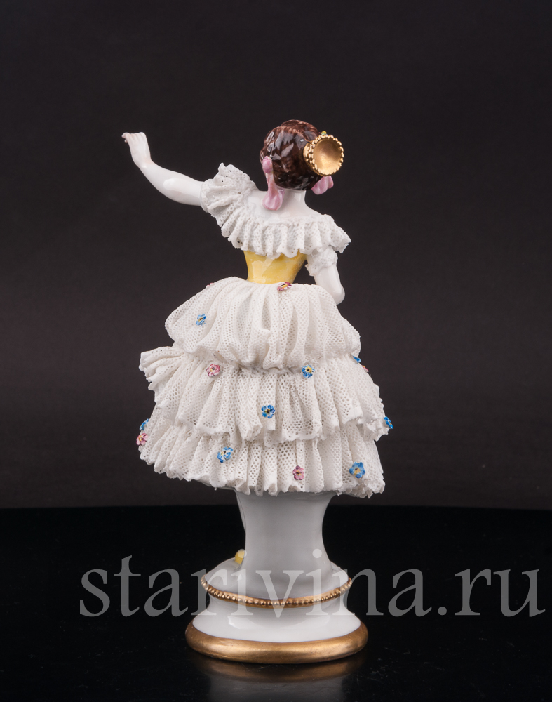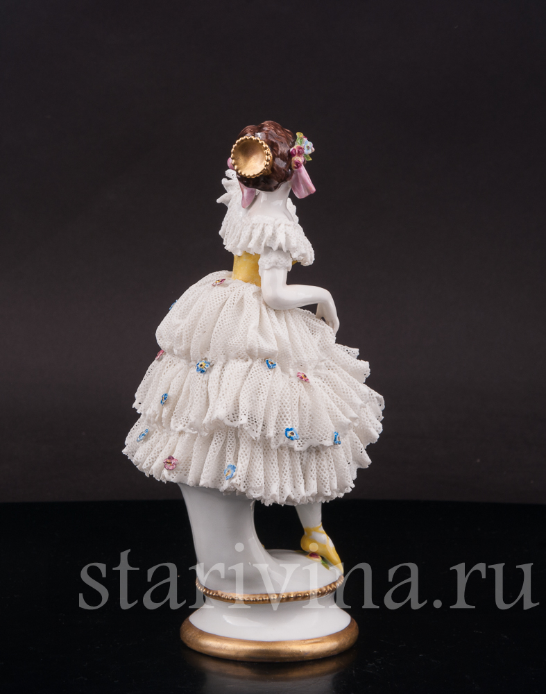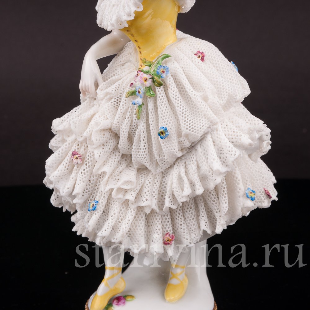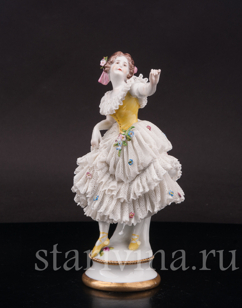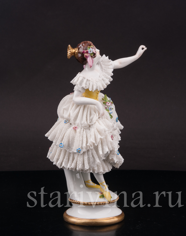 Изящная, старинная кружевная статуэтка танцовщицы родом из знаменитого фарфорового центра Германии – Volkstedt. Именно кружевной фарфор стал визитной карточкой этого прославленного производства.