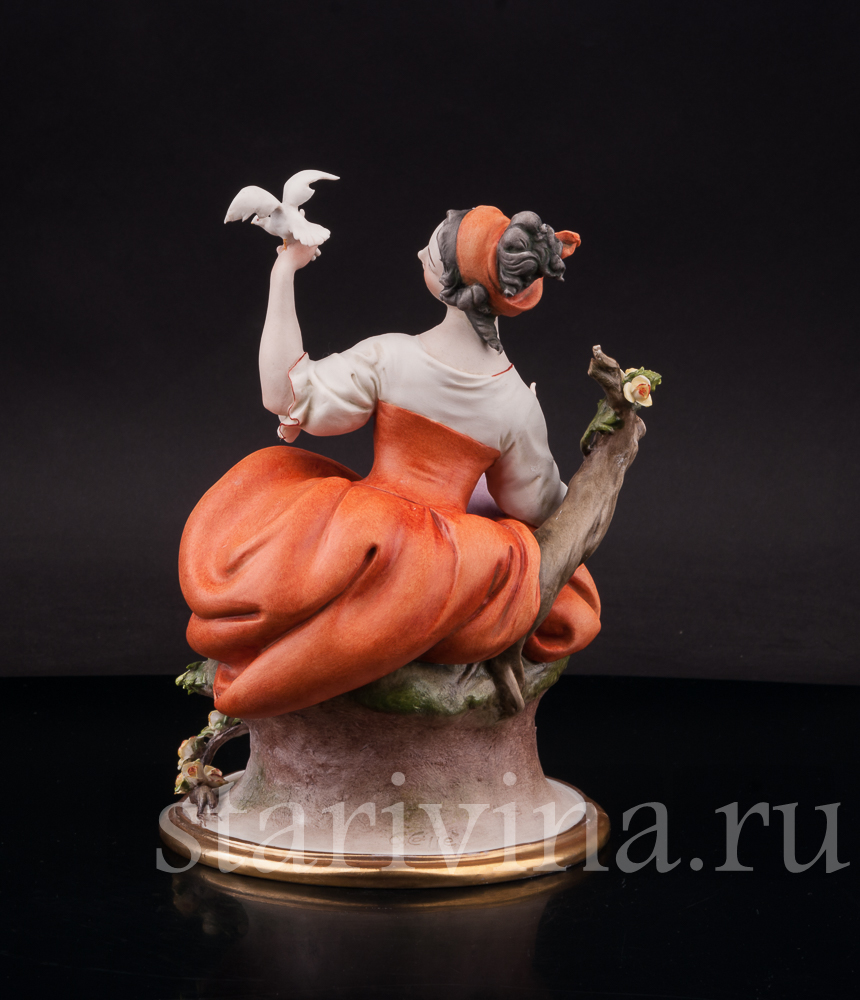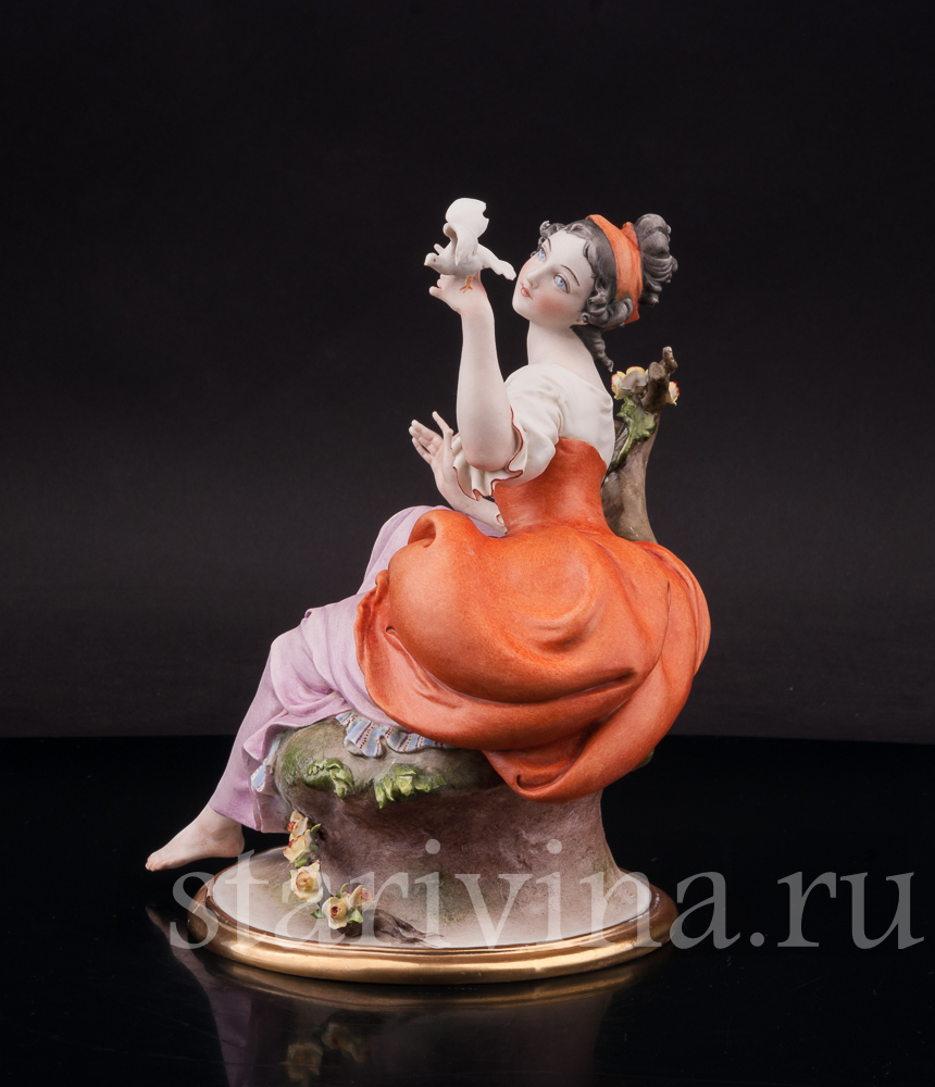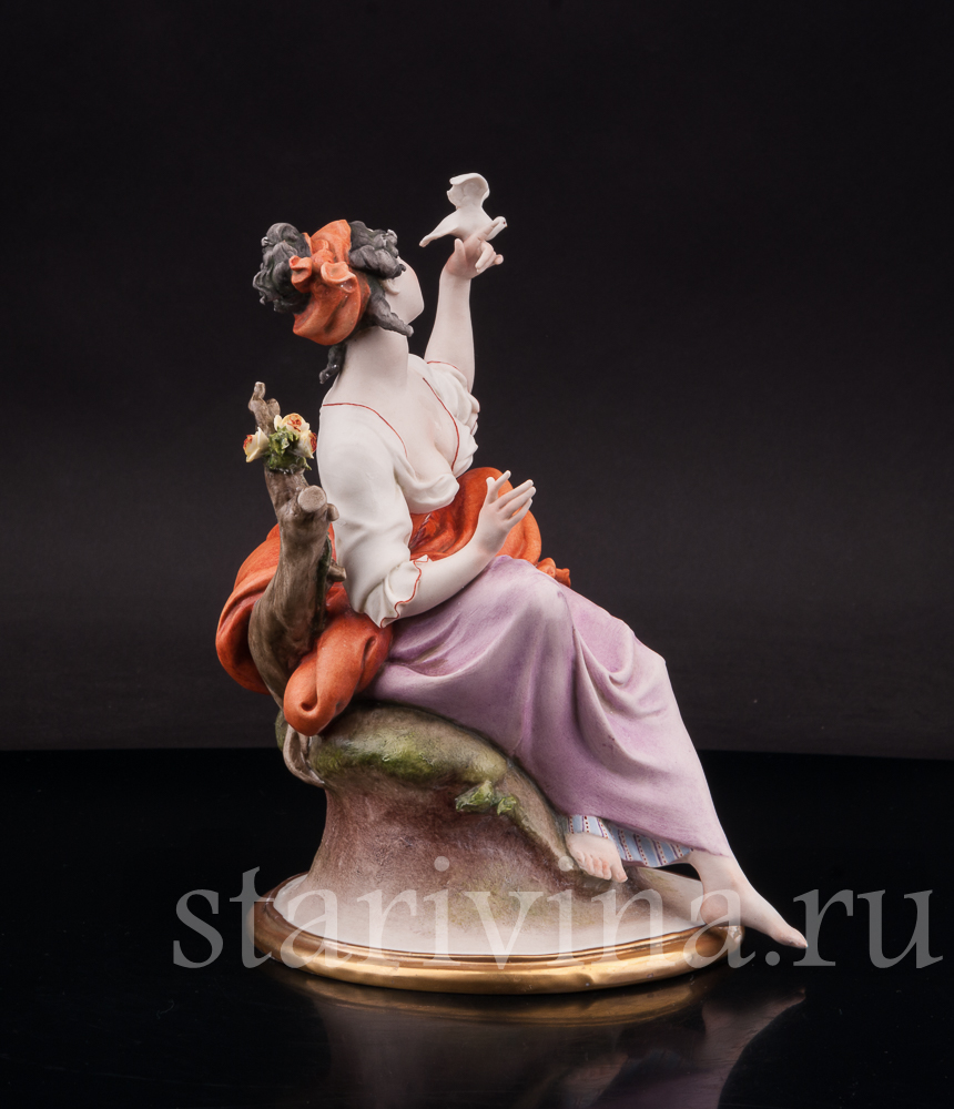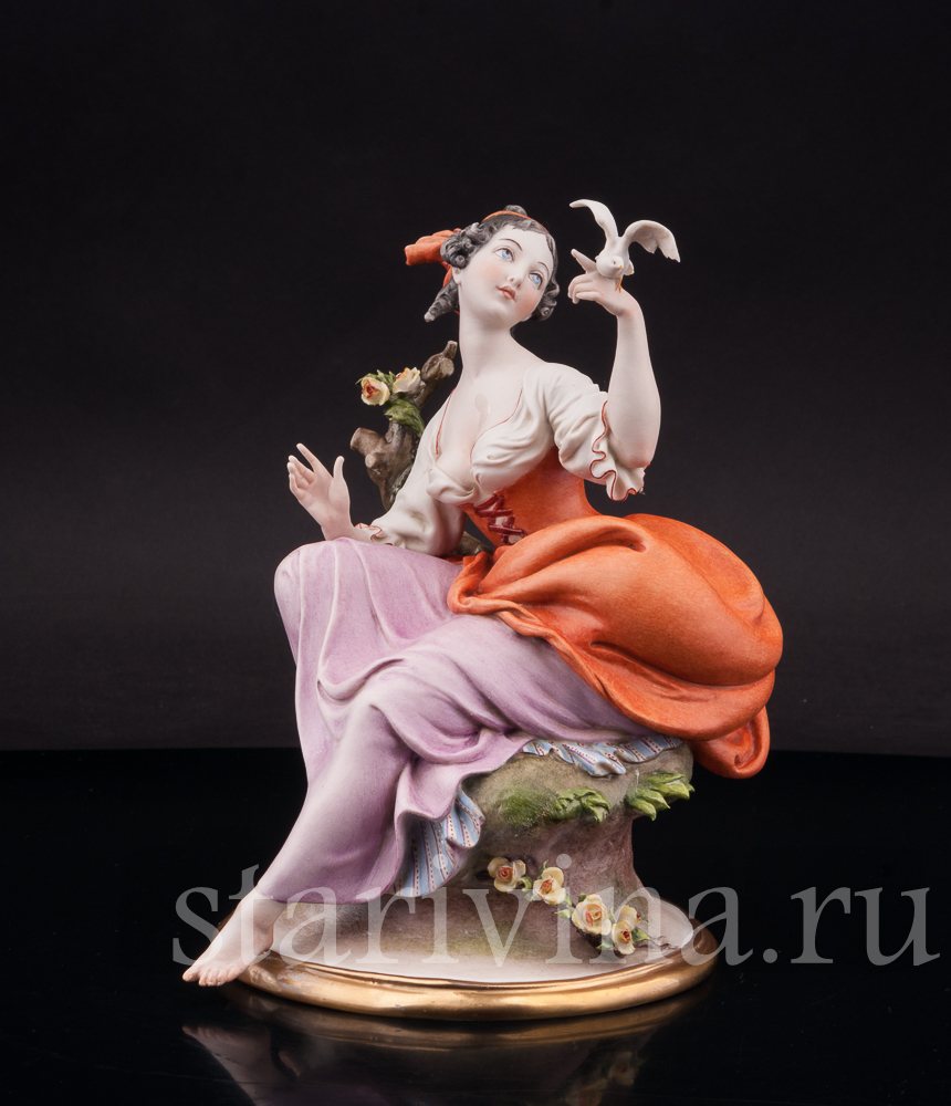 Невероятно изящная, романтичная девушка сидит на цветочной поляне, разглядывая белоснежную голубку, севшую к ней на руку. Очертания тела девушки подчеркнуто женственные, белая кожа будто придает образу эфемерность, словно у лесной нимфы. Легкость образа складывается из тщательно продуманных и проработанных деталей, отличающих статуэтки итальянской школы. Чудесна роспись с переливами интенсивности цвета, мягко ложащаяся на бисквитный, неглазурованный фарфор.