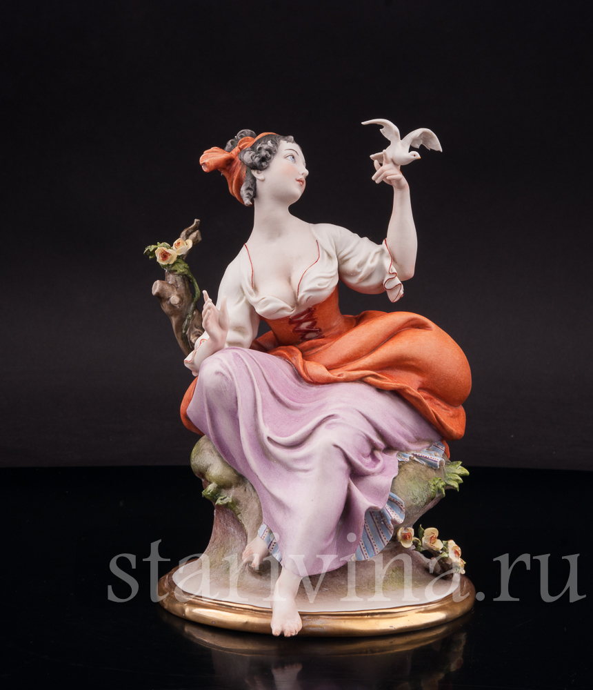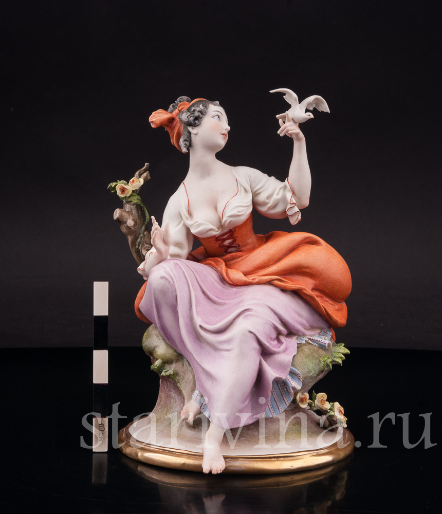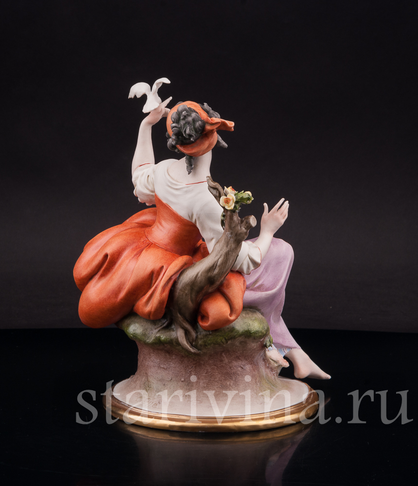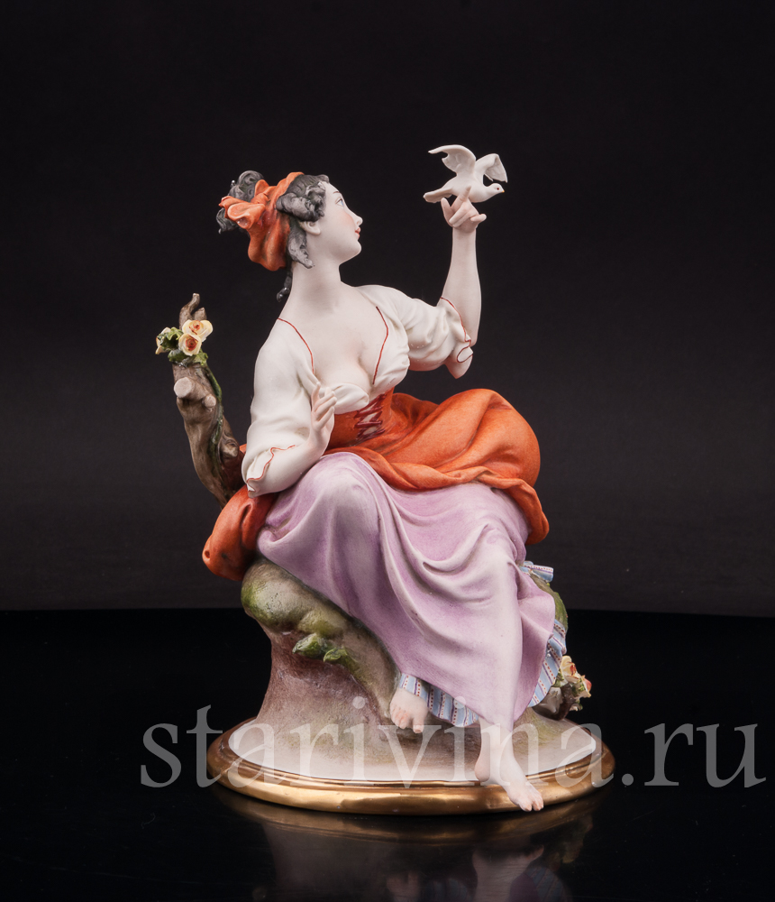 Невероятно изящная, романтичная девушка сидит на цветочной поляне, разглядывая белоснежную голубку, севшую к ней на руку. Очертания тела девушки подчеркнуто женственные, белая кожа будто придает образу эфемерность, словно у лесной нимфы. Легкость образа складывается из тщательно продуманных и проработанных деталей, отличающих статуэтки итальянской школы. Чудесна роспись с переливами интенсивности цвета, мягко ложащаяся на бисквитный, неглазурованный фарфор.