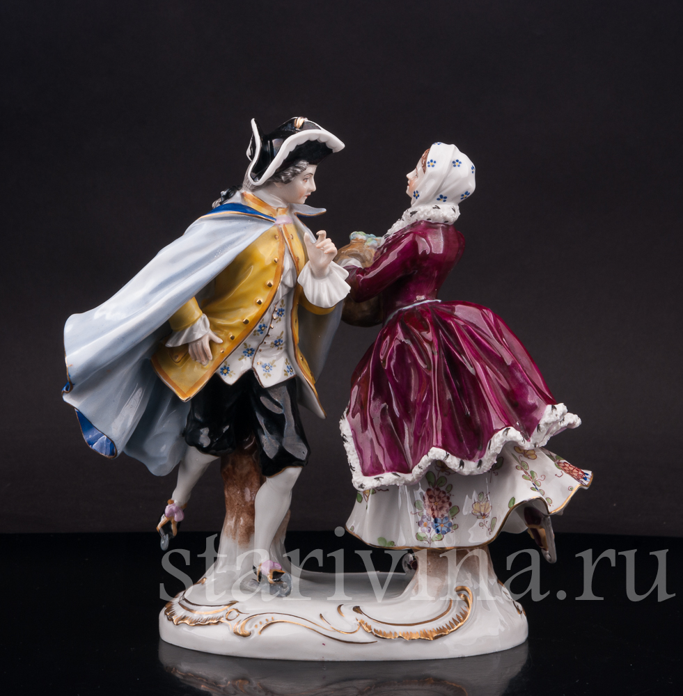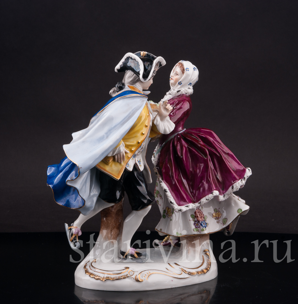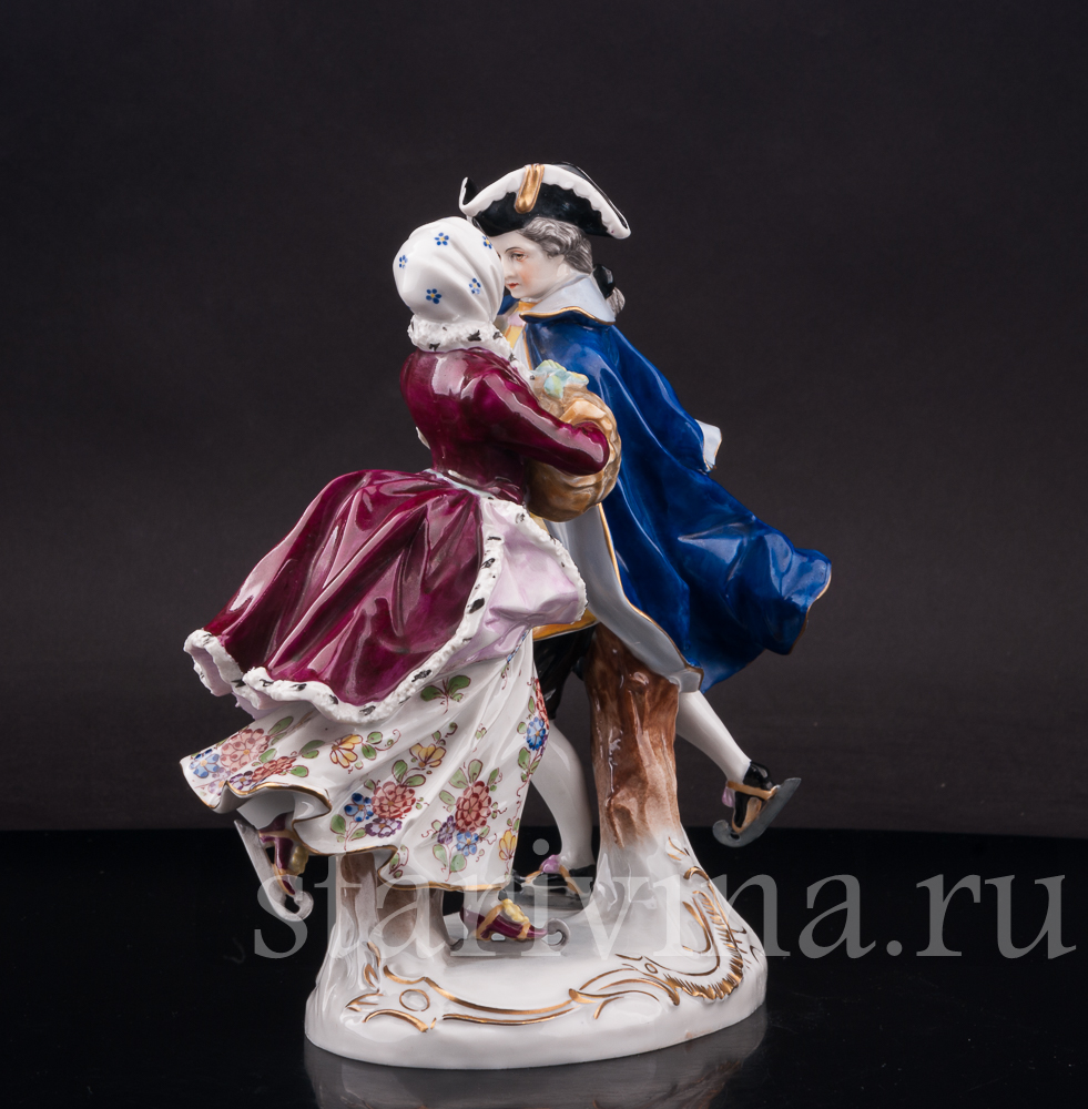 Старинная статуэтка, изображающая галантную пару, катающуюся на коньках, создана в начале 20 века на фарфоровой мануфактуре в городе Фолькштедт. Дама одета в бордовую шубу, подбитую собольим мехом, руки она прячет в меховой муфте. Кавалер в щегольском камзоле жёлтом, треуголке и коротком синем плаще изящно поднял руку, проезжая мимо своей пассии. Катание на коньках — одно из излюбленных зимних развлечений, а фигурку можно считать аллегорией зимы.