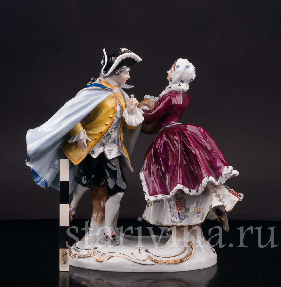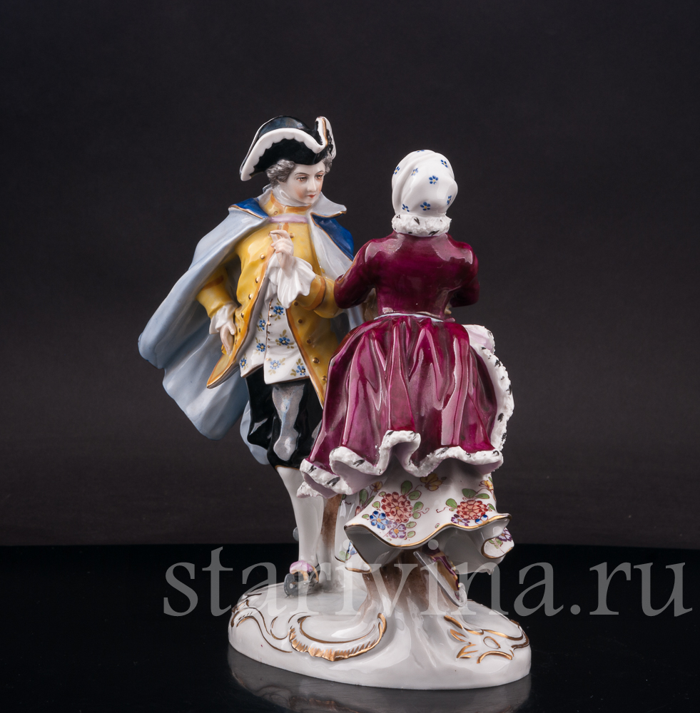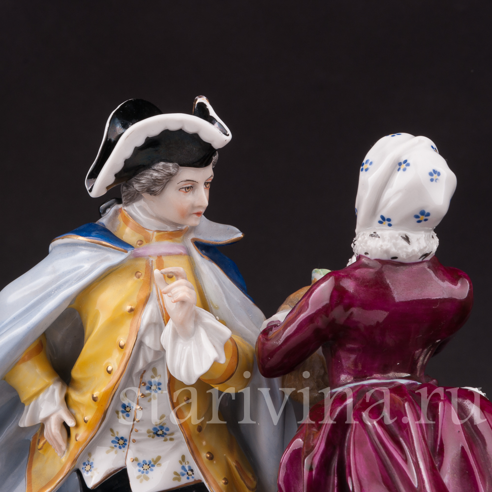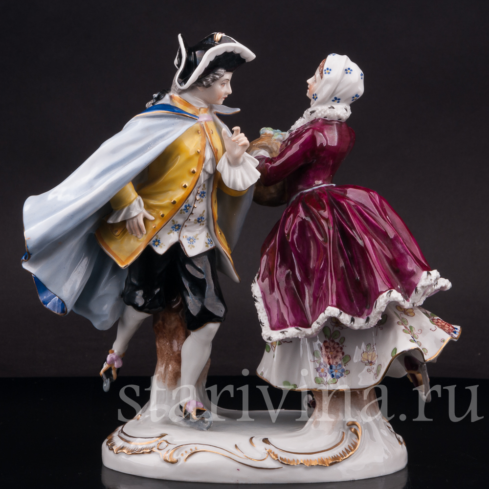 Старинная статуэтка, изображающая галантную пару, катающуюся на коньках, создана в начале 20 века на фарфоровой мануфактуре в городе Фолькштедт. Дама одета в бордовую шубу, подбитую собольим мехом, руки она прячет в меховой муфте. Кавалер в щегольском камзоле жёлтом, треуголке и коротком синем плаще изящно поднял руку, проезжая мимо своей пассии. Катание на коньках — одно из излюбленных зимних развлечений, а фигурку можно считать аллегорией зимы.