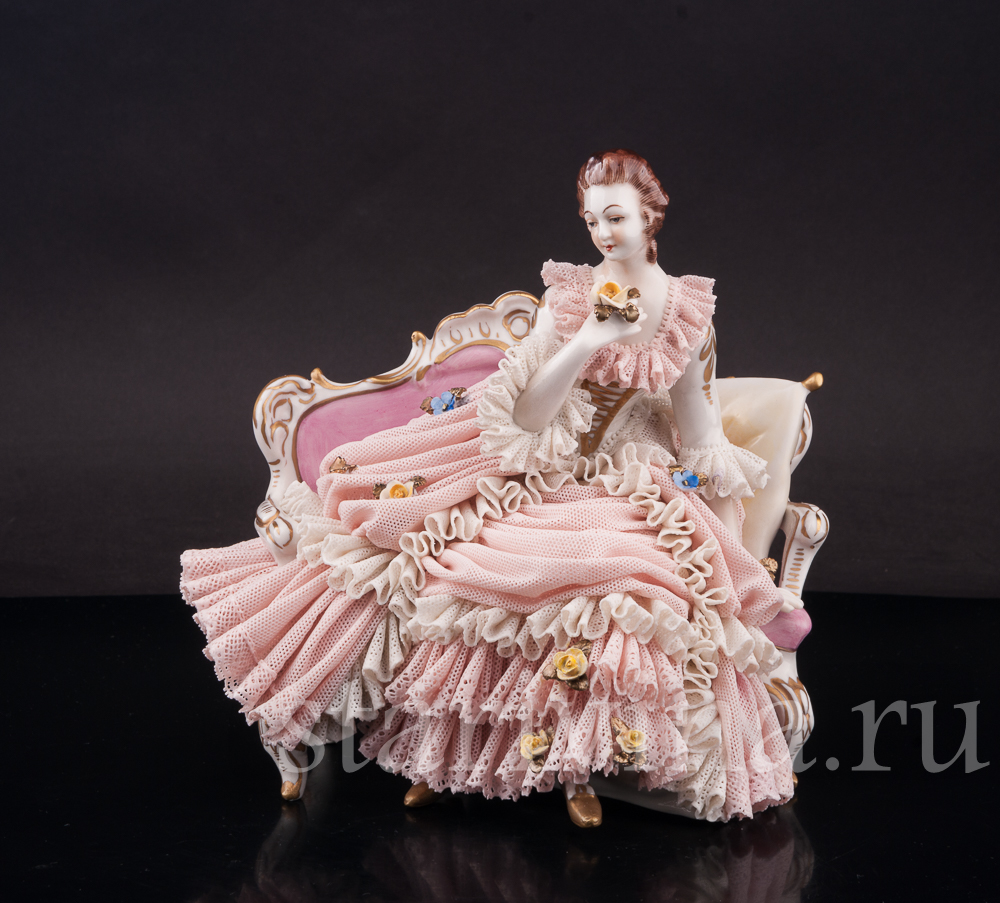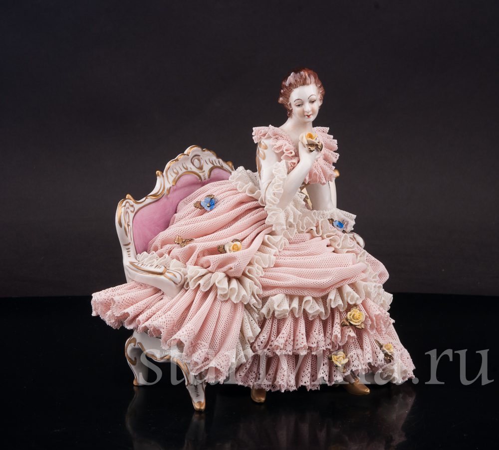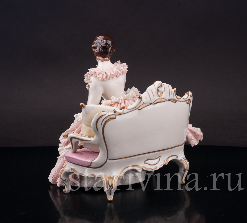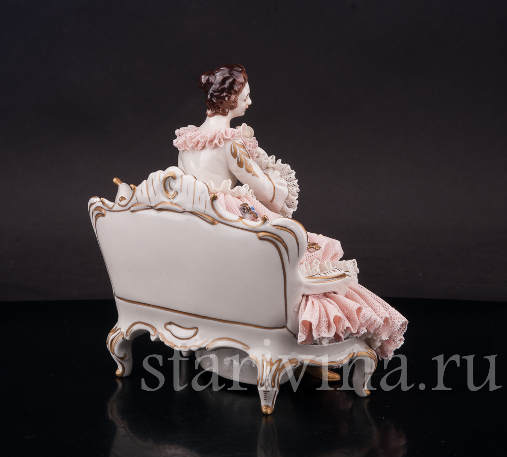Фарфоровая статуэтка Девушка, сидящая на диване, кружевная, Ackermann & Fritze, Германия, нач. 20 в.