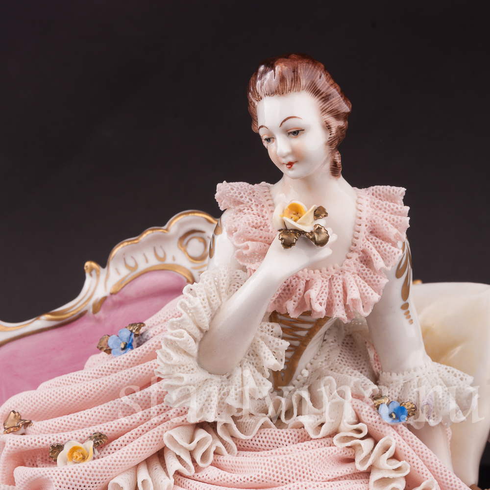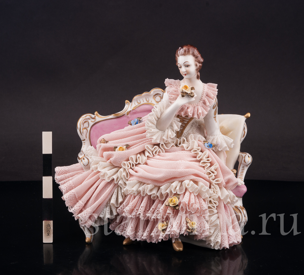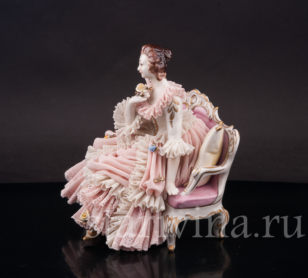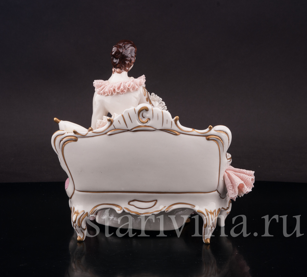 Фарфоровая статуэтка Девушка, сидящая на диване, кружевная, Ackermann & Fritze, Германия, нач. 20 в.