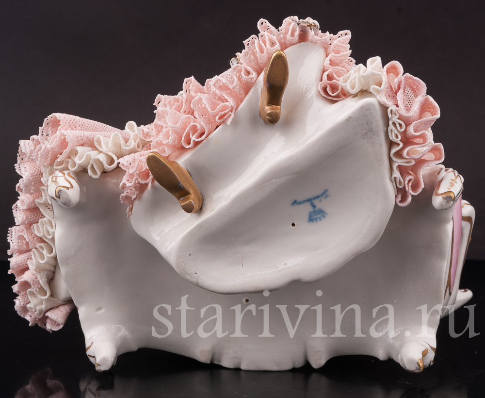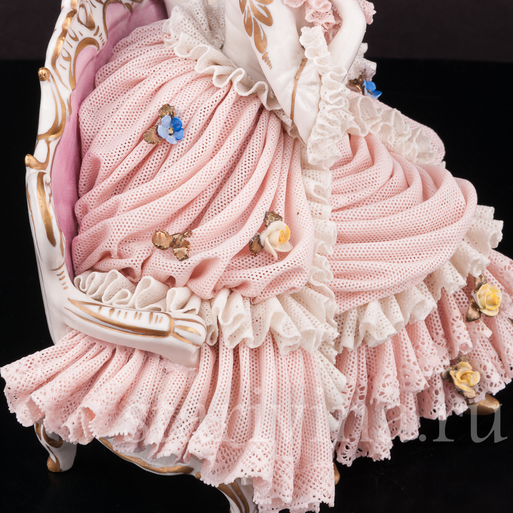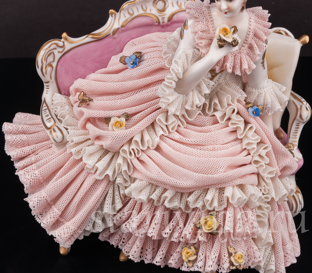 Роскошная кружевная статуэтка дамы, сидящей на диване, создана на фабрике Ackermann & Fritze. Эта мануфактура за недолгое время своего существования, пришедшегося на первую половину 20 века, запомнилась, в том числе, своими кружевными статуэтками в узнаваемом авторском стиле.