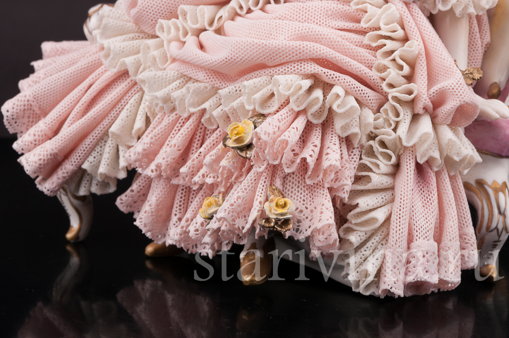 Фарфоровая статуэтка девушки в платье из бело-розового кружева украсит коллекцию антикварного фарфора!
