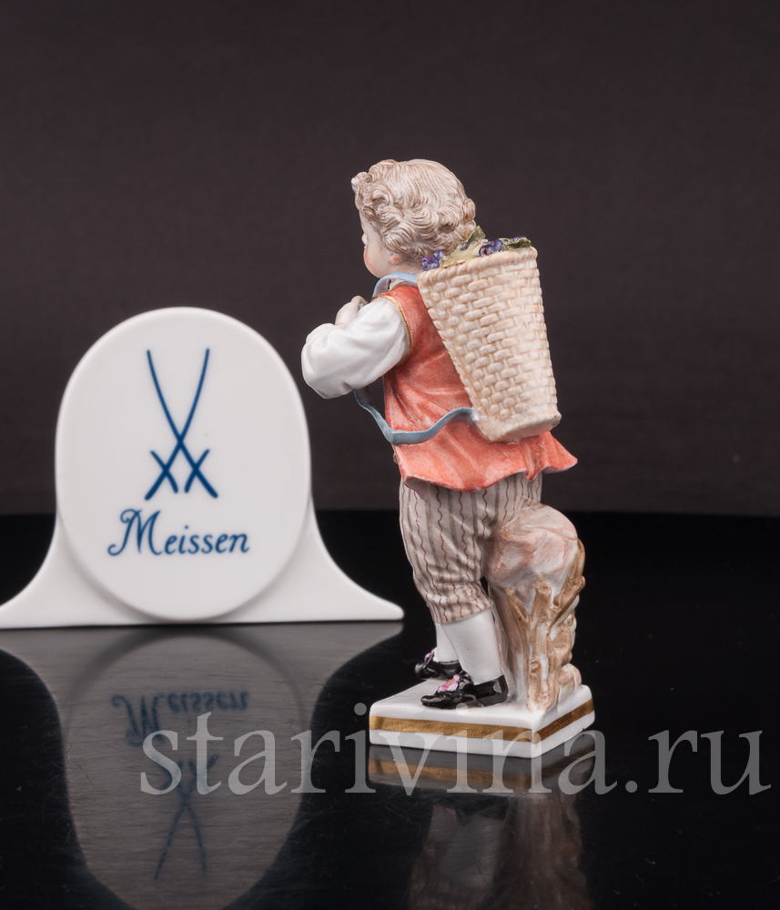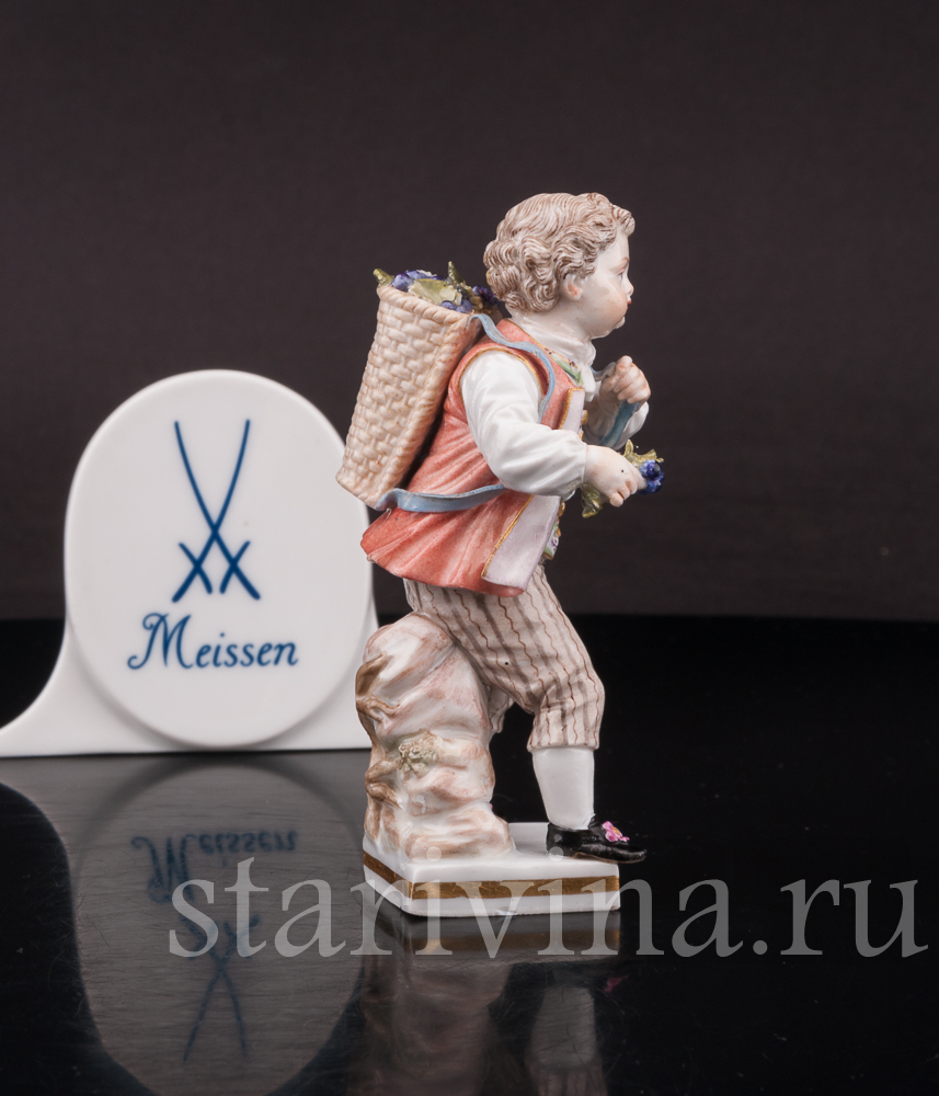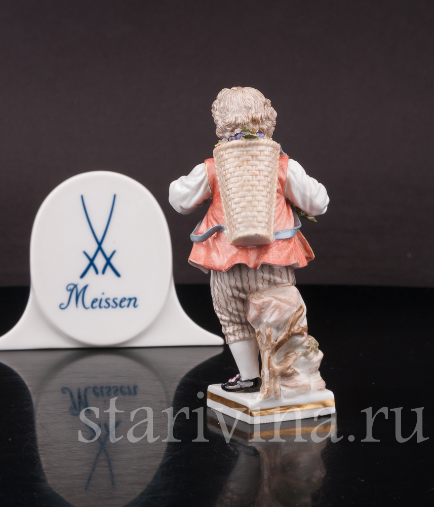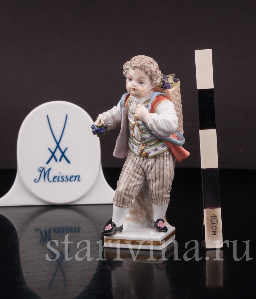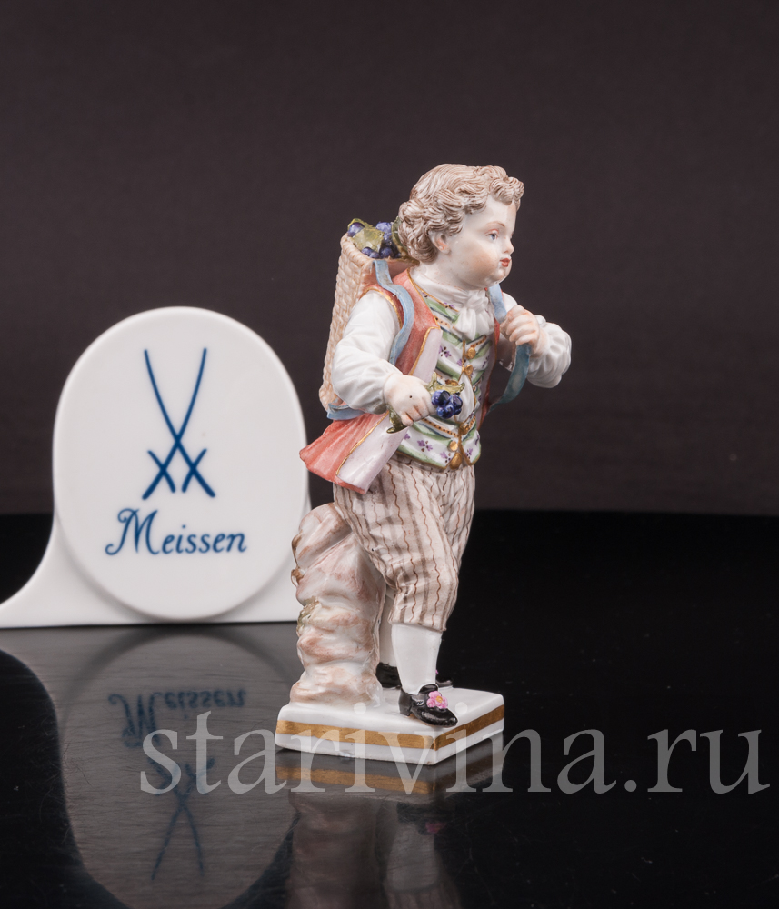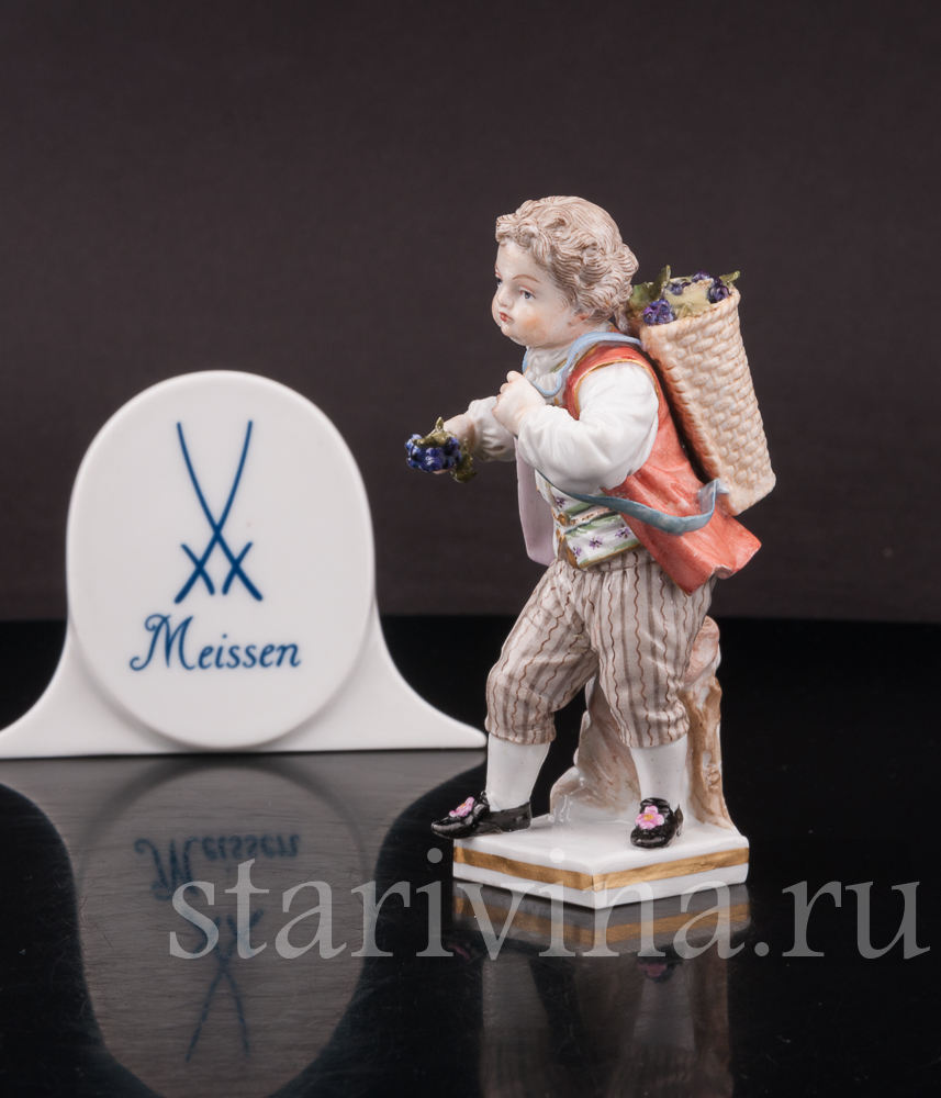 Миниатюрная фигурка мальчика с виноградной корзиной выполнена на фабрике в Мейсене – первой фарфоровой мануфактуре Европы. Статуэтка относится к серии фигурок, изображающей «детей-садовников» – забавных детишек, занимающихся различными работами по саду.