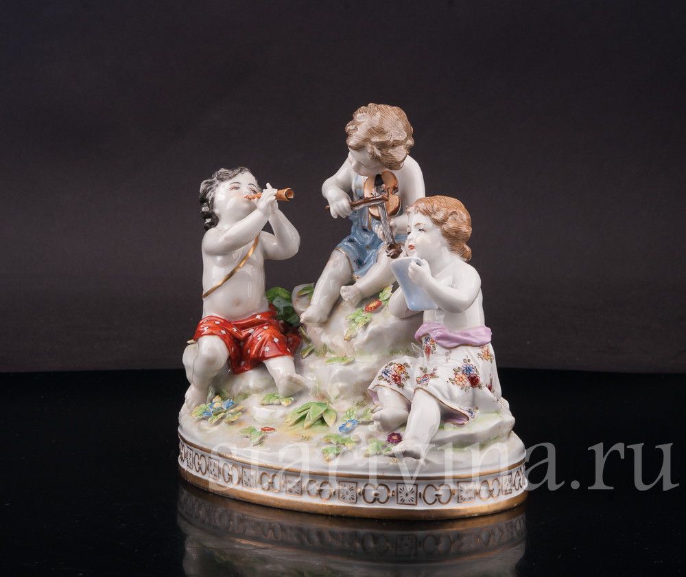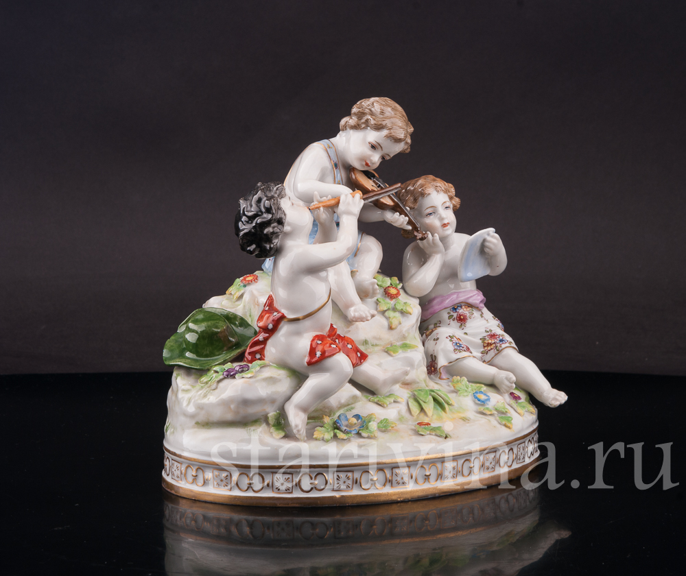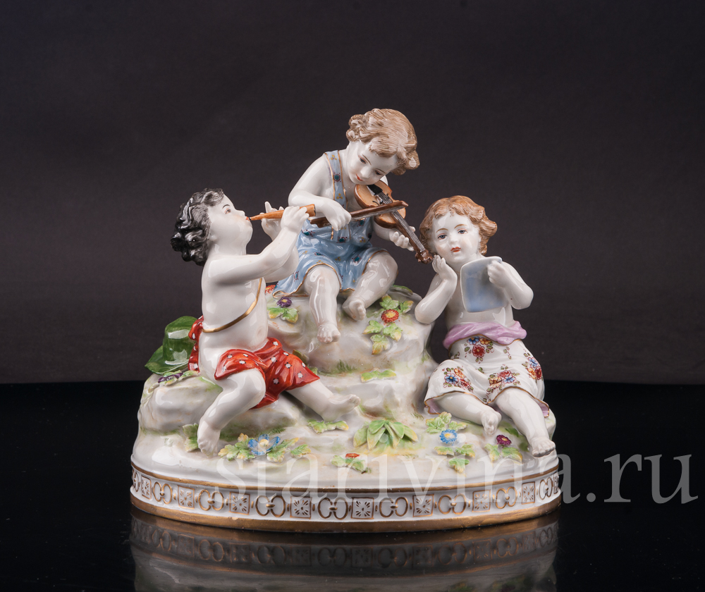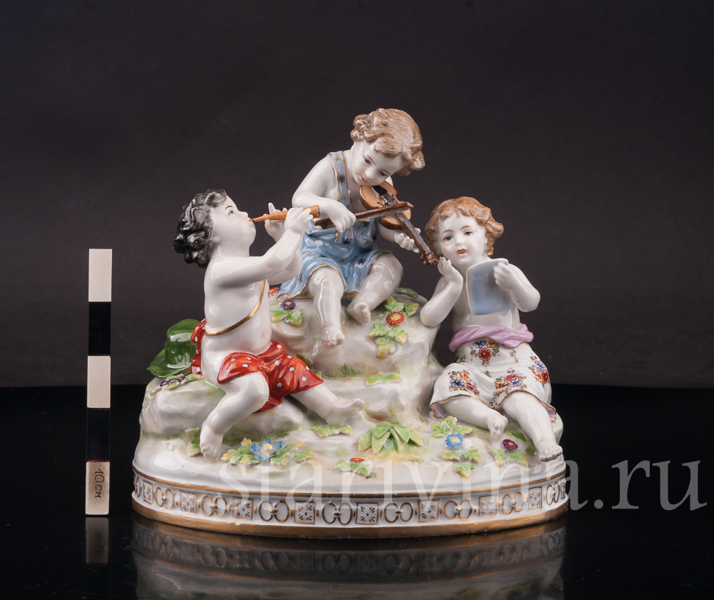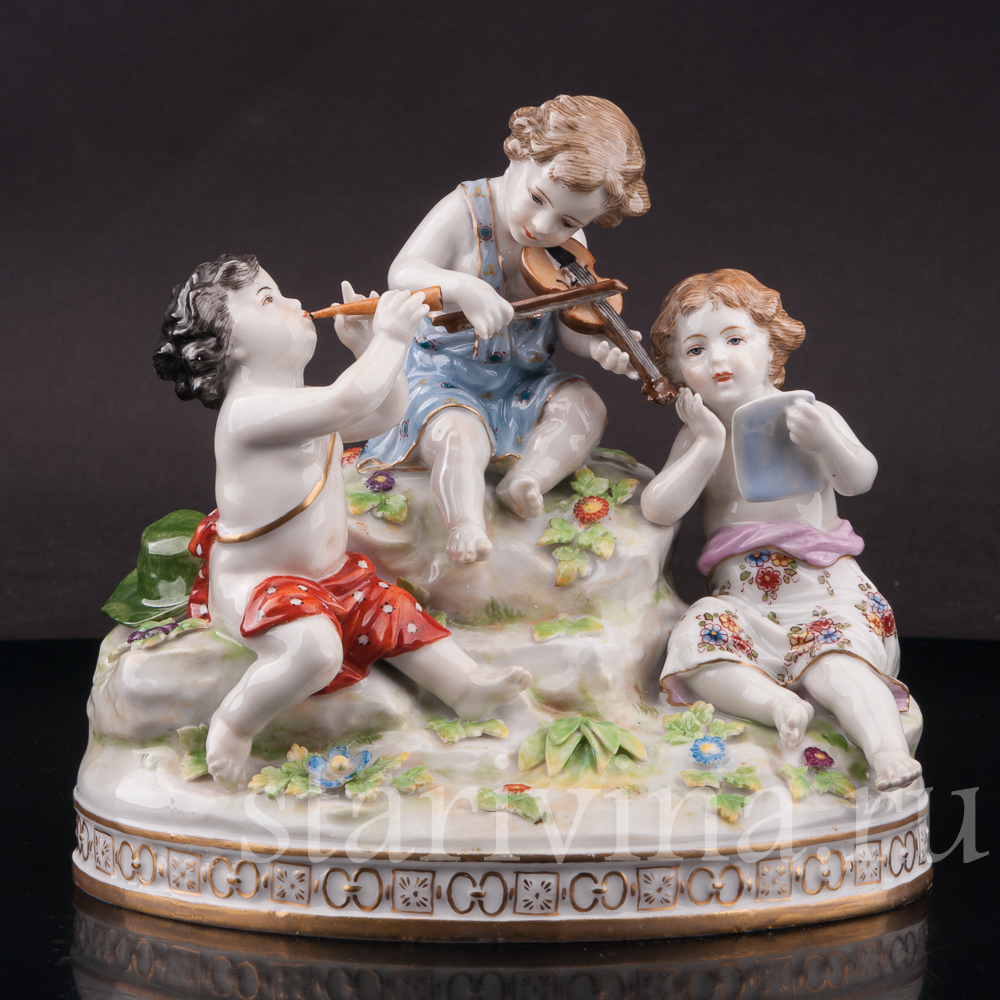 Старинная композиция с малышами, играющими на музыкальных инструментах, создана в крупнейшем фарфоровом центре Германии Volkstedt в начале прошлого века.