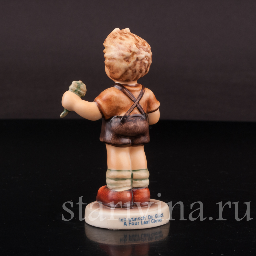 Маленький мальчик протягивает кому-то цветок, желая удачи. Лицо малыша очень выразительно, он широко открыл глаза с густыми ресницами и приоткрыл рот. В его образе столько детского очарования! Теплые оттенки росписи, свойственные фигуркам Хуммель, смотрятся мягко и помогают создать нежный, трогательный образ.