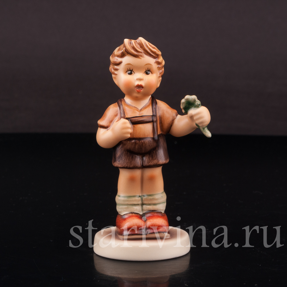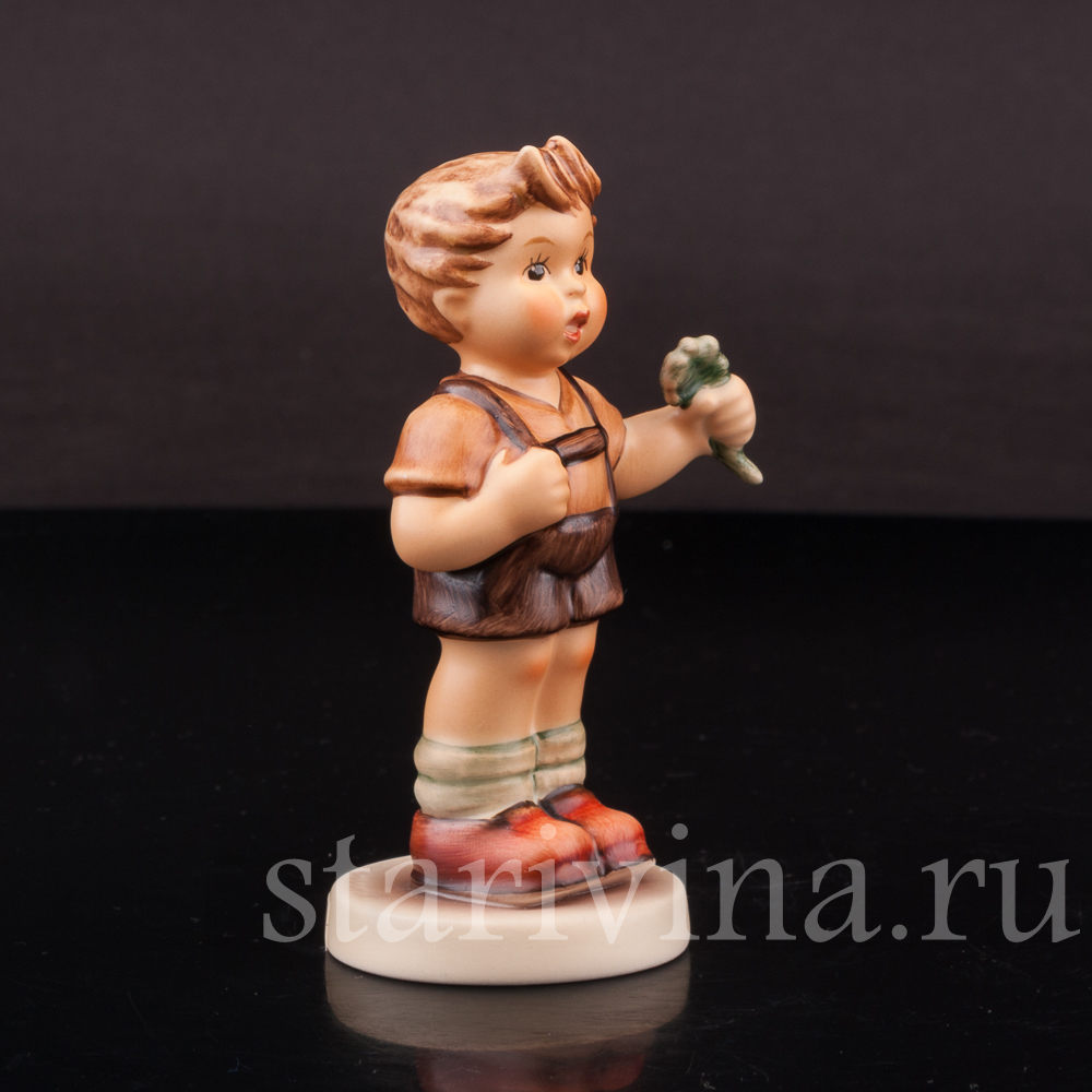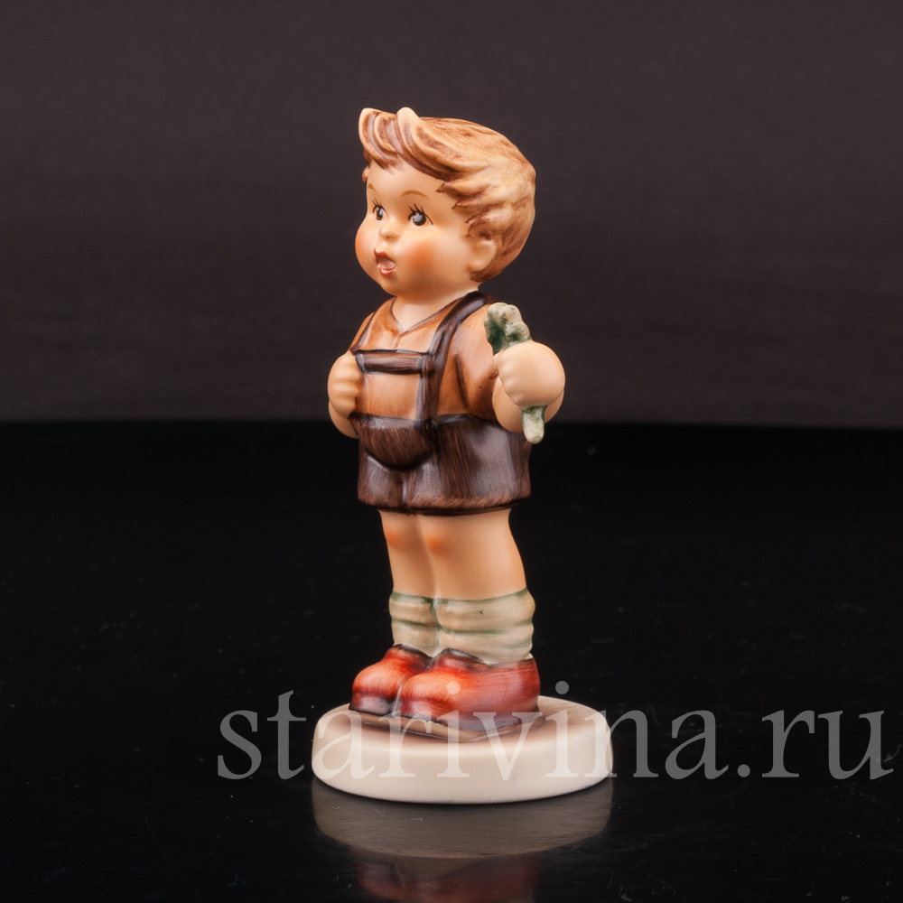Небольшая фигурка мальчика с цветком создана на фабрике Goebel и относится к коллекции авторских детских фигур, созданных по эскизам монахини Марии Иннокентии Хуммель. Серия выпускалась с 1935 года в разных размерах.