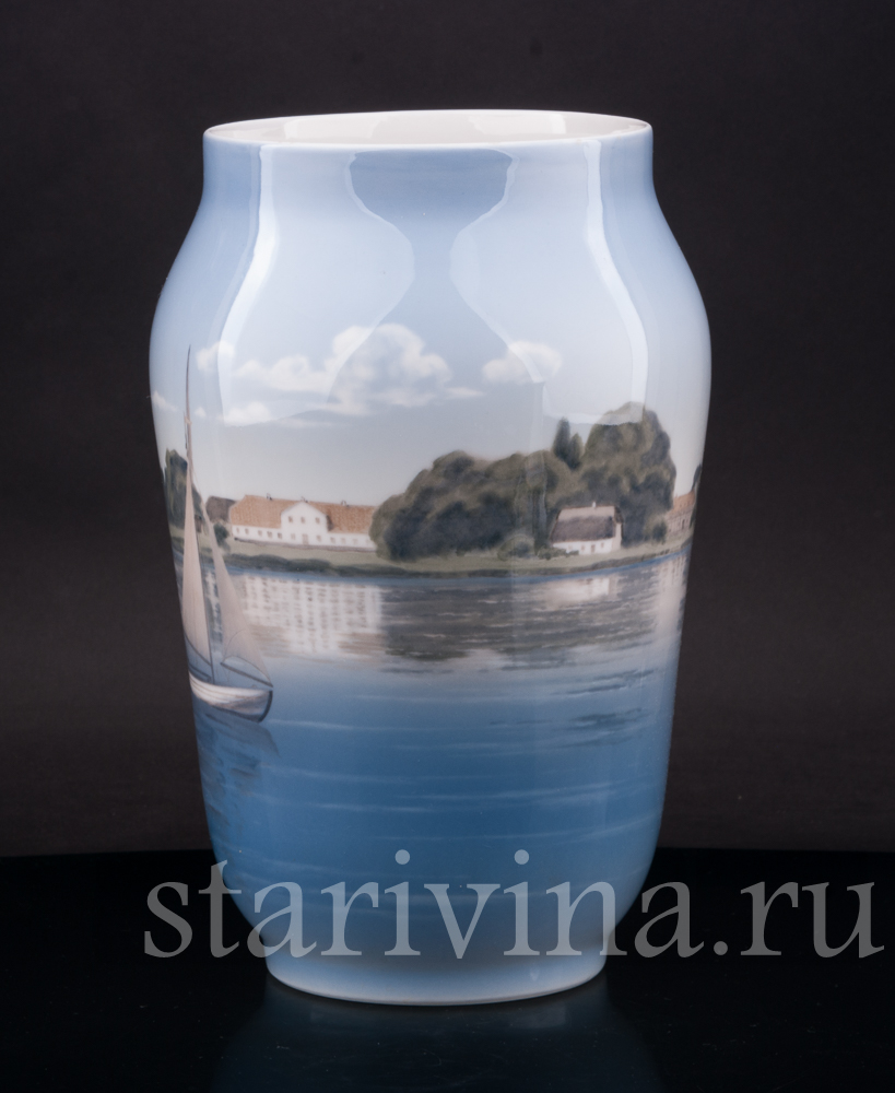 Ваза округлой формы расписана в характерных цветах, используемых датскими мануфактурами. На поверхности вазы нанесено изображение с водным пейзажем. По глади тихого озера в солнечный день плывет небольшой парусник. На берегу стоит особняк и маленькие домики, окруженные густыми деревьями, создающими приятную, радостную атмосферу летнего дня.