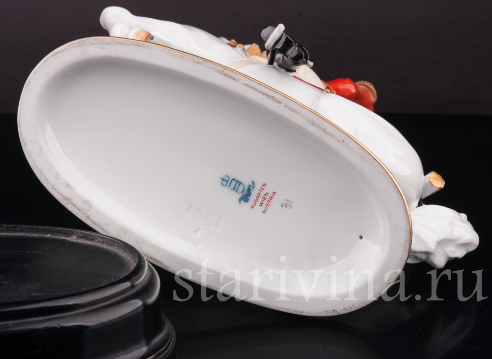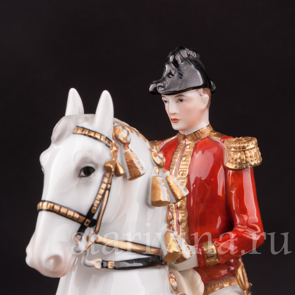 Фигурка сделана очень тщательно и весьма точно передает мельчайшие подробности тела животного, детали сбруи, фигуру и экипировку наездника. Искусная, но вместе с тем строгая полихромная роспись подчеркивает мастерство скульптора, завершая композицию. Статуэтка установлена на деревянный постамент, высота без постамента 23 см.