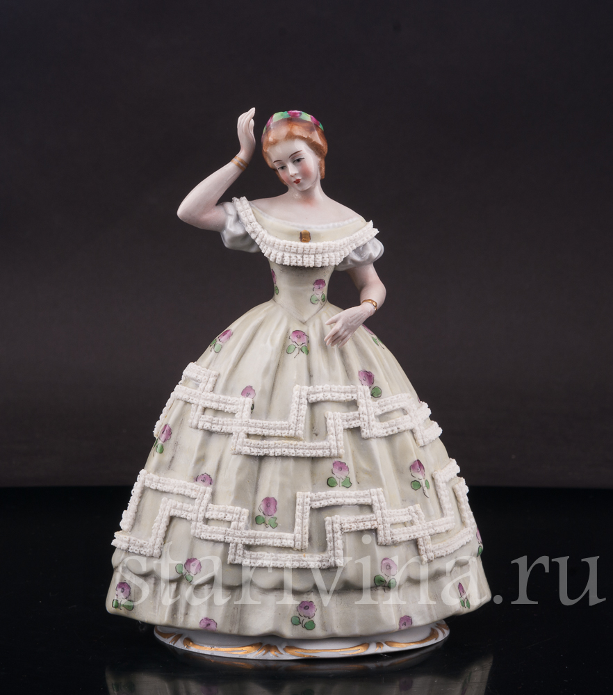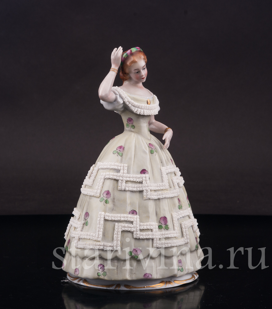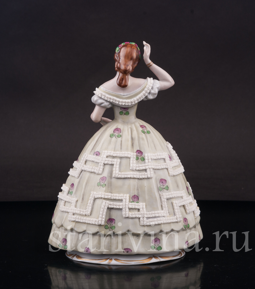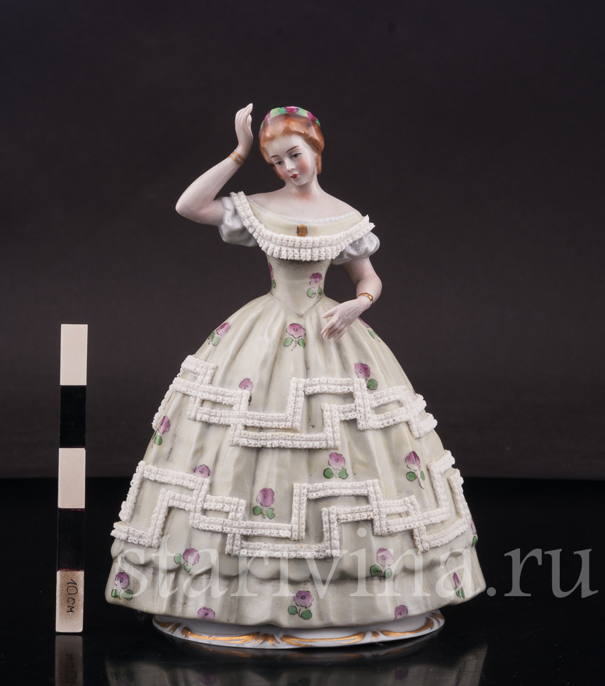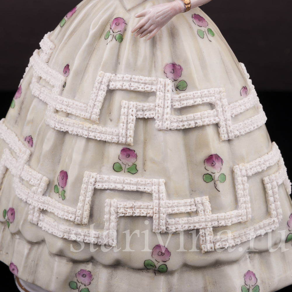 Тонко прорисованная и детализированная фигура отражает сложный стиль одежды и утонченную элегантность давно ушедшей эпохи. Красивая девушка с убранными в элегантную прическу волосами одета в светло-зеленое платье с узором в виде розовых цветов. Поверх широкой юбки нанесены тонкие полоски белого кружева, расположенные свободными геометрическими линиями с прямыми углами. Такое использование кружевных вставок крайне редко можно увидеть в фарфоре, что делает фигуру особенно интересной для коллекционеров.