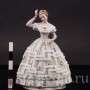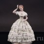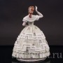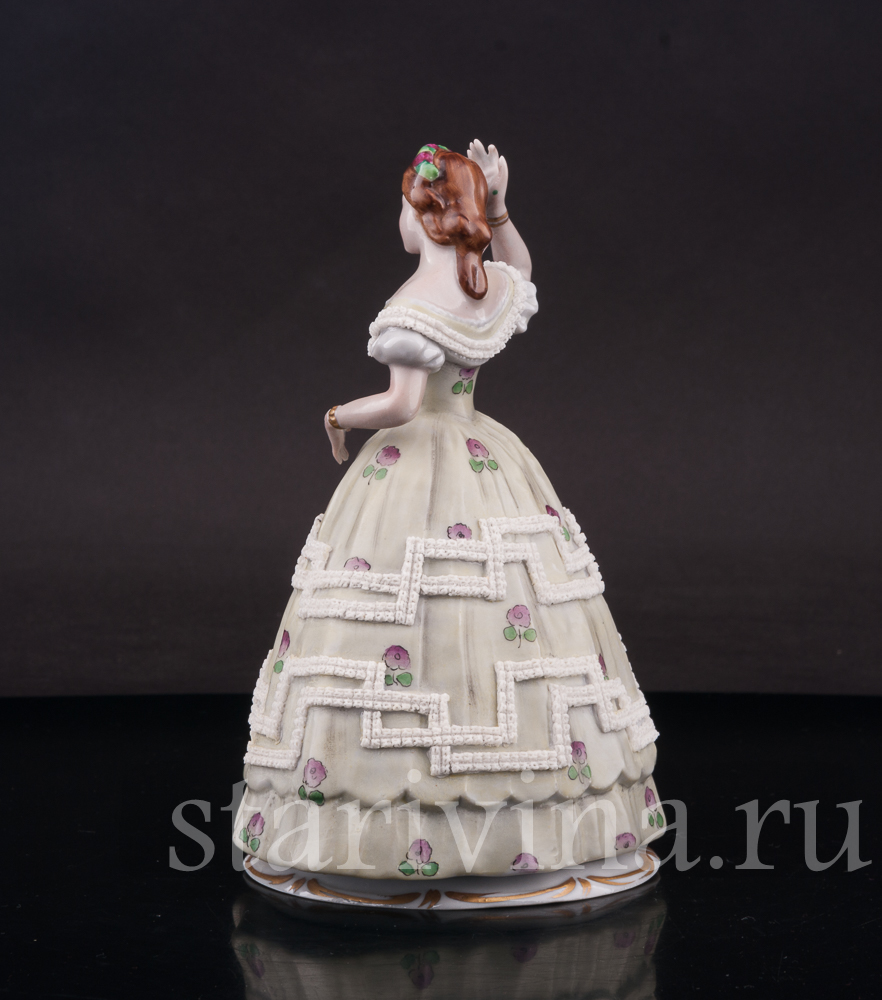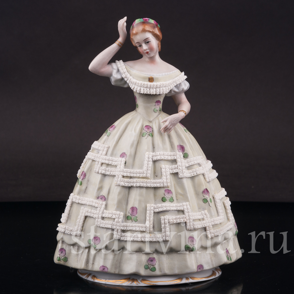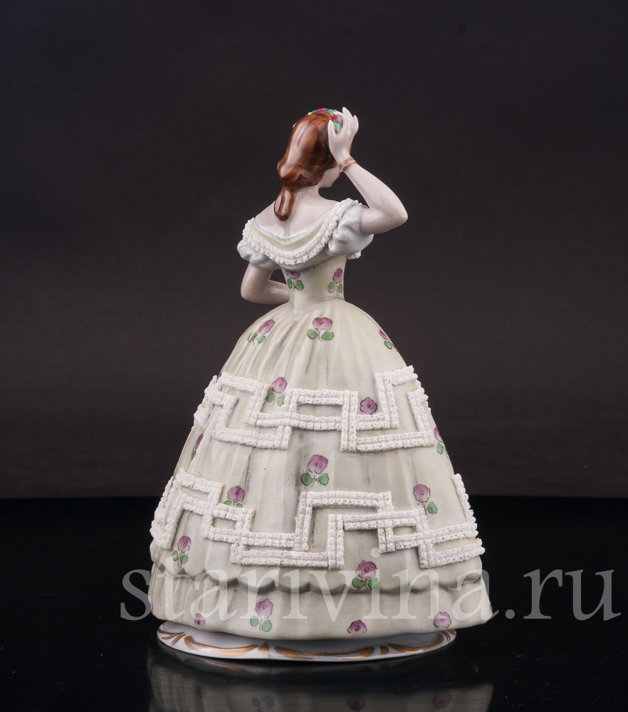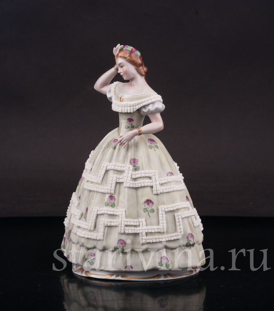 Тонко прорисованная и детализированная фигура отражает сложный стиль одежды и утонченную элегантность давно ушедшей эпохи. Красивая девушка с убранными в элегантную прическу волосами одета в светло-зеленое платье с узором в виде розовых цветов. Поверх широкой юбки нанесены тонкие полоски белого кружева, расположенные свободными геометрическими линиями с прямыми углами. Такое использование кружевных вставок крайне редко можно увидеть в фарфоре, что делает фигуру особенно интересной для коллекционеров.